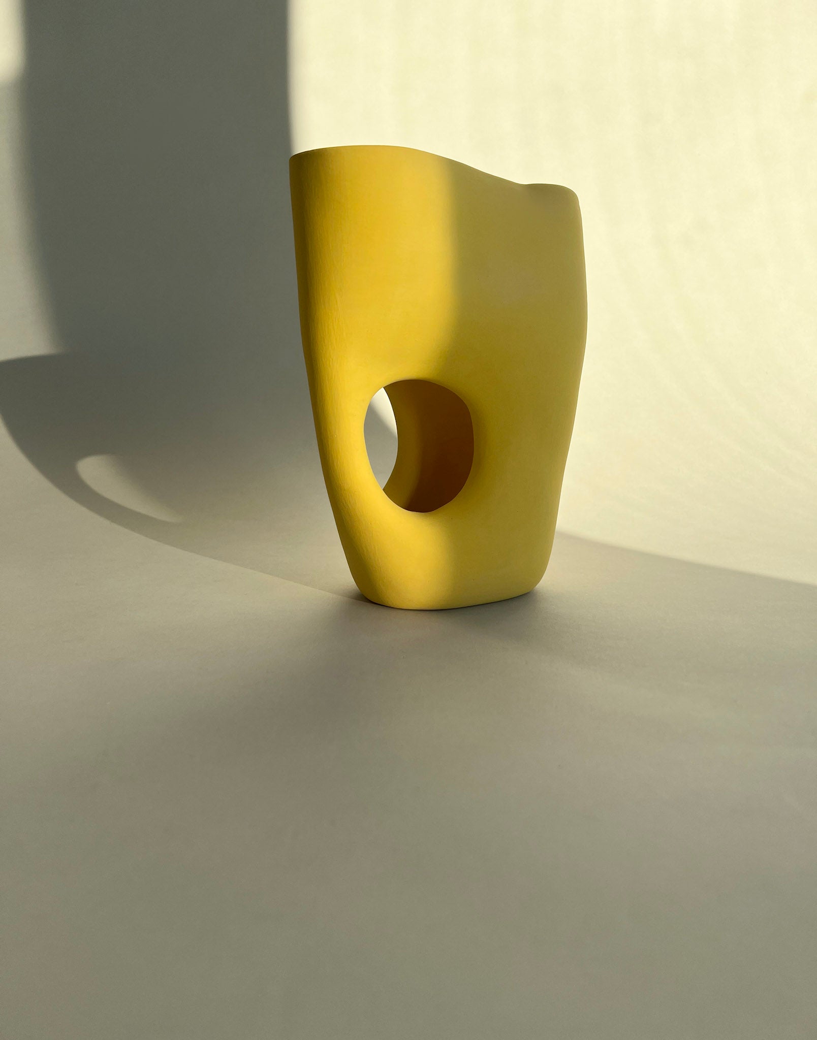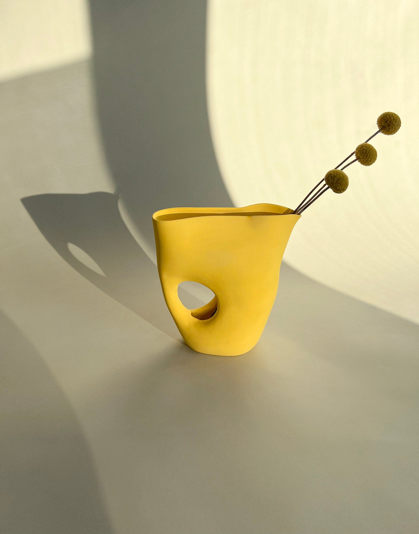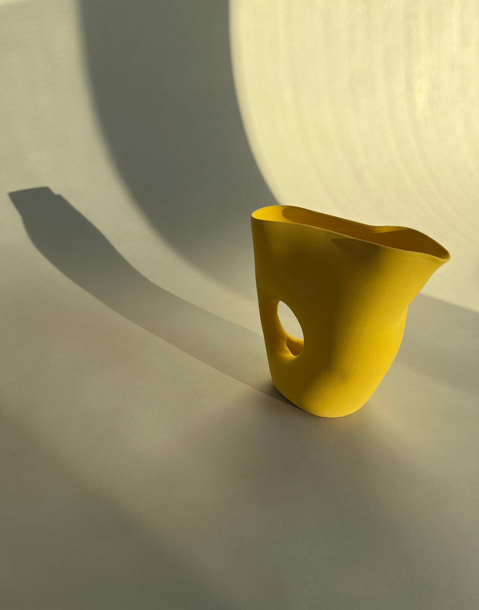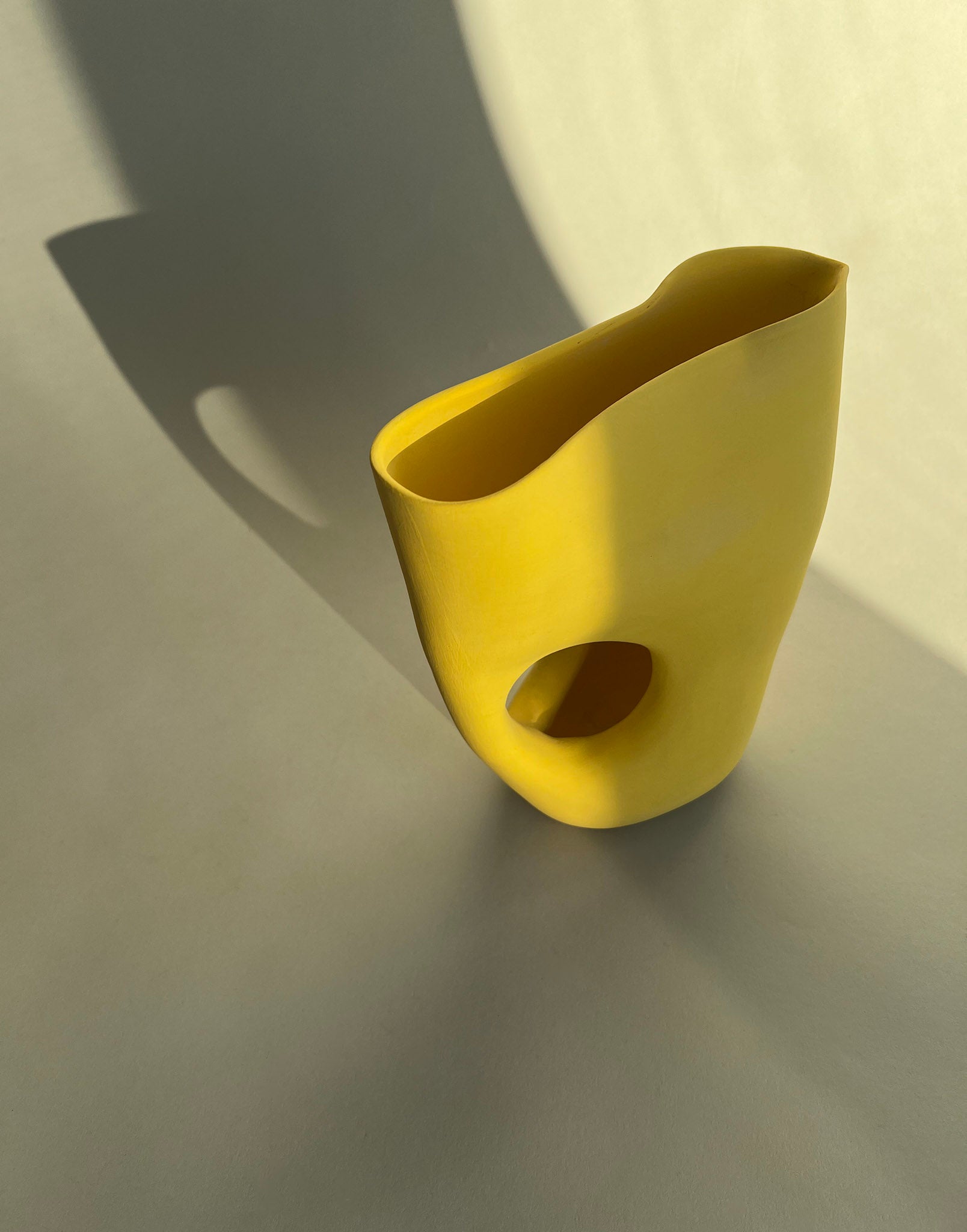 A Modern, organic interpretation of a pitcher, the Orb Vessel 2 has large circular hole sculpted on one side, lending it its name. The vibrant yellow color comes from a Matte underglaze that lends this vessel a surprising modern element.