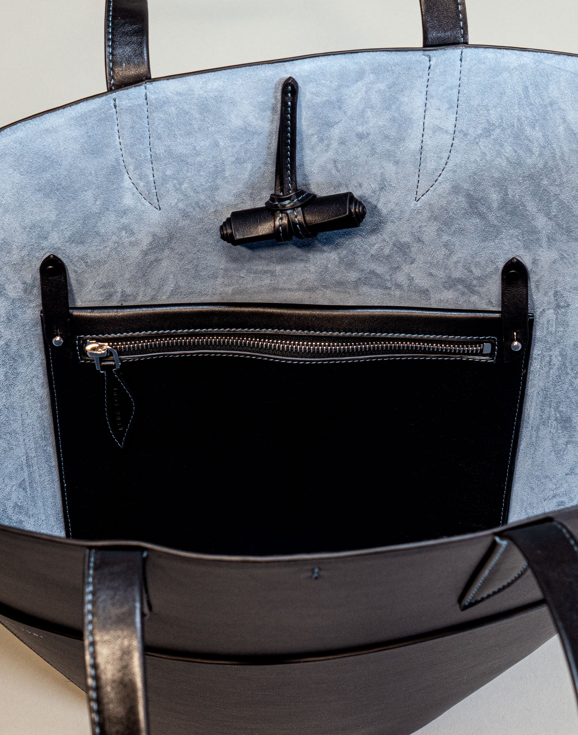 powder blue suede on the inside, and contrast heavy stitching.