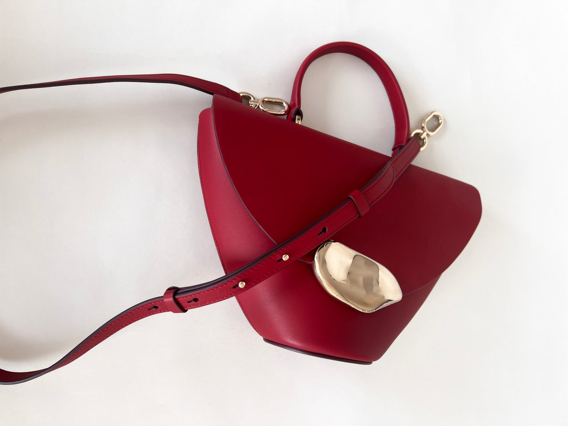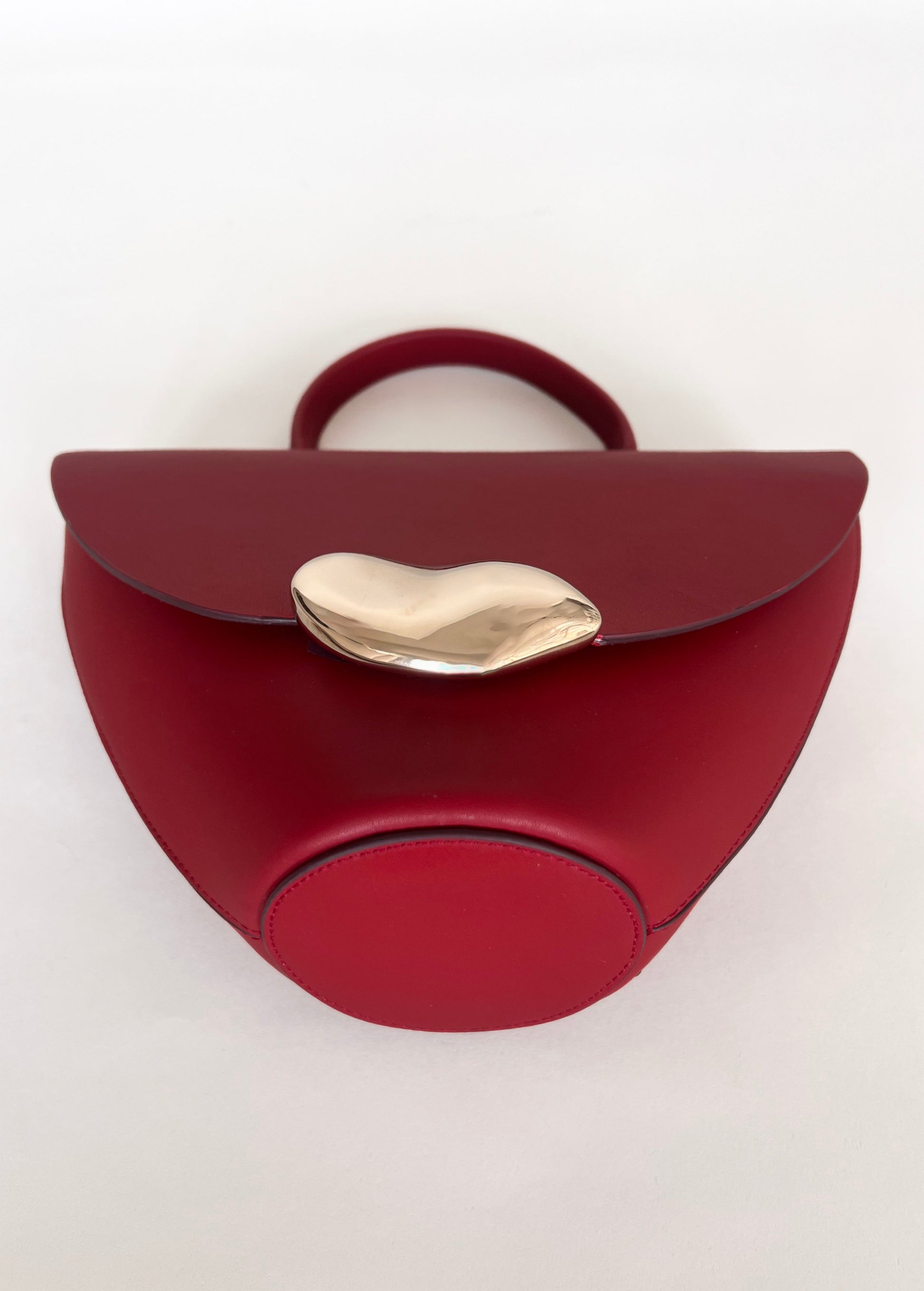 The Orb is a petit handbag featuring a circular base,curved body and rounded top flap. The elegant silhouette connects to a brass top handle and can also be worn effortlessly as a crossbody.The Orb is adorned with a sculptural,hand-carved brass object that functions as a closure.