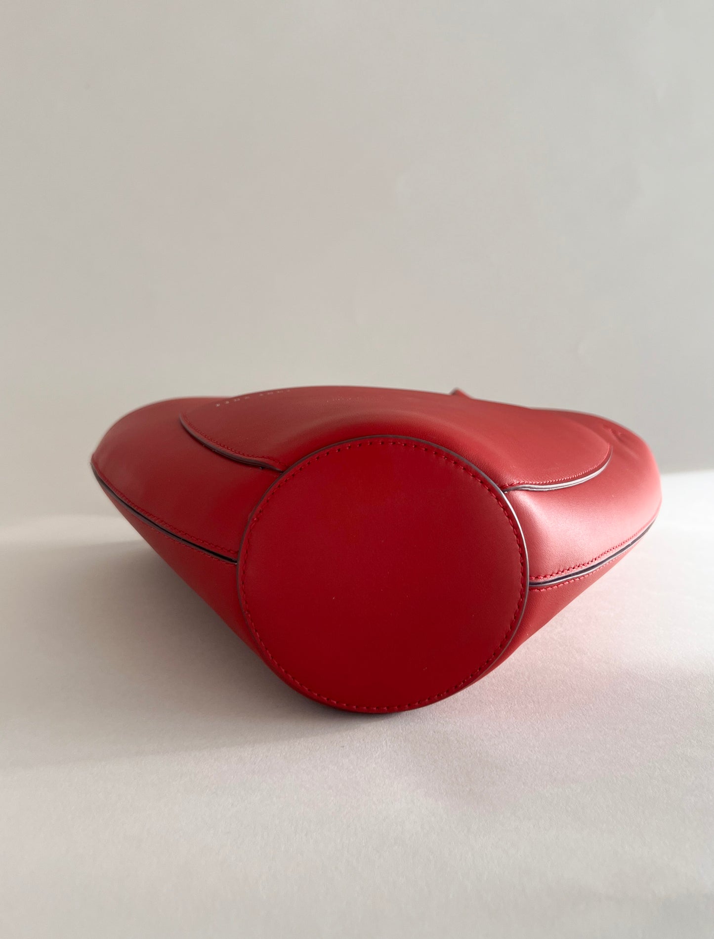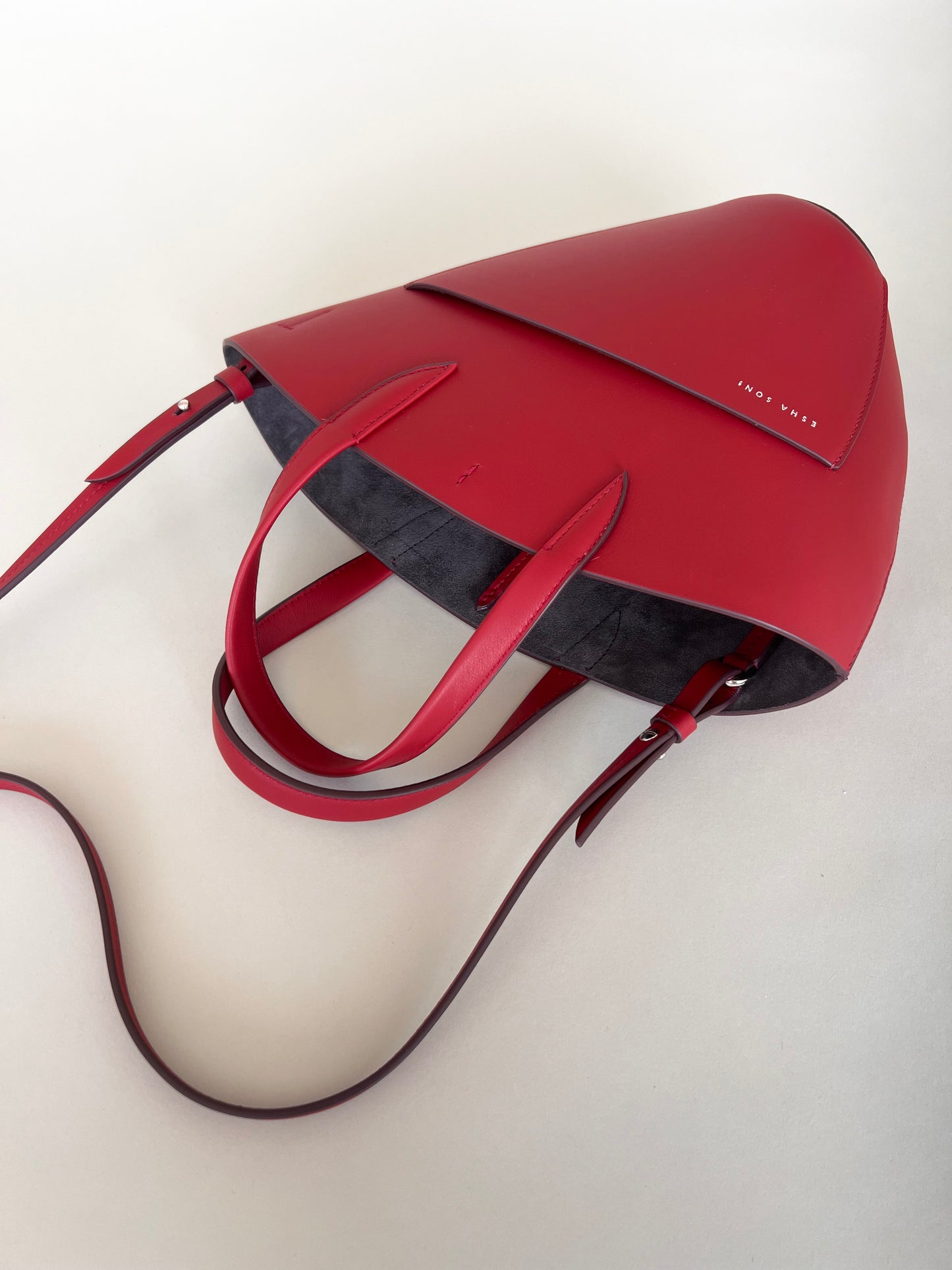 Moulded on a wooden form this style embodies the sculptural language that is pivotal to Collection 101. Fully bonded to fine Italian suede, this mini tote can be worn as a top handle or over the shoulder with the detachable crossbody strap. The Asymmetric curve of the top edge lends this simple yet beautiful tote a poetic feel.