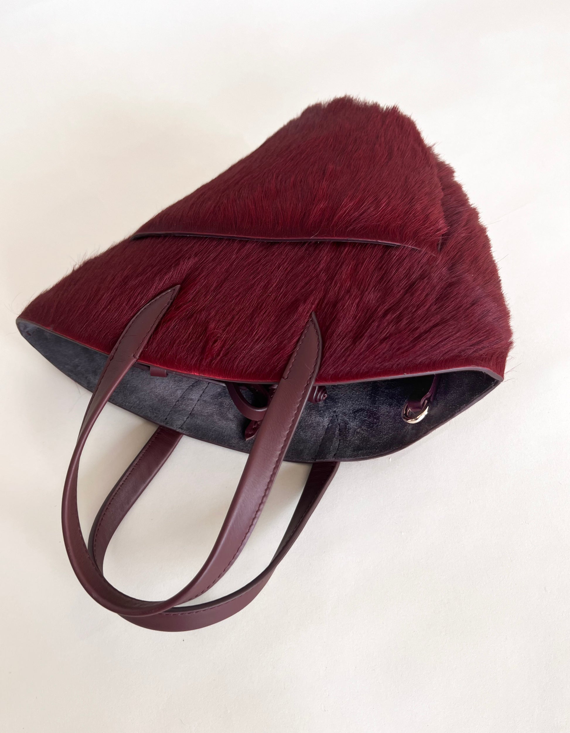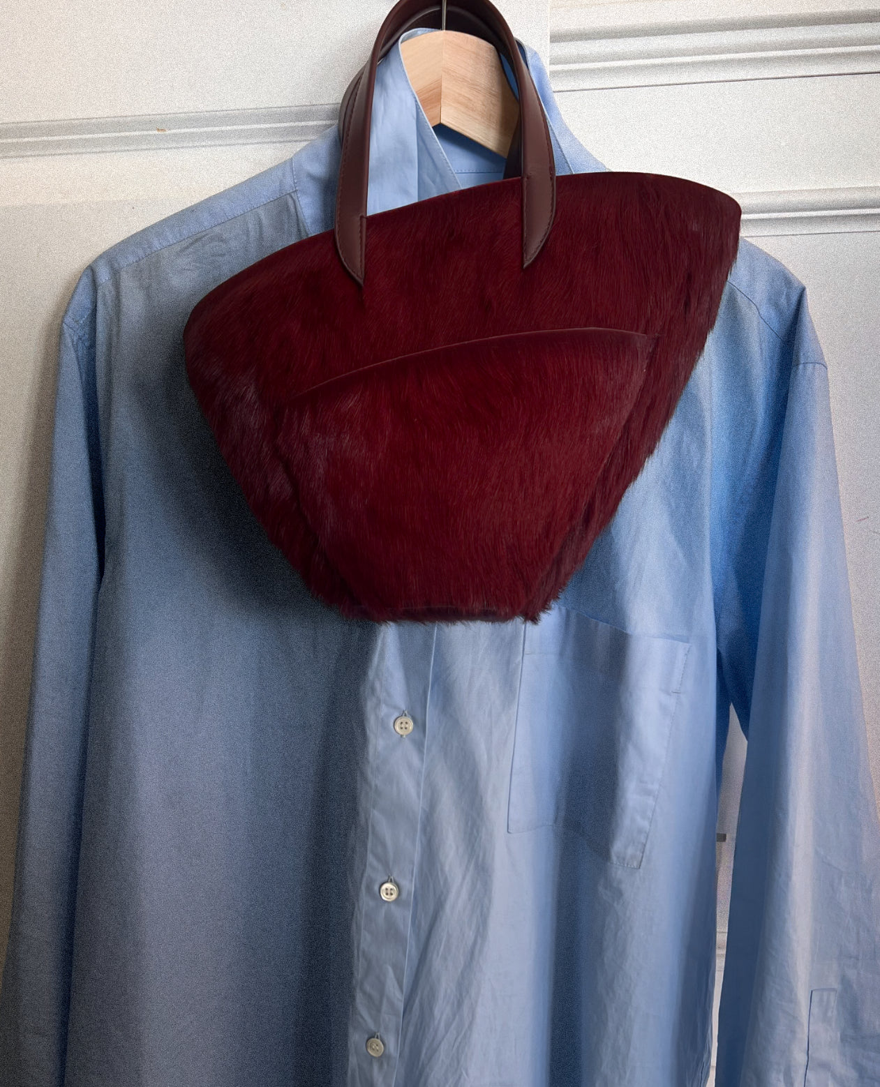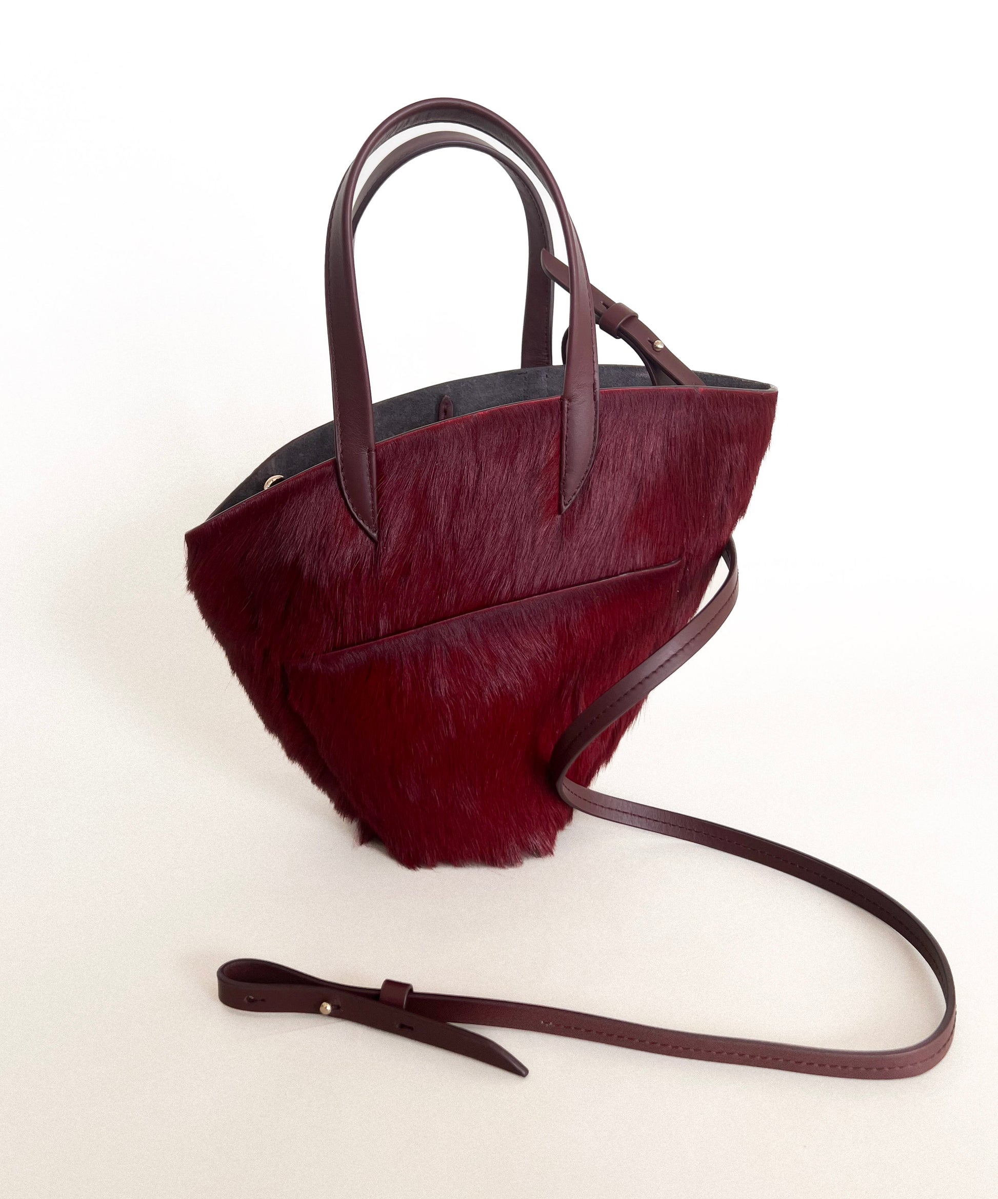 Moulded on a wooden form this style embodies the sculptural language that is pivotal to Collection 101. Fully bonded to fine Italian suede, this mini tote can be worn as a top handle or over the shoulder with the detachable crossbody strap. The Asymmetric curve of the top edge lends this simple yet beautiful tote a poetic feel.