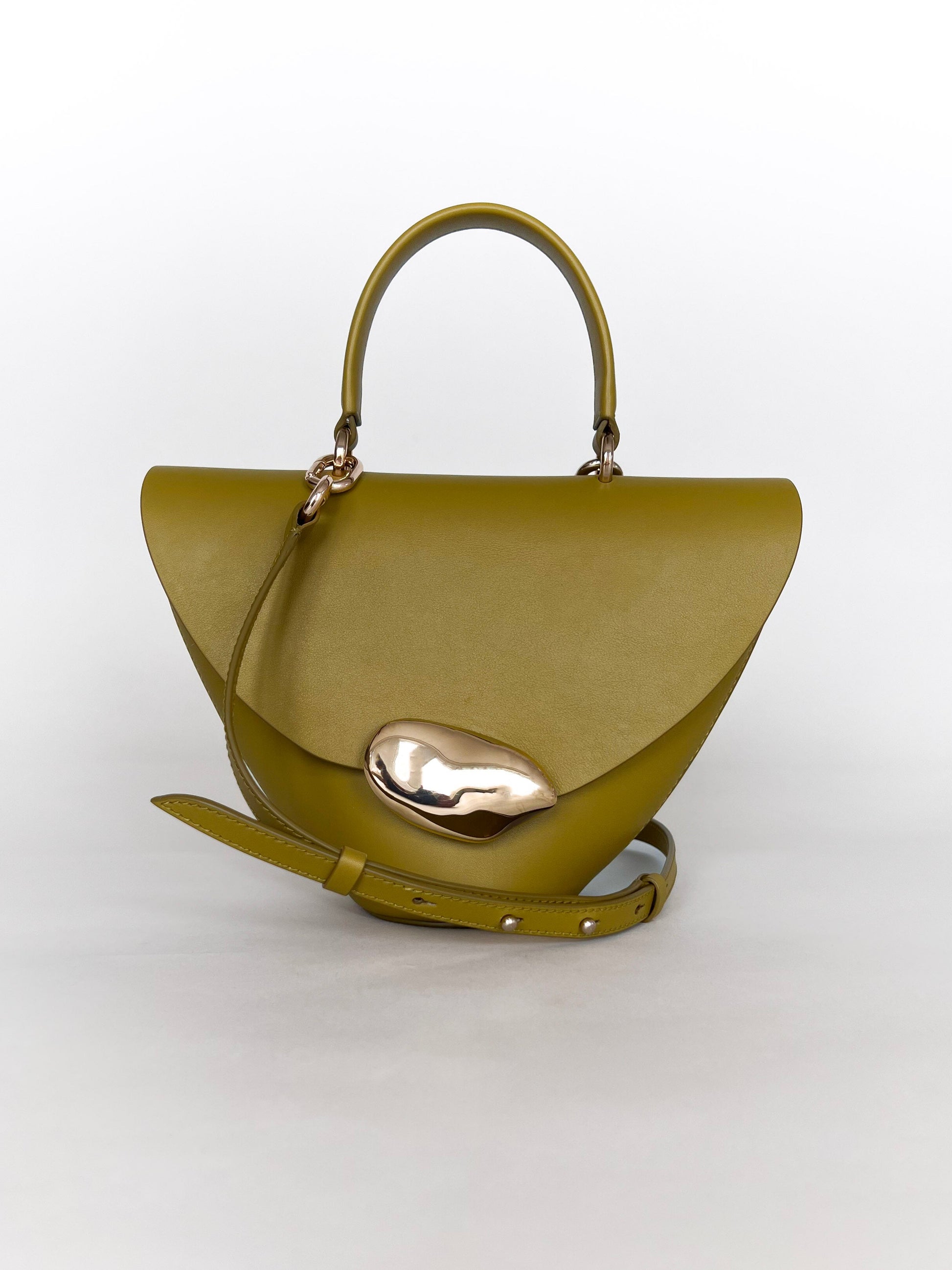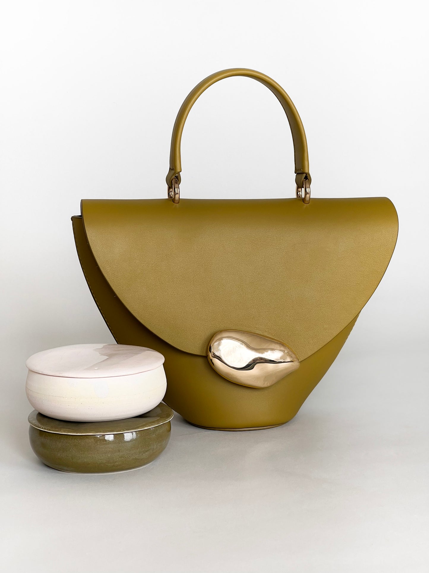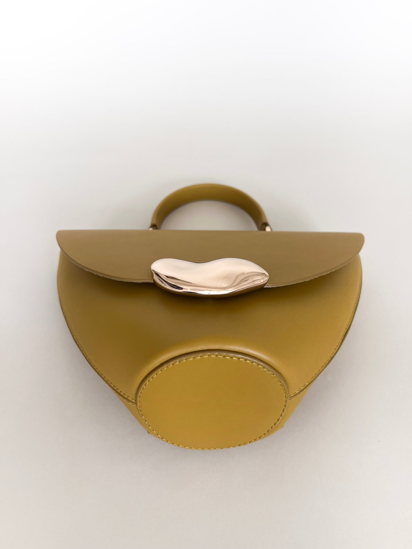 The Orb is a petit handbag featuring a circular base,curved body and rounded top flap. The elegant silhouette connects to a brass top handle and can also be worn effortlessly as a crossbody.The Orb is adorned with a sculptural,hand-carved brass object that functions as a closure.