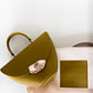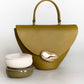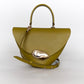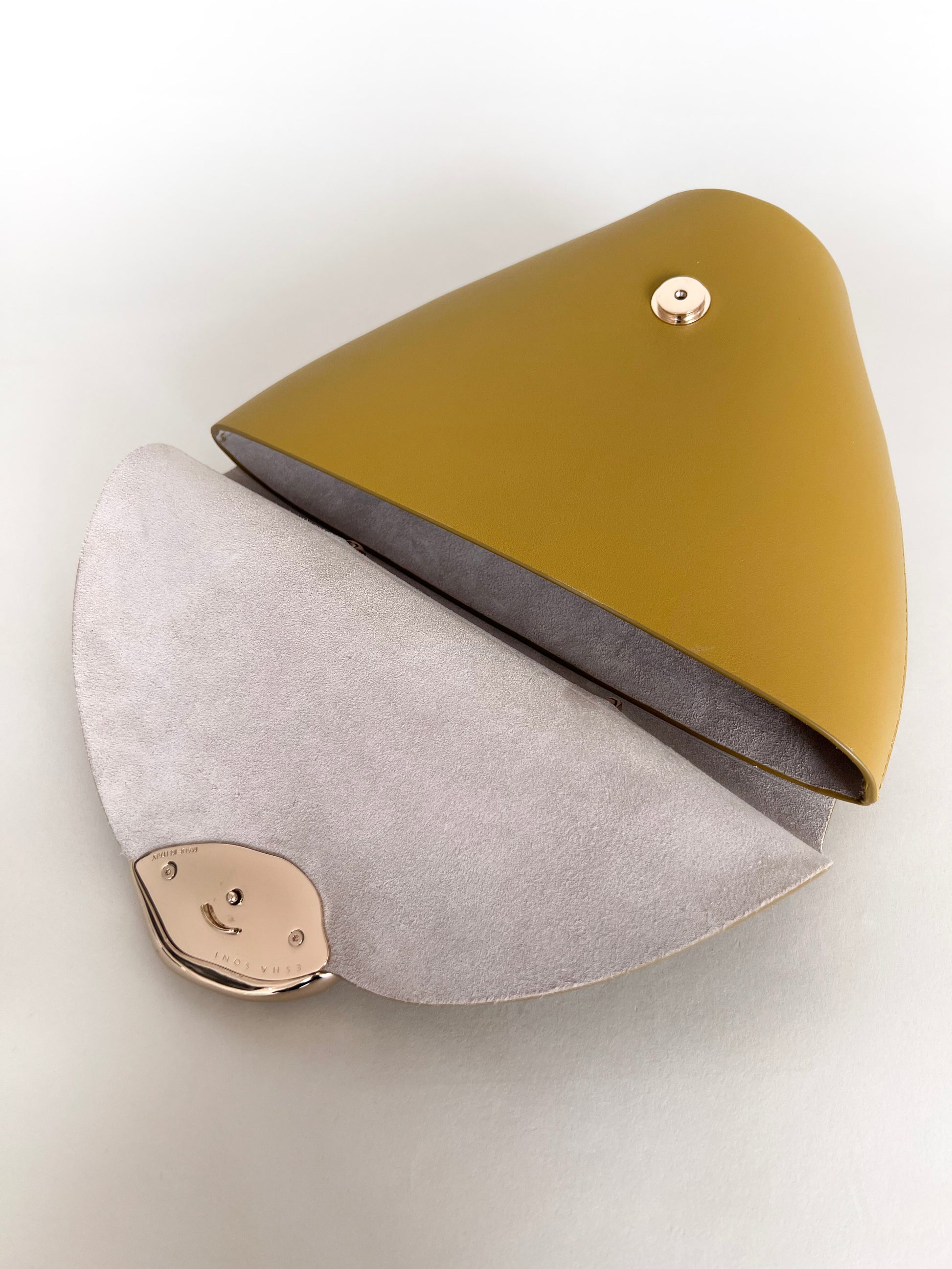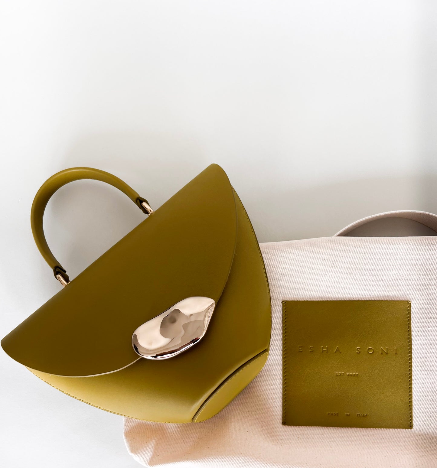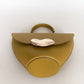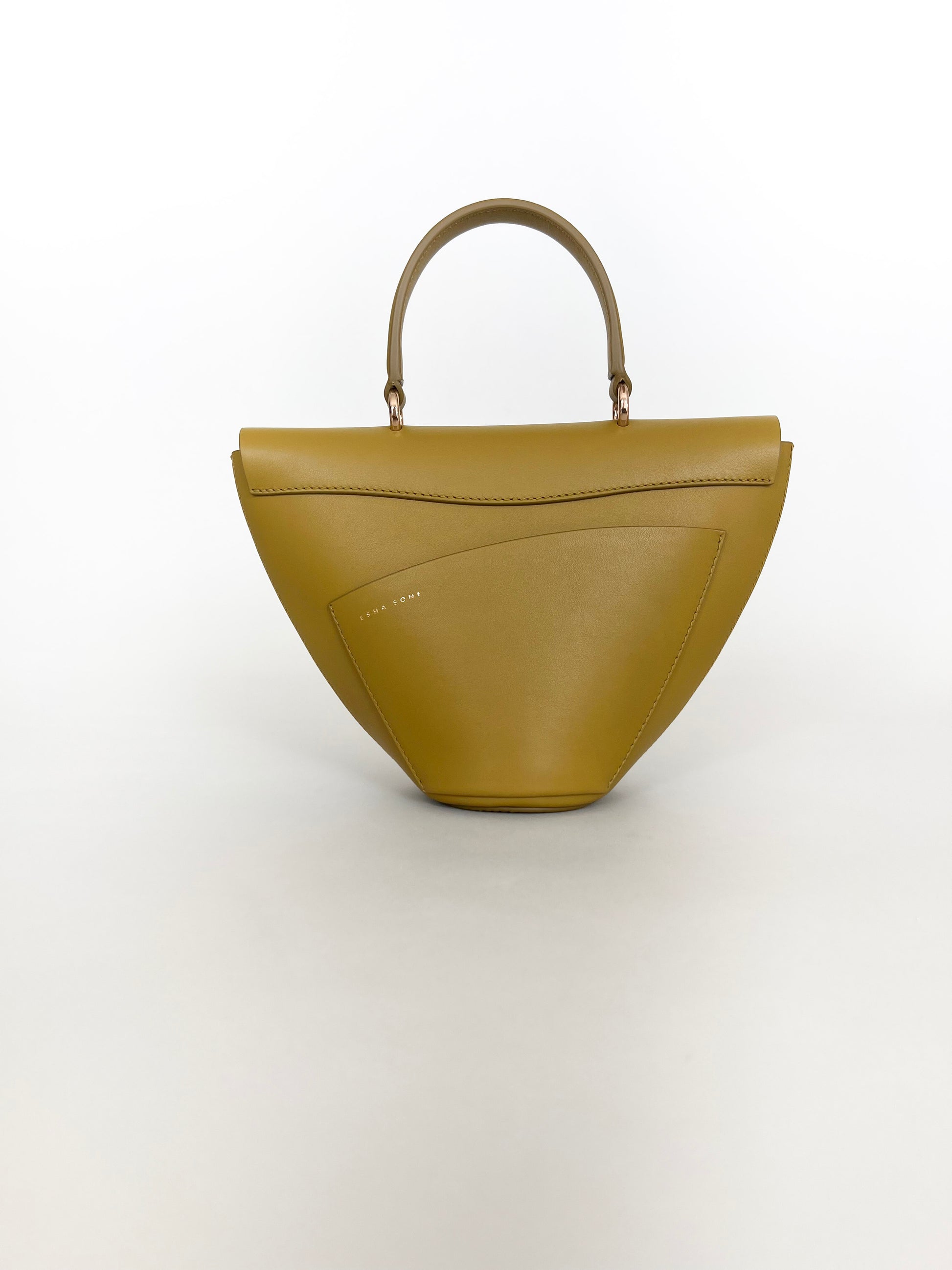The Orb is a petit handbag featuring a circular base,curved body and rounded top flap. The elegant silhouette connects to a brass top handle and can also be worn effortlessly as a crossbody.The Orb is adorned with a sculptural,hand-carved brass object that functions as a closure.