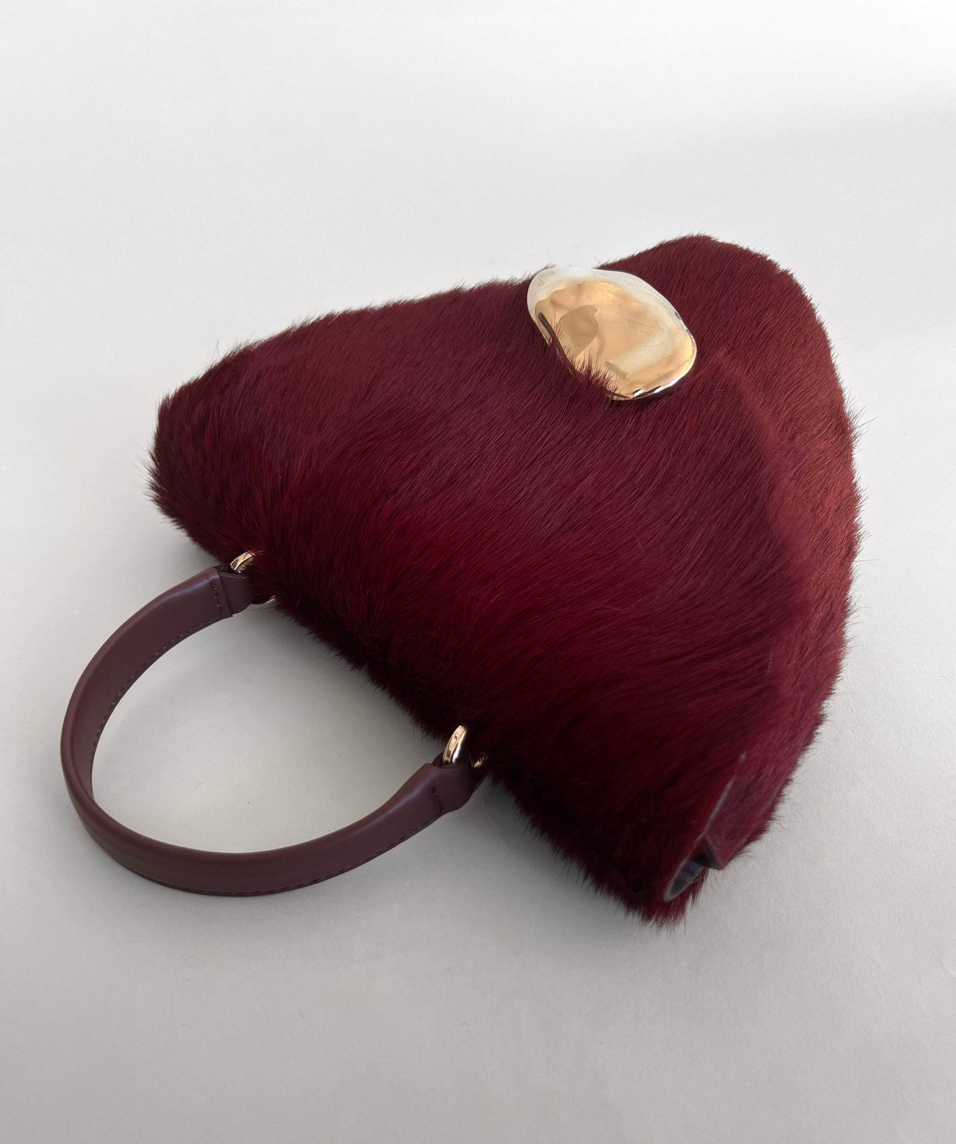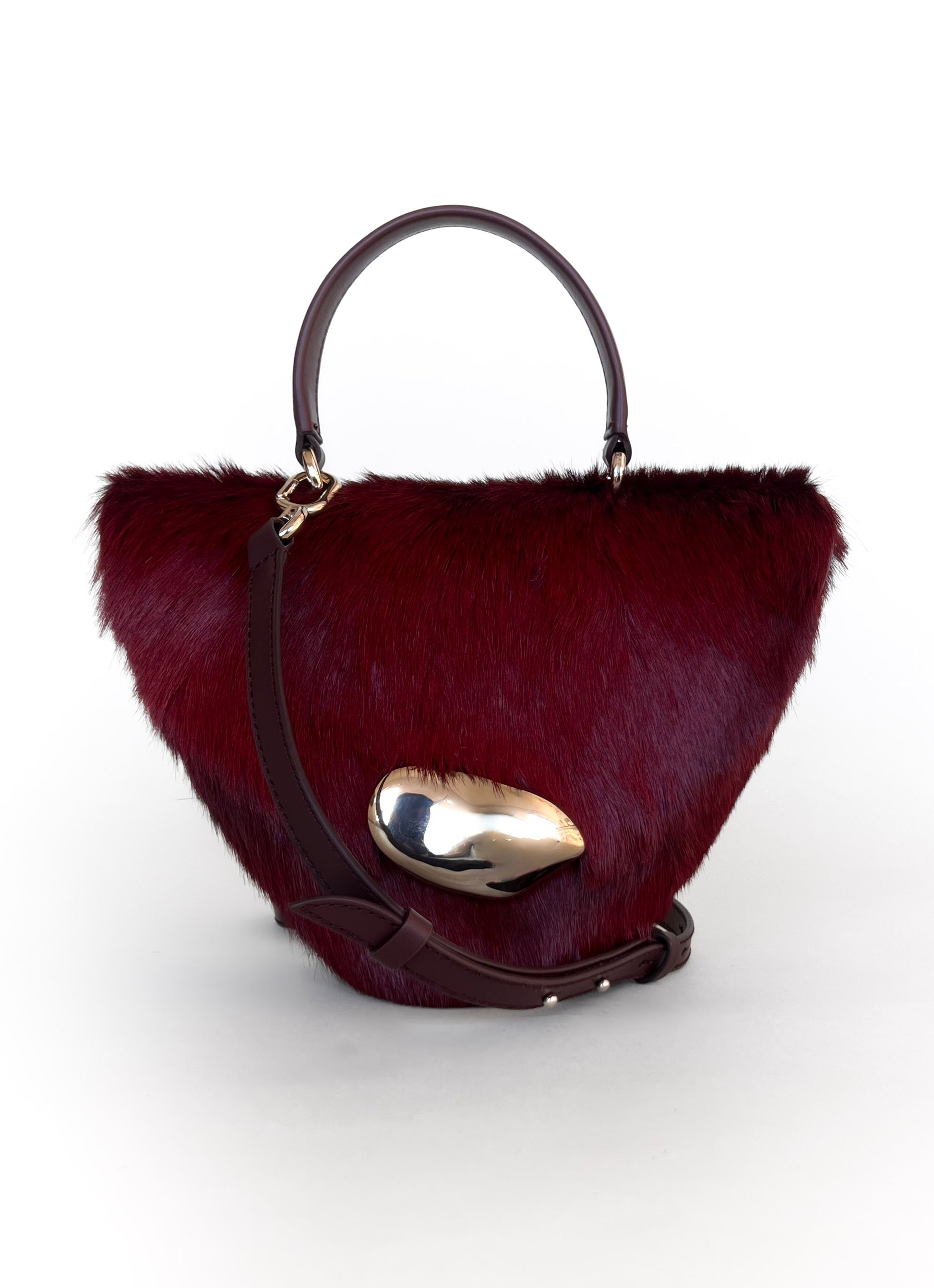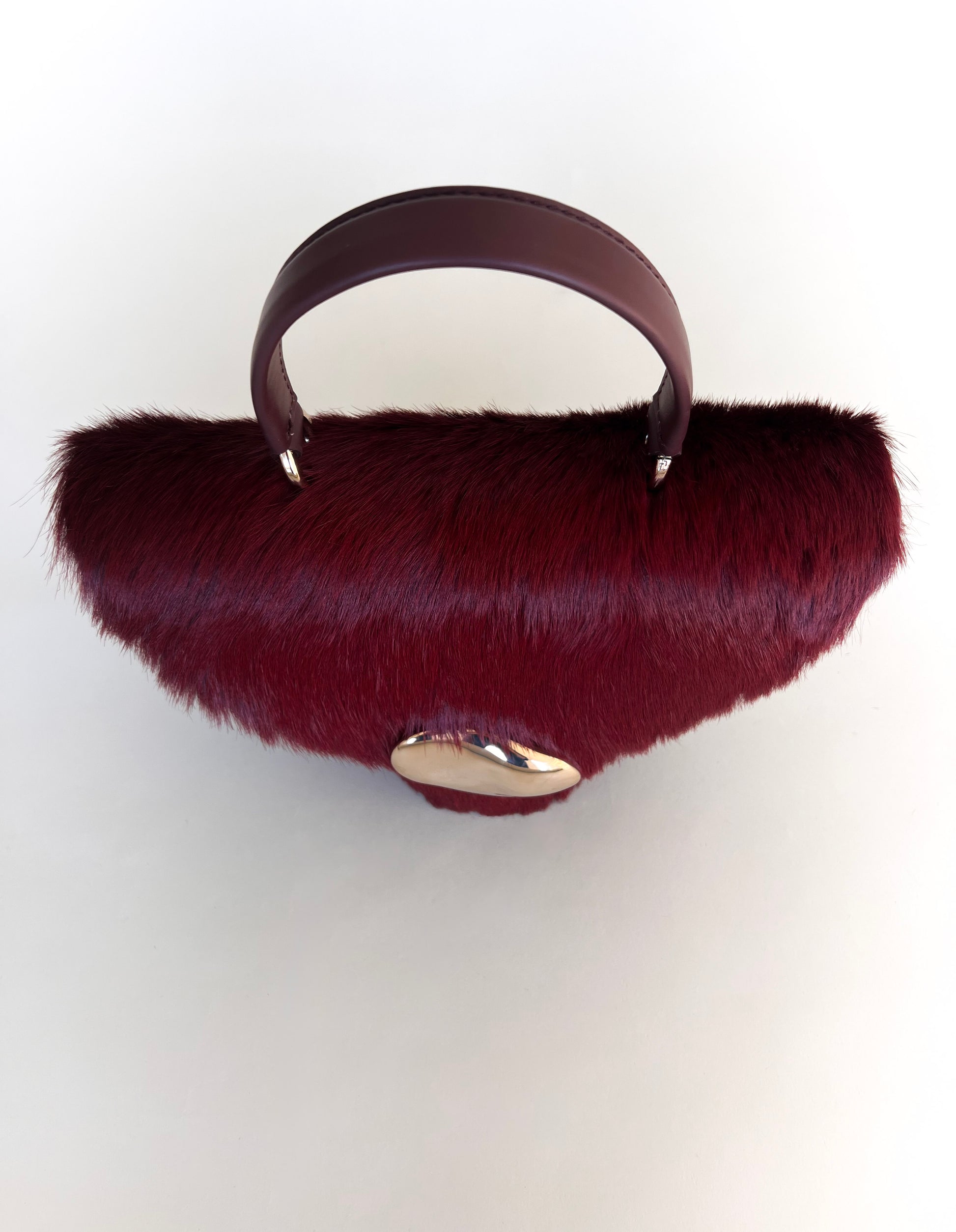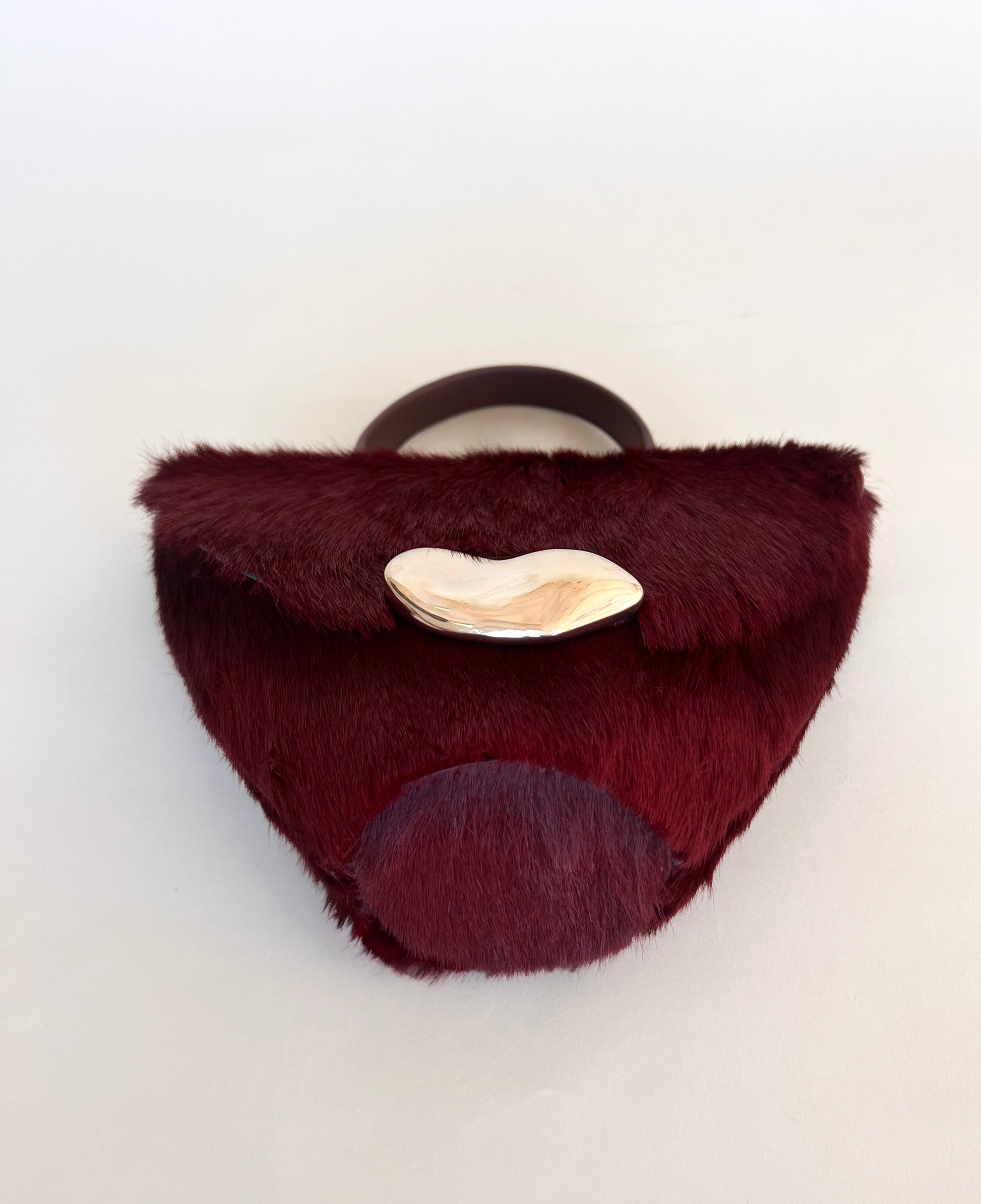 The Orb is a petit handbag featuring a circular base,curved body and rounded top flap. The elegant silhouette connects to a brass top handle and can also be worn effortlessly as a crossbody.The Orb is adorned with a sculptural,hand-carved brass object that functions as a closure.