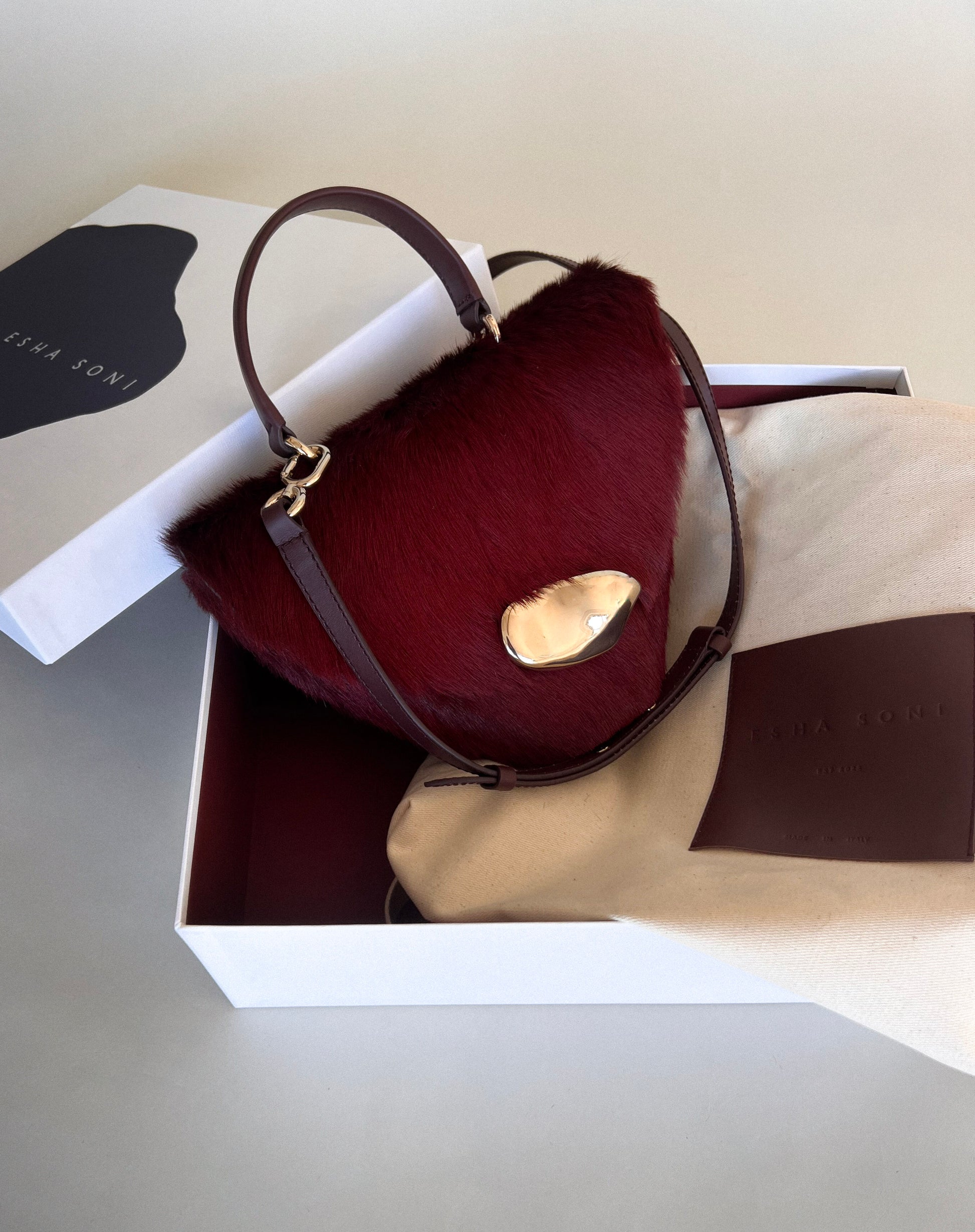 All hardware pieces are custom made in brass and plated with 0.30 microns of gold. Removable crossbody strap
