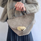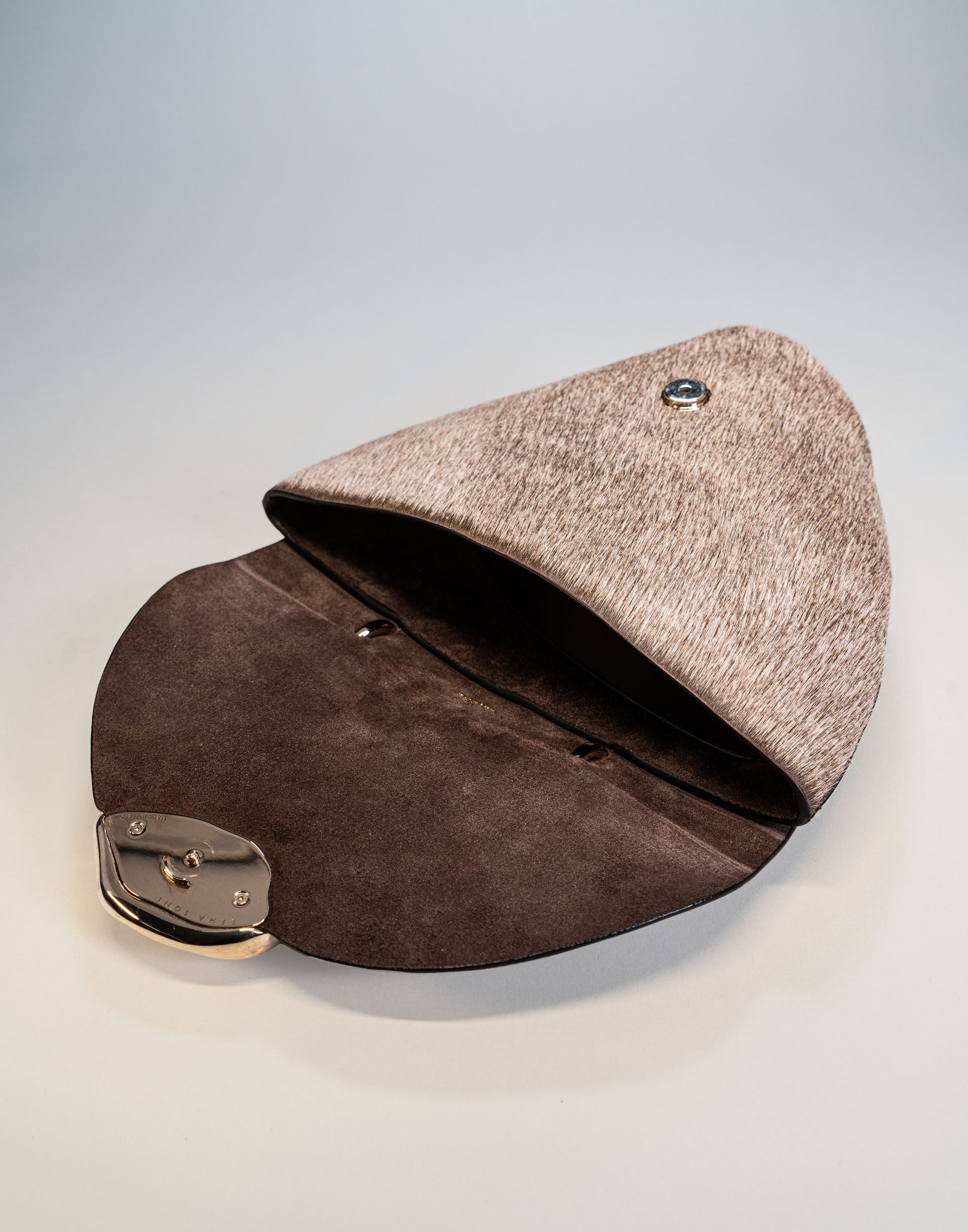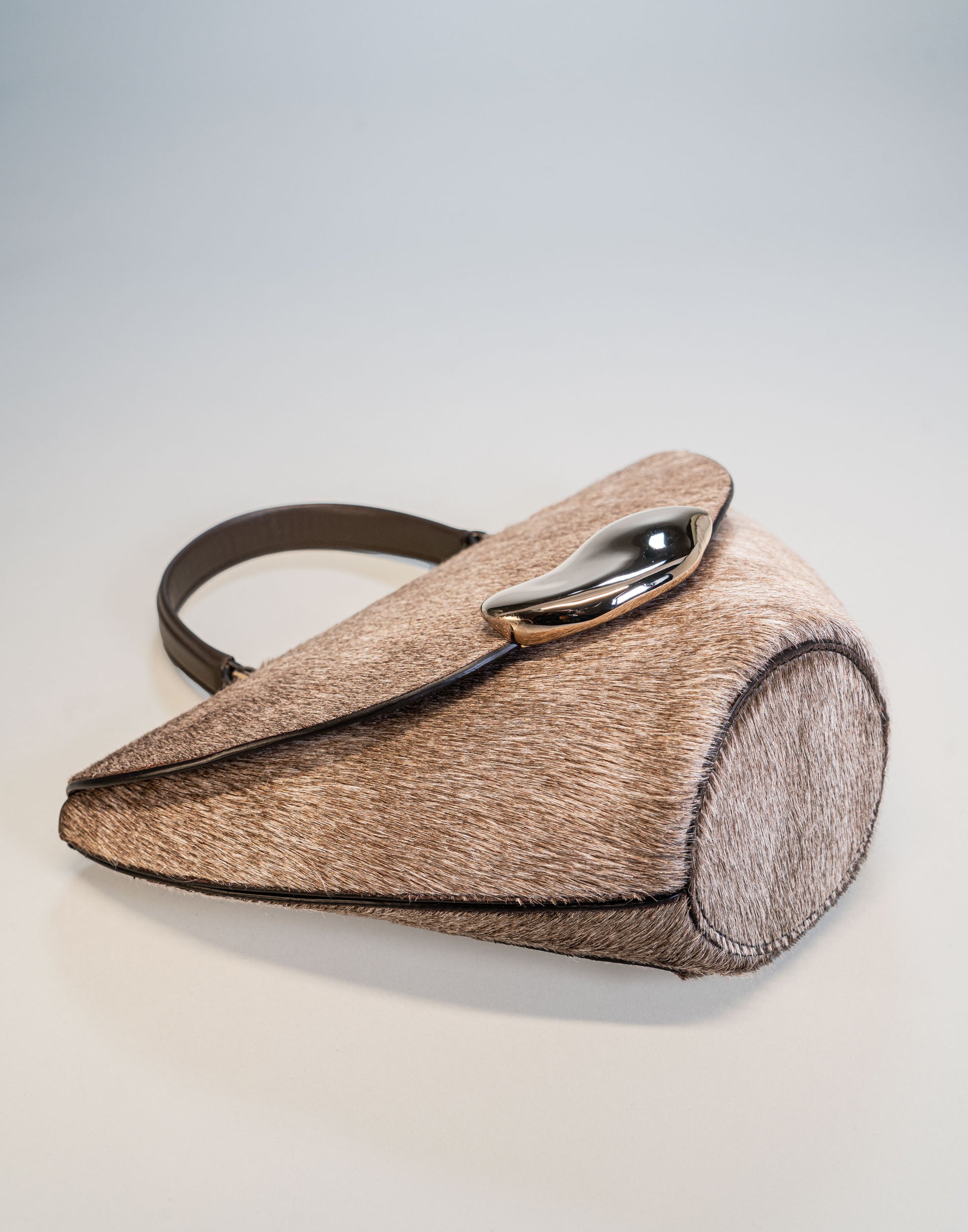 The Orb is a petit handbag featuring a circular base,curved body and rounded top flap. The elegant silhouette connects to a brass top handle and can also be worn effortlessly as a crossbody.The Orb is adorned with a sculptural,hand-carved brass object that functions as a closure.