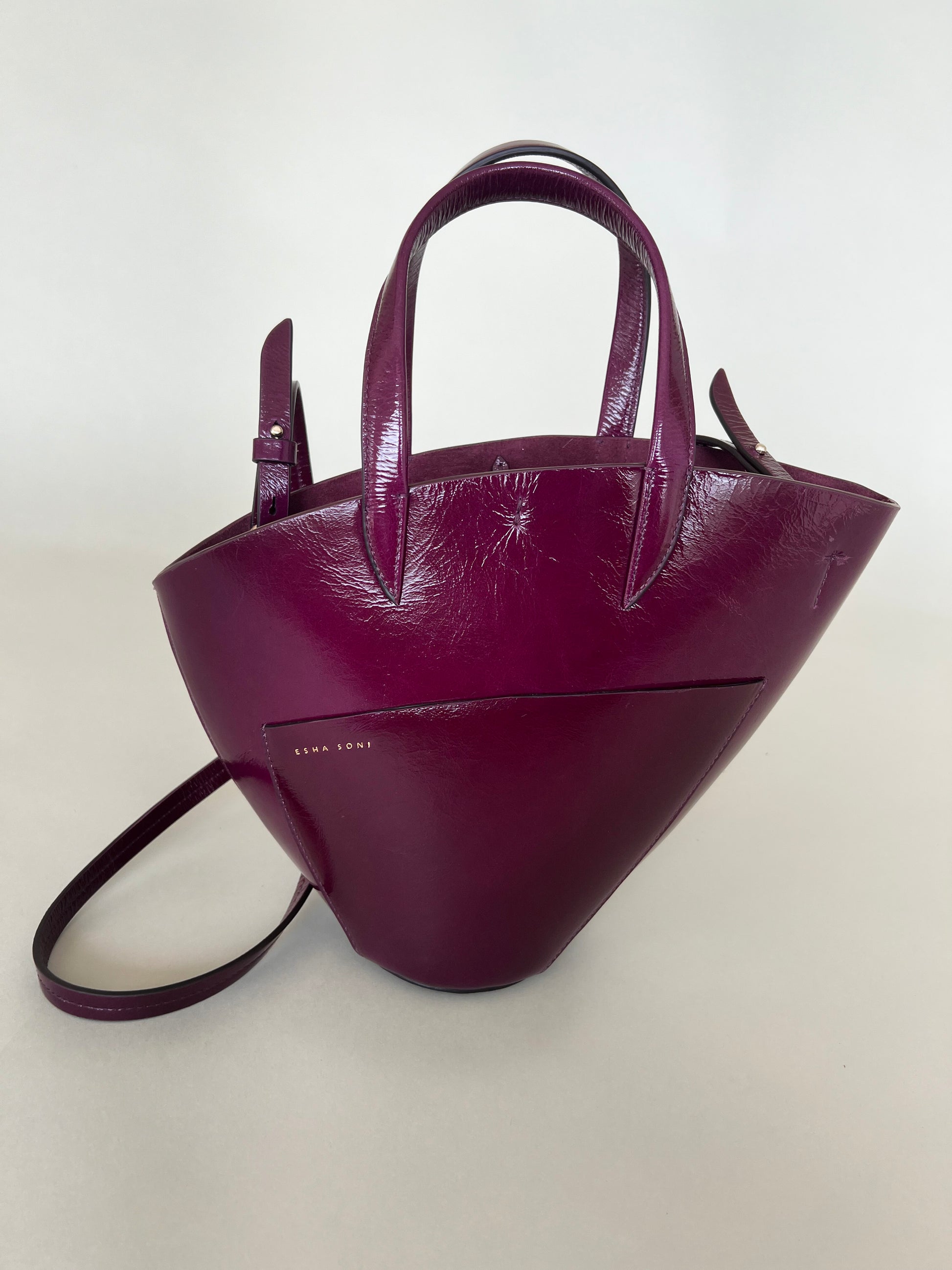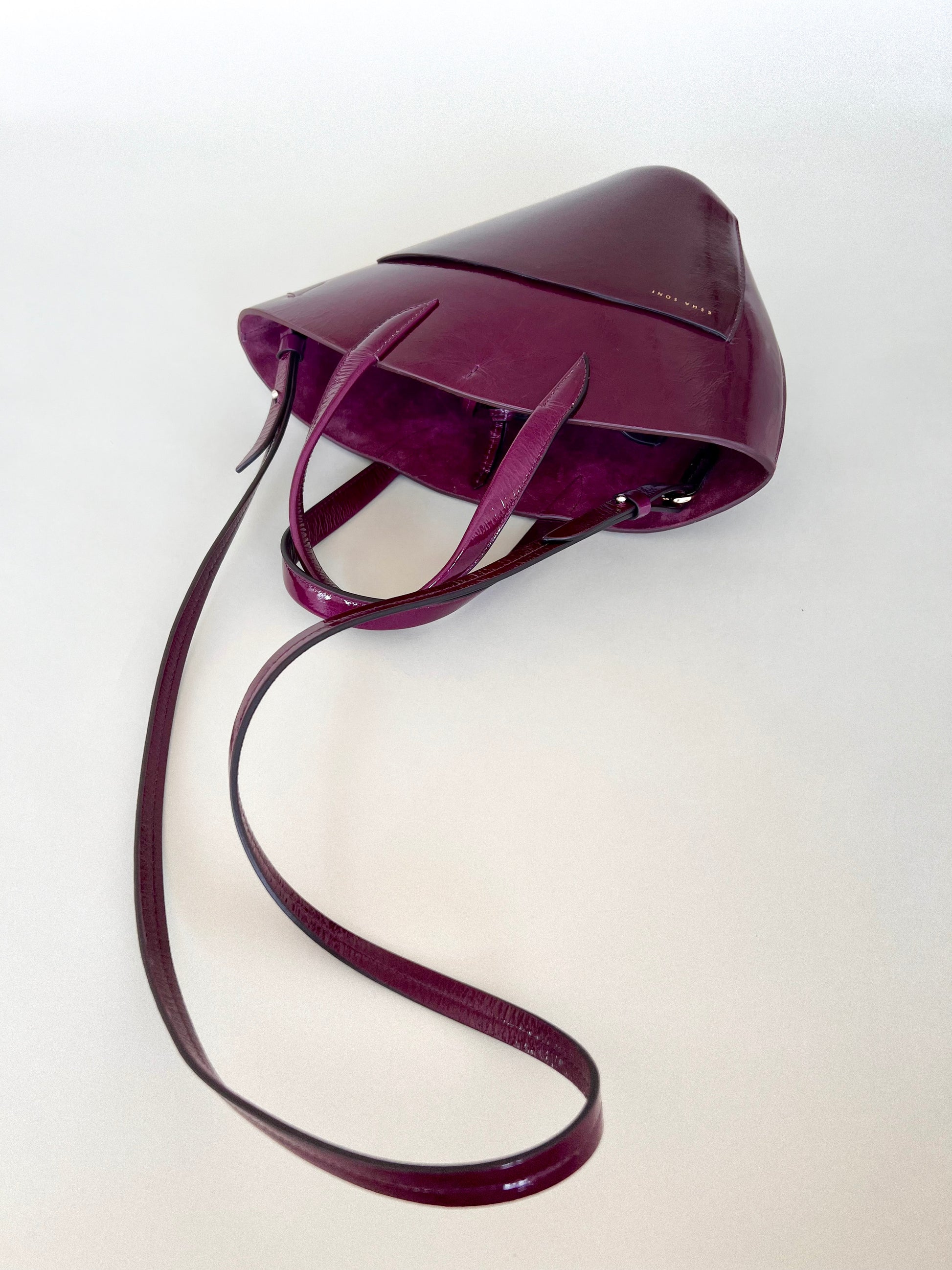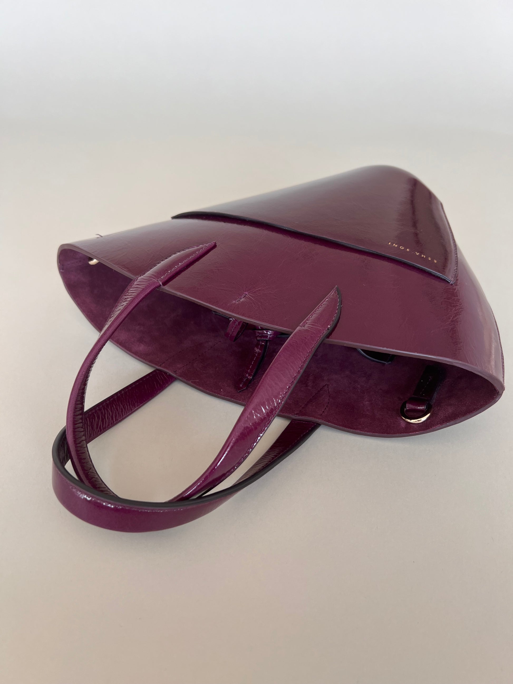Moulded on a wooden form this style embodies the sculptural language that is pivotal to Collection 101. Fully bonded to fine Italian suede, this mini tote can be worn as a top handle or over the shoulder with the detachable crossbody strap. The Asymmetric curve of the top edge lends this simple yet beautiful tote a poetic feel.