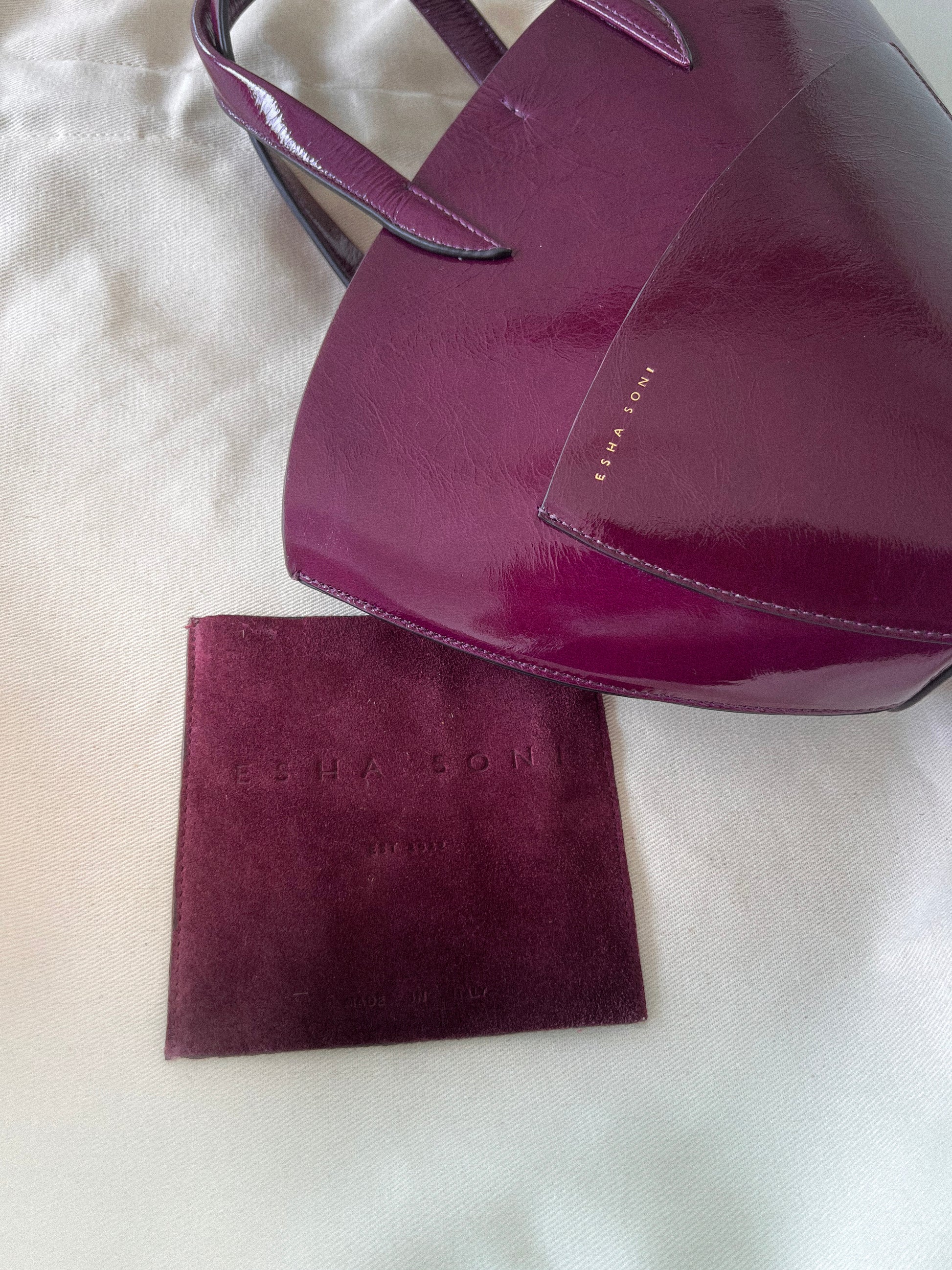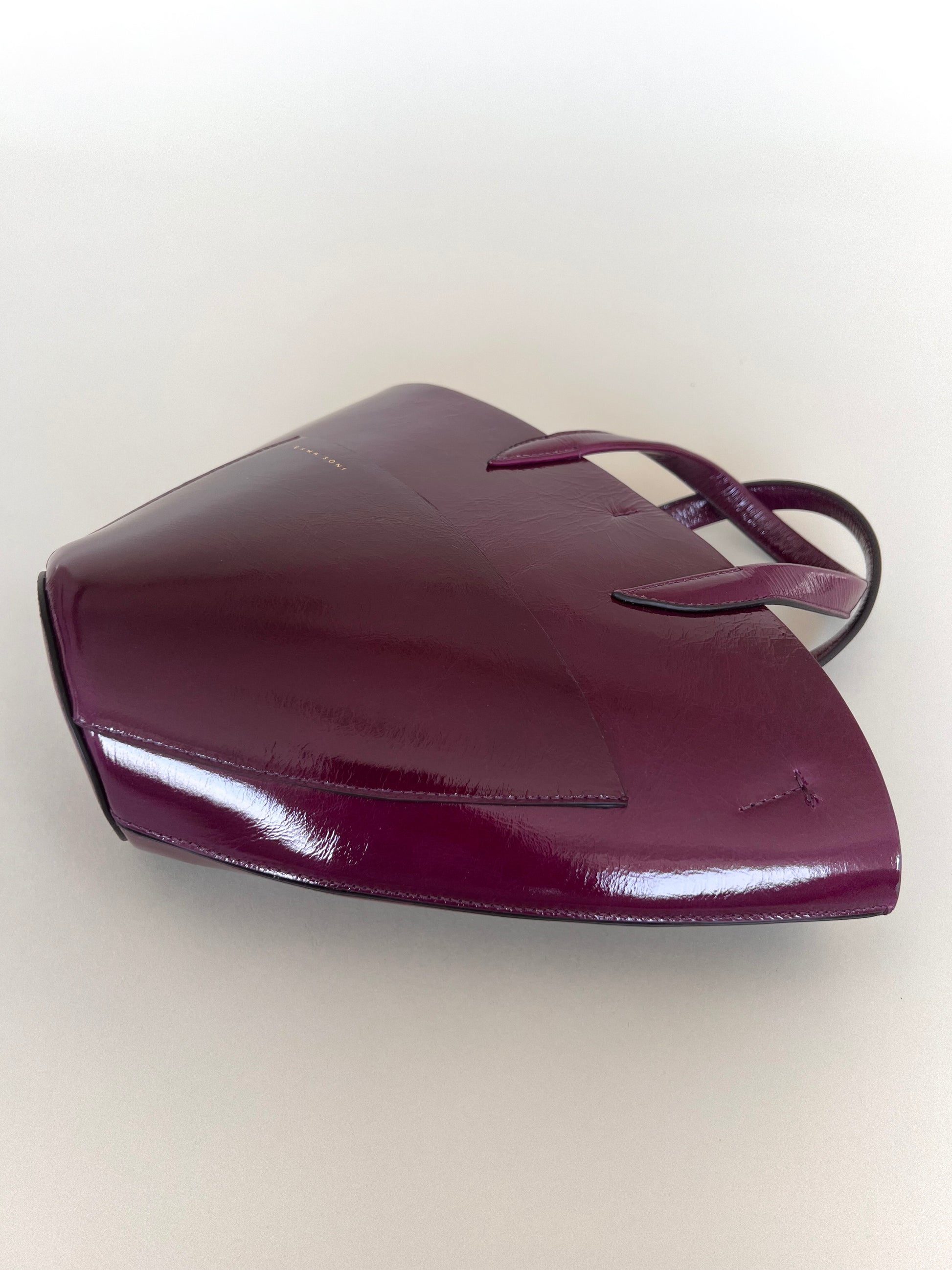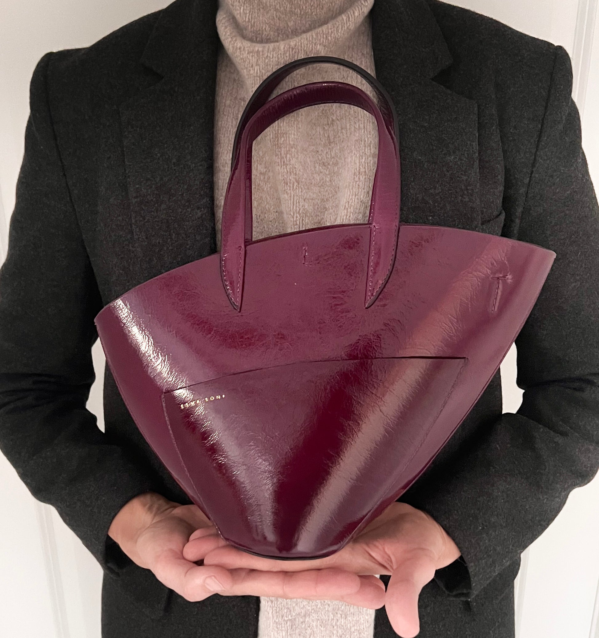 Moulded on a wooden form this style embodies the sculptural language that is pivotal to Collection 101. Fully bonded to fine Italian suede, this mini tote can be worn as a top handle or over the shoulder with the detachable crossbody strap. The Asymmetric curve of the top edge lends this simple yet beautiful tote a poetic feel.