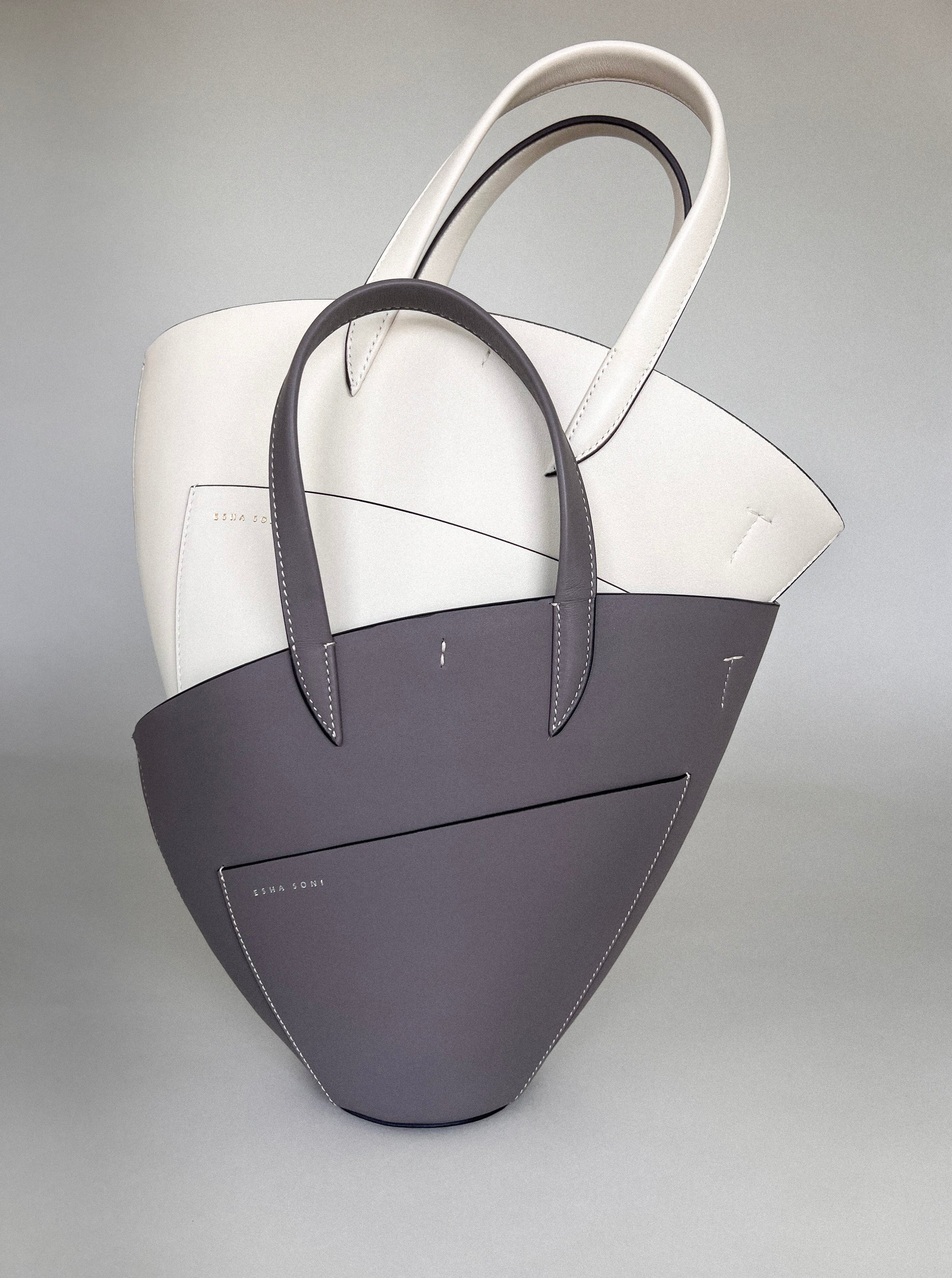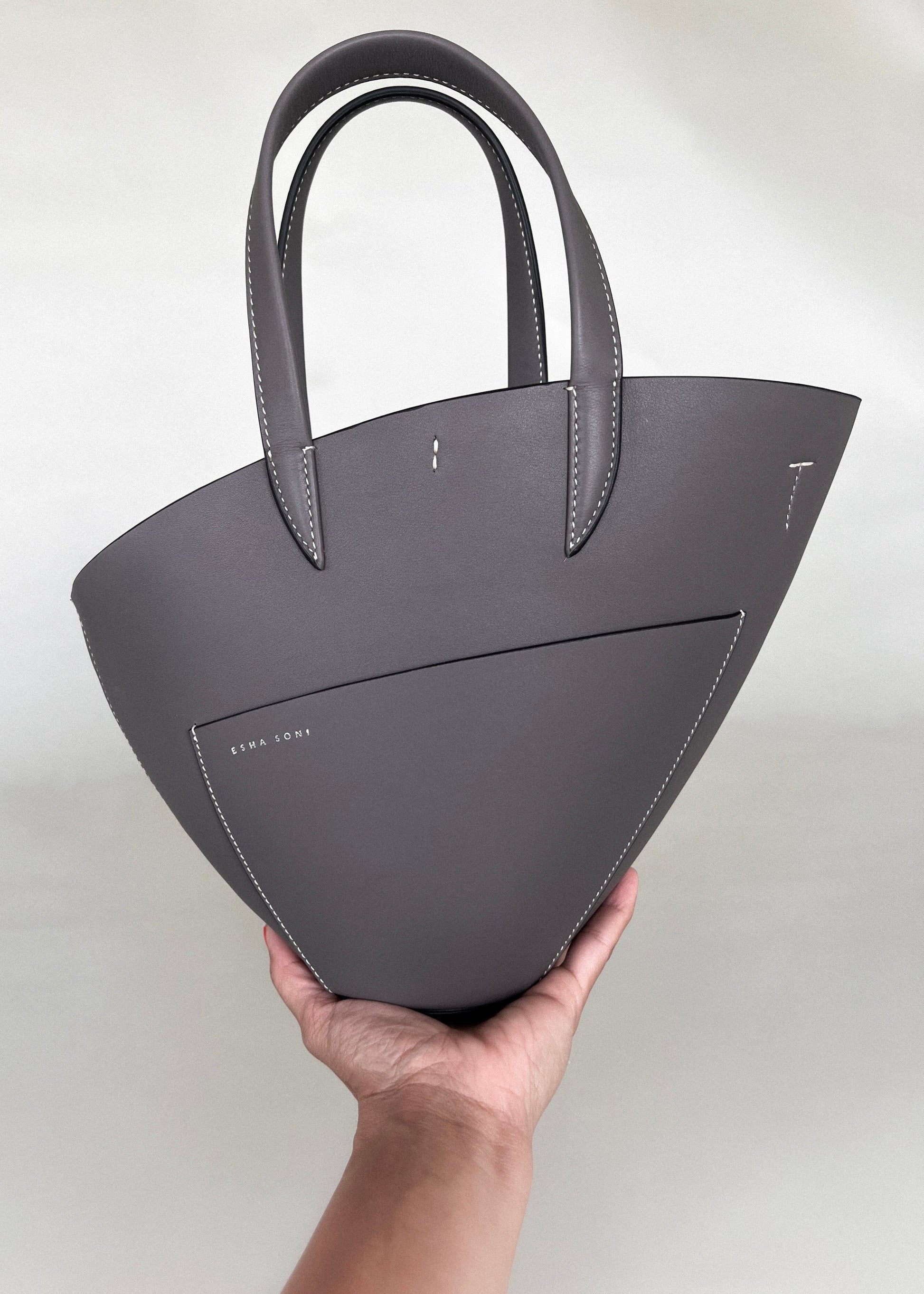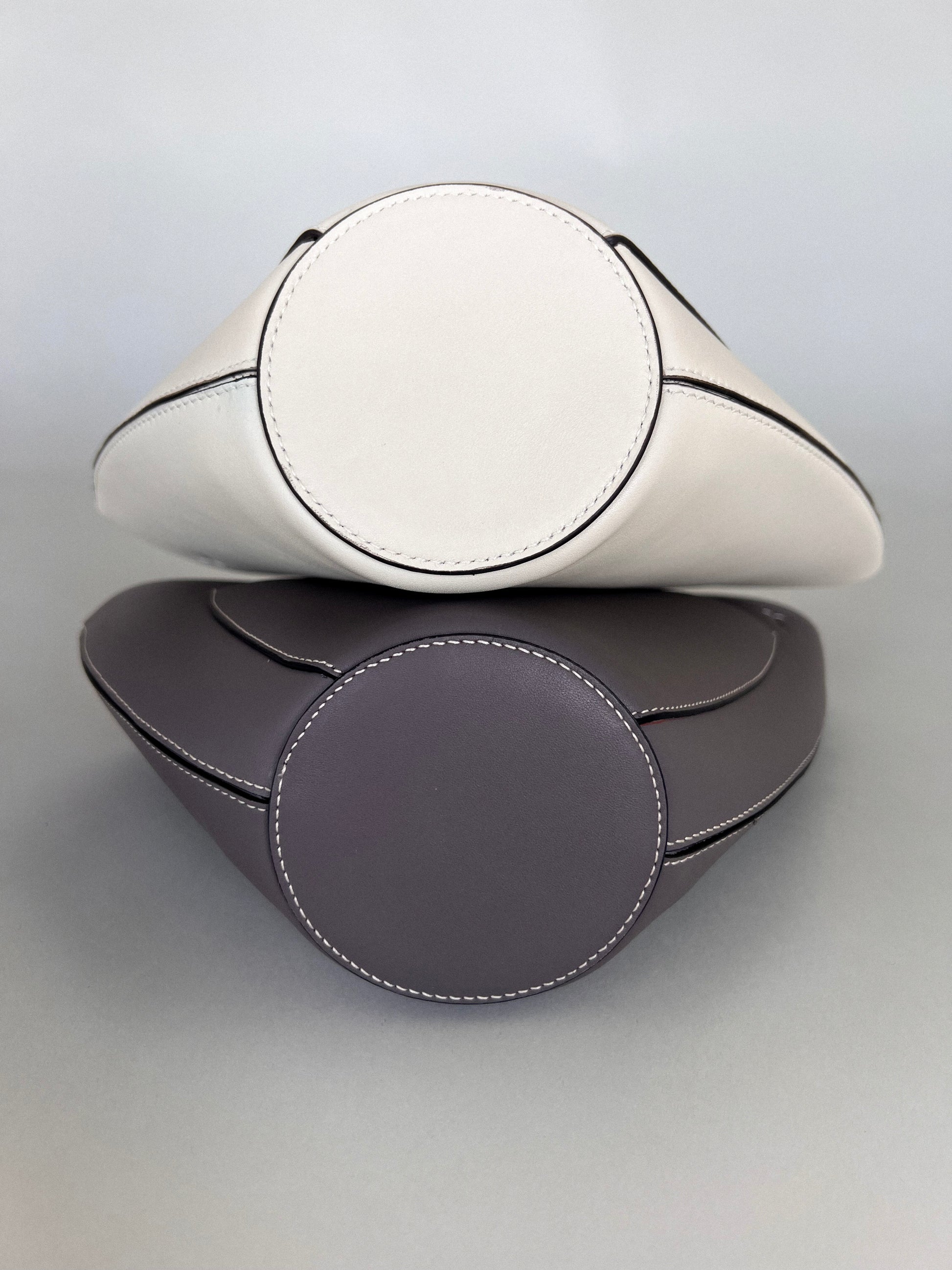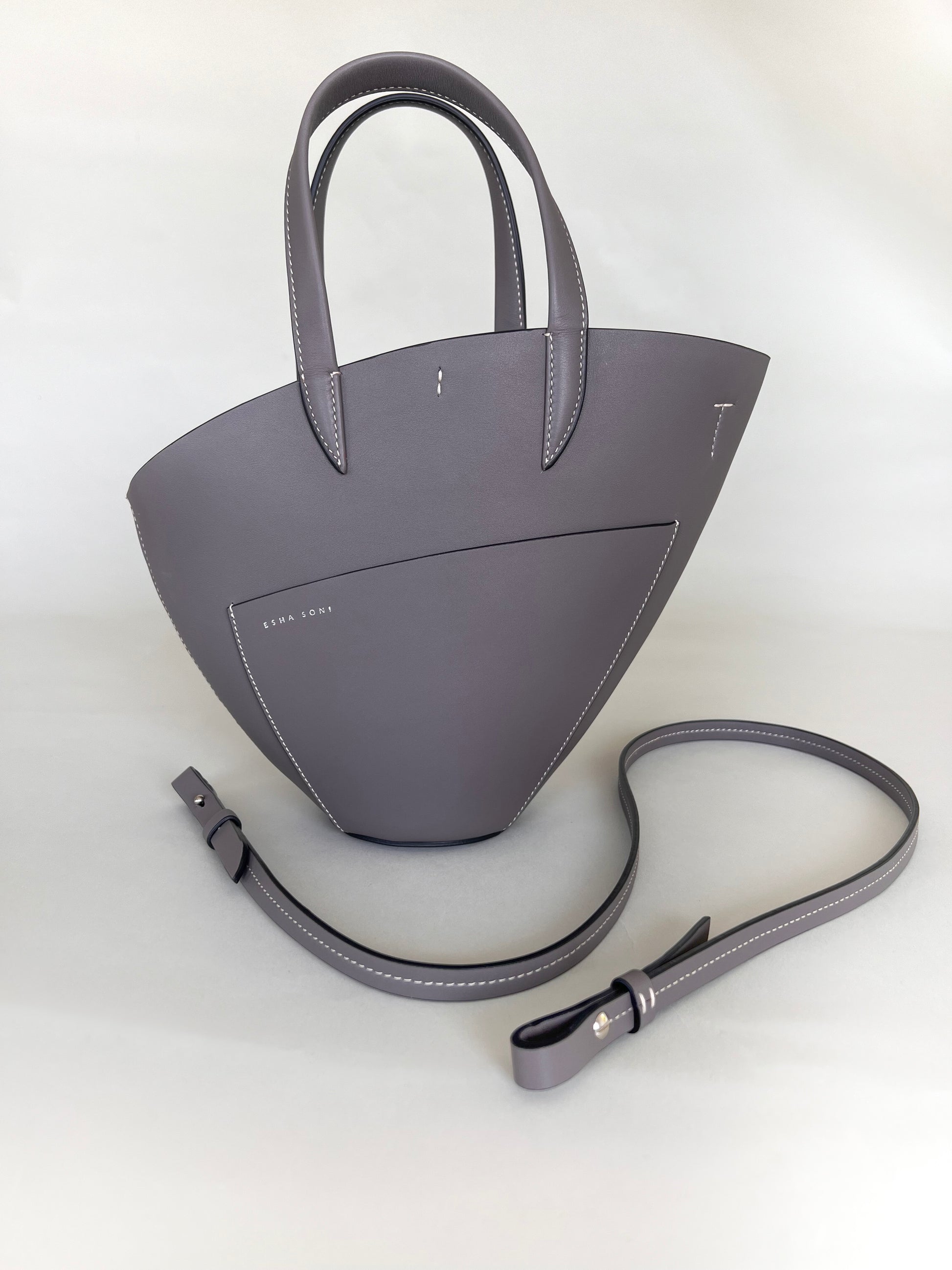 Moulded on a wooden form this style embodies the sculptural language that is pivotal to Collection 101. Fully bonded to fine Italian suede, this mini tote can be worn as a top handle or over the shoulder with the detachable crossbody strap. The Asymmetric curve of the top edge lends this simple yet beautiful tote a poetic feel.
