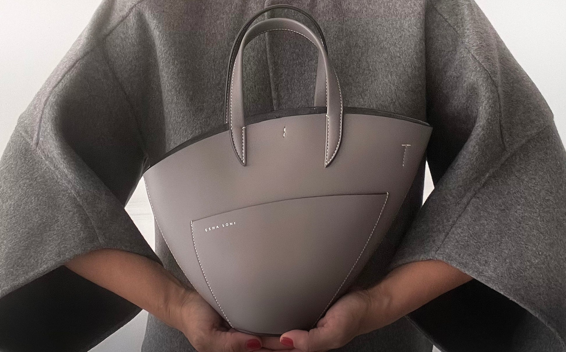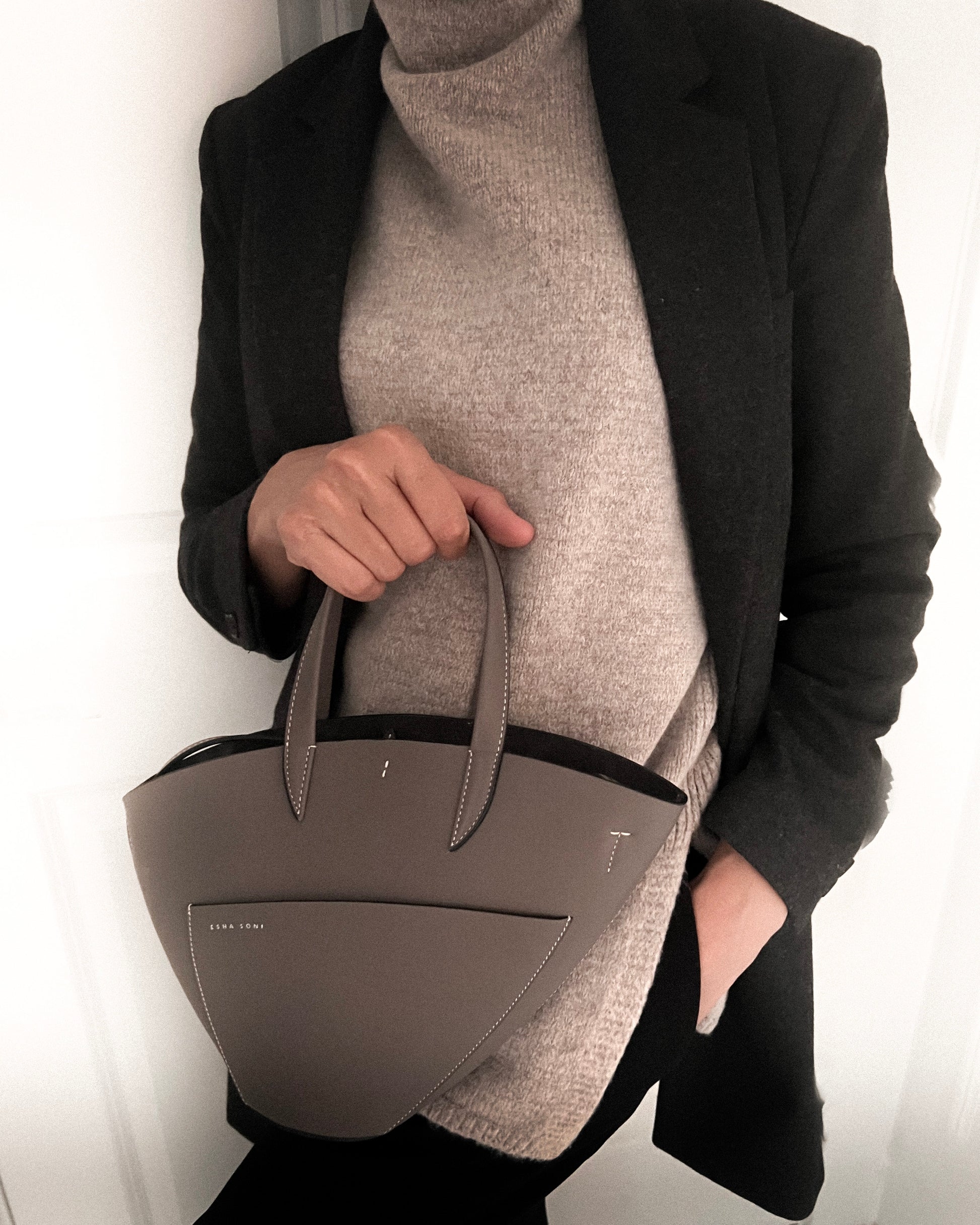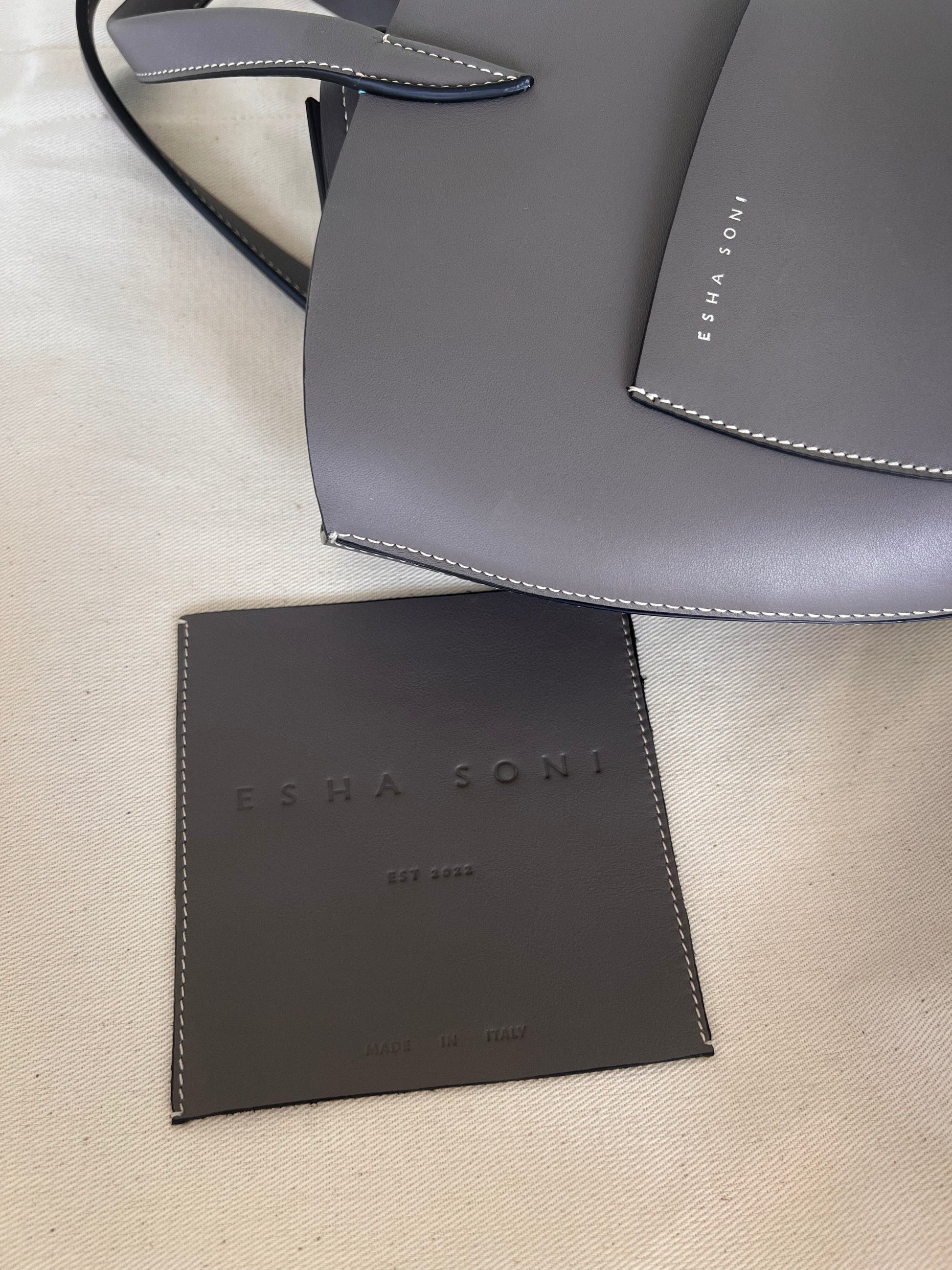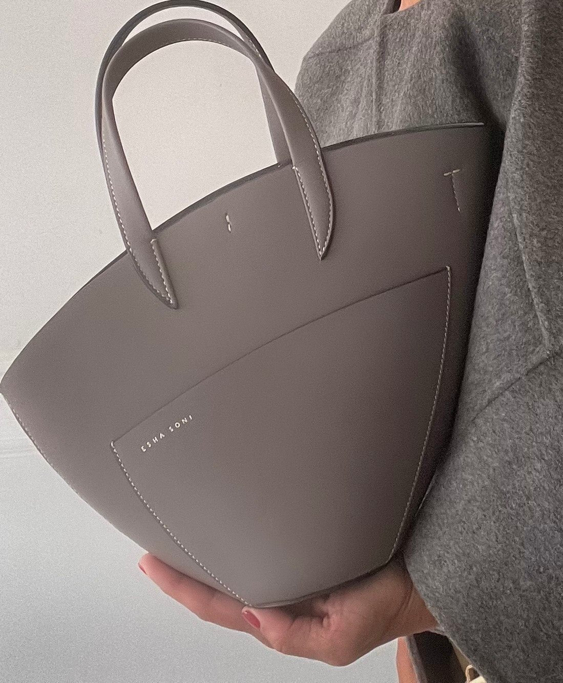 Moulded on a wooden form this style embodies the sculptural language that is pivotal to Collection 101. Fully bonded to fine Italian suede, this mini tote can be worn as a top handle or over the shoulder with the detachable crossbody strap. The Asymmetric curve of the top edge lends this simple yet beautiful tote a poetic feel.