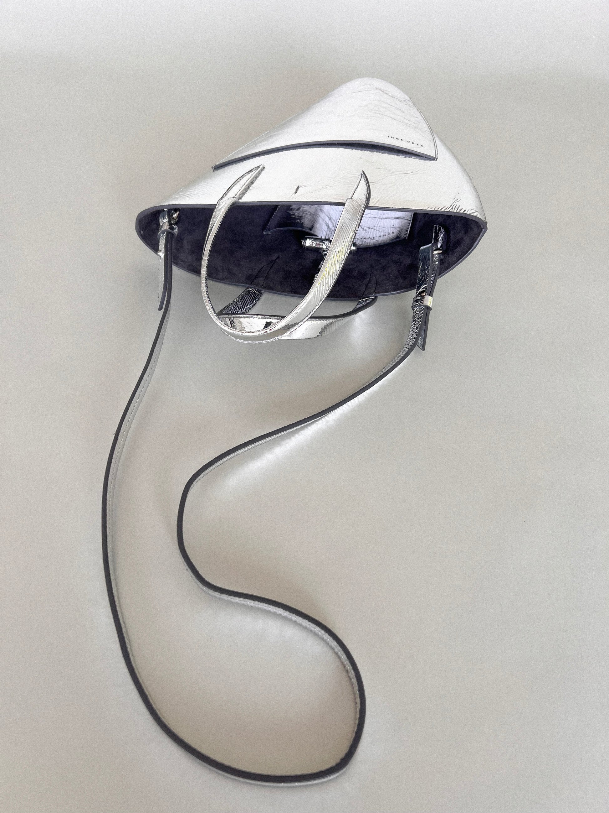 Moulded on a wooden form this style embodies the sculptural language that is pivotal to Collection 101. Fully bonded to fine Italian suede, this mini tote can be worn as a top handle or over the shoulder with the detachable crossbody strap. The Asymmetric curve of the top edge lends this simple yet beautiful tote a poetic feel.