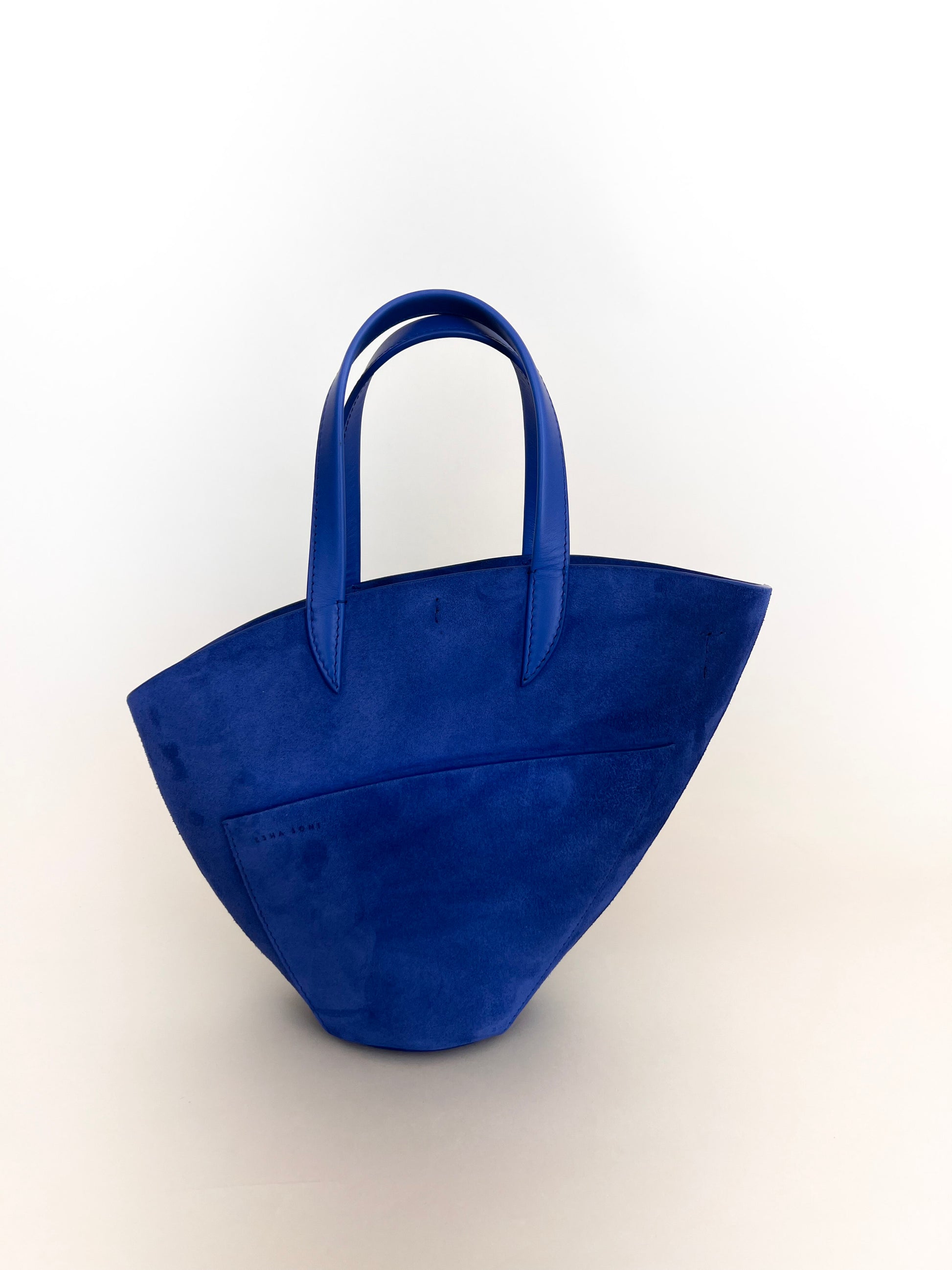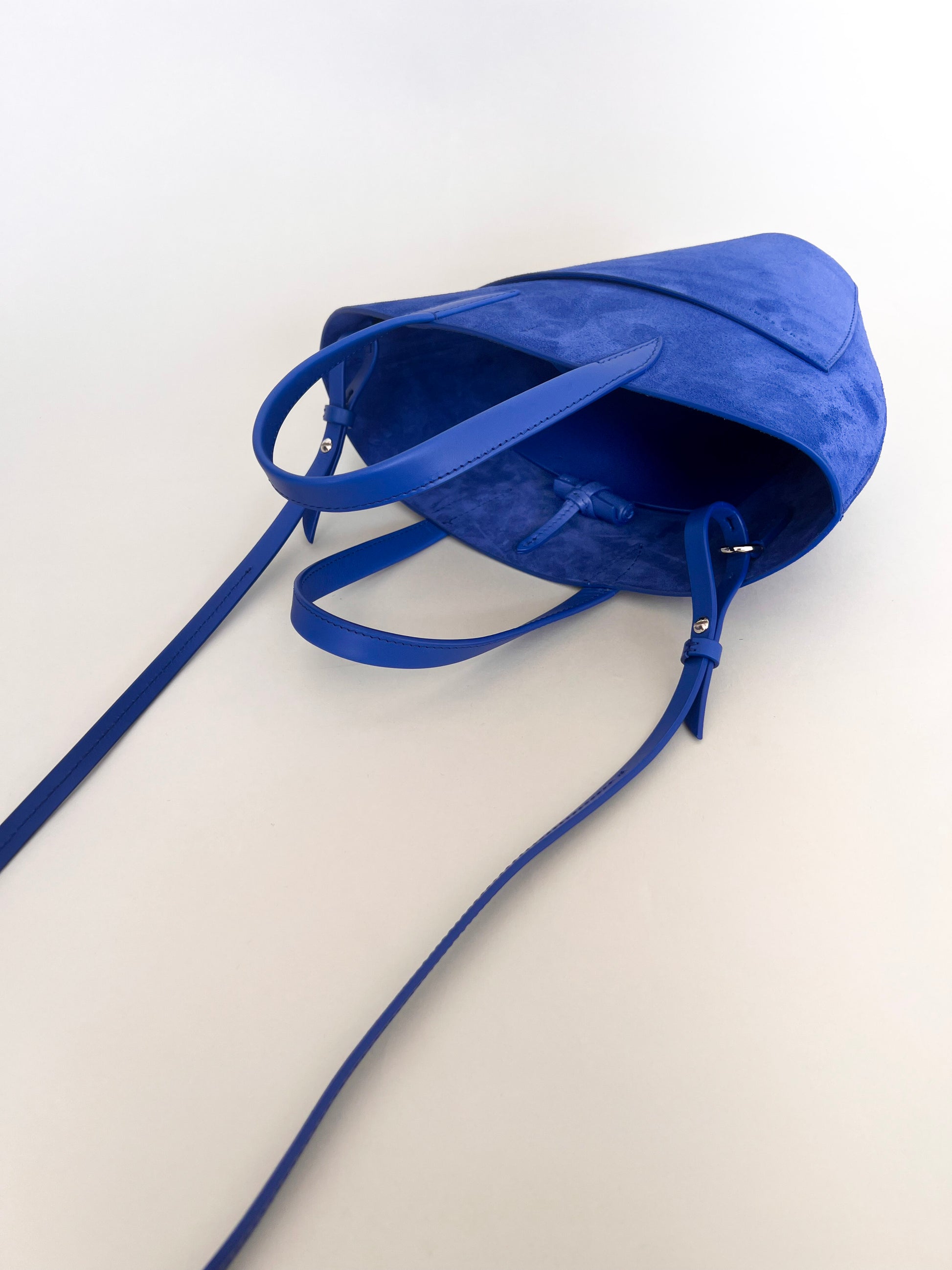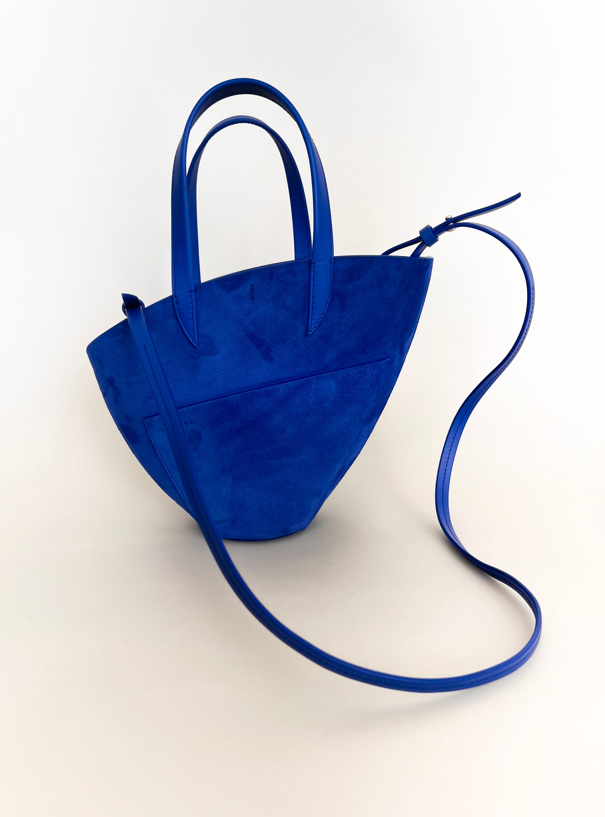 Moulded on a wooden form this style embodies the sculptural language that is pivotal to Collection 101. Fully bonded to fine Italian suede, this mini tote can be worn as a top handle or over the shoulder with the detachable crossbody strap. The Asymmetric curve of the top edge lends this simple yet beautiful tote a poetic feel.