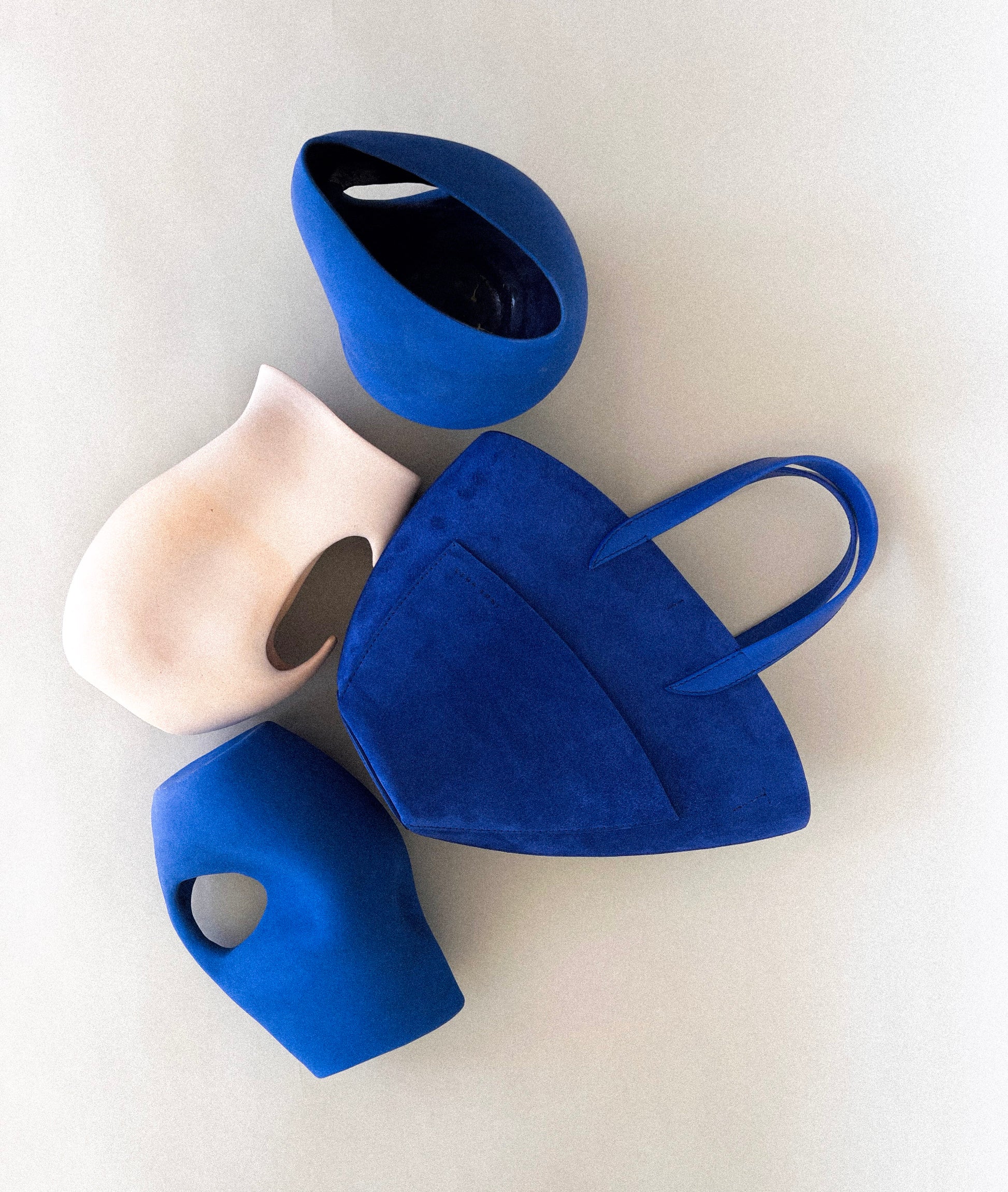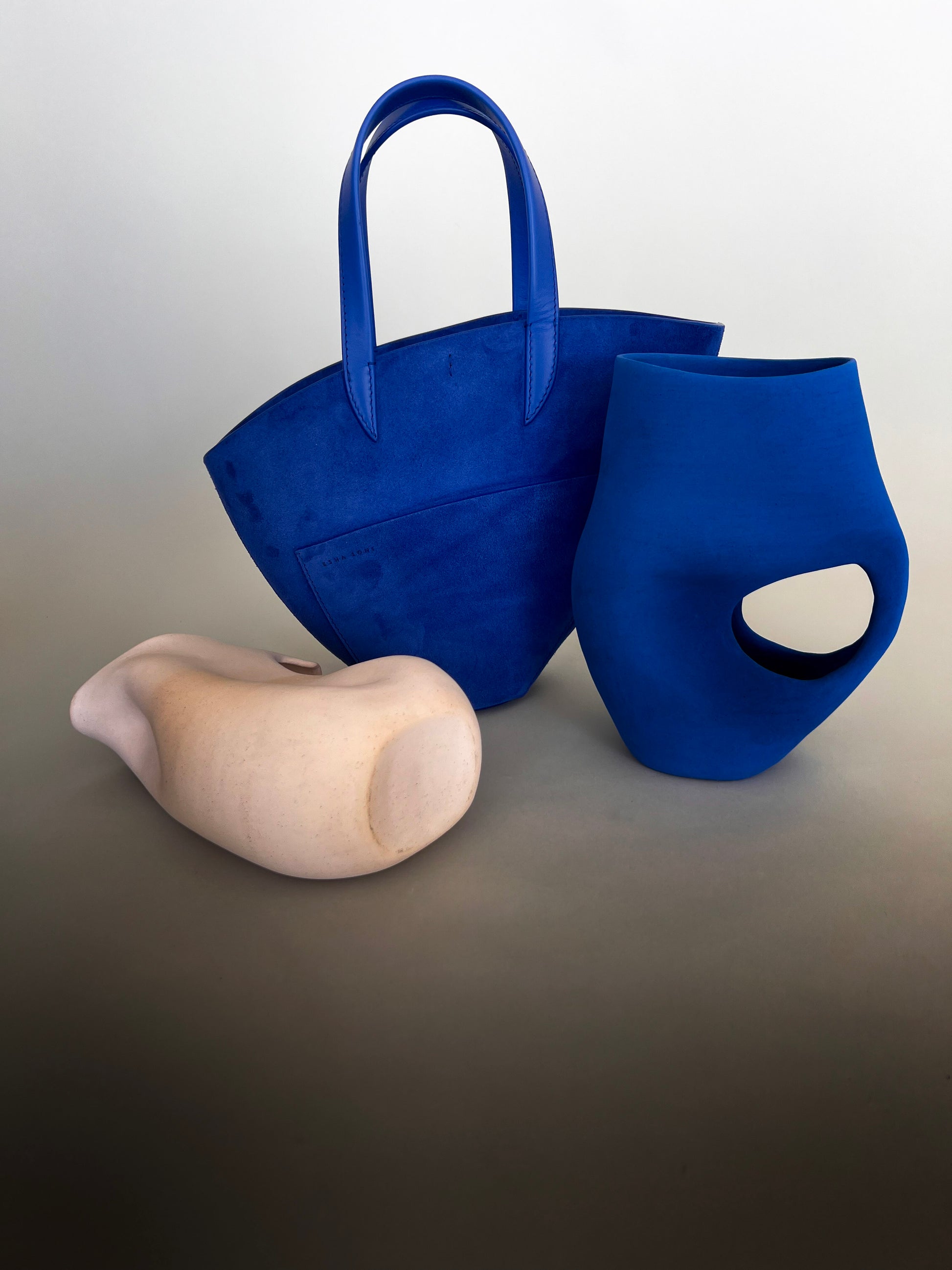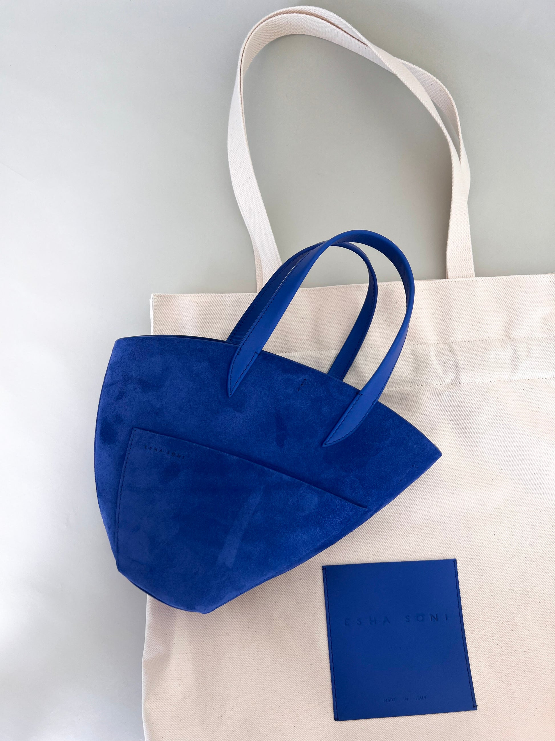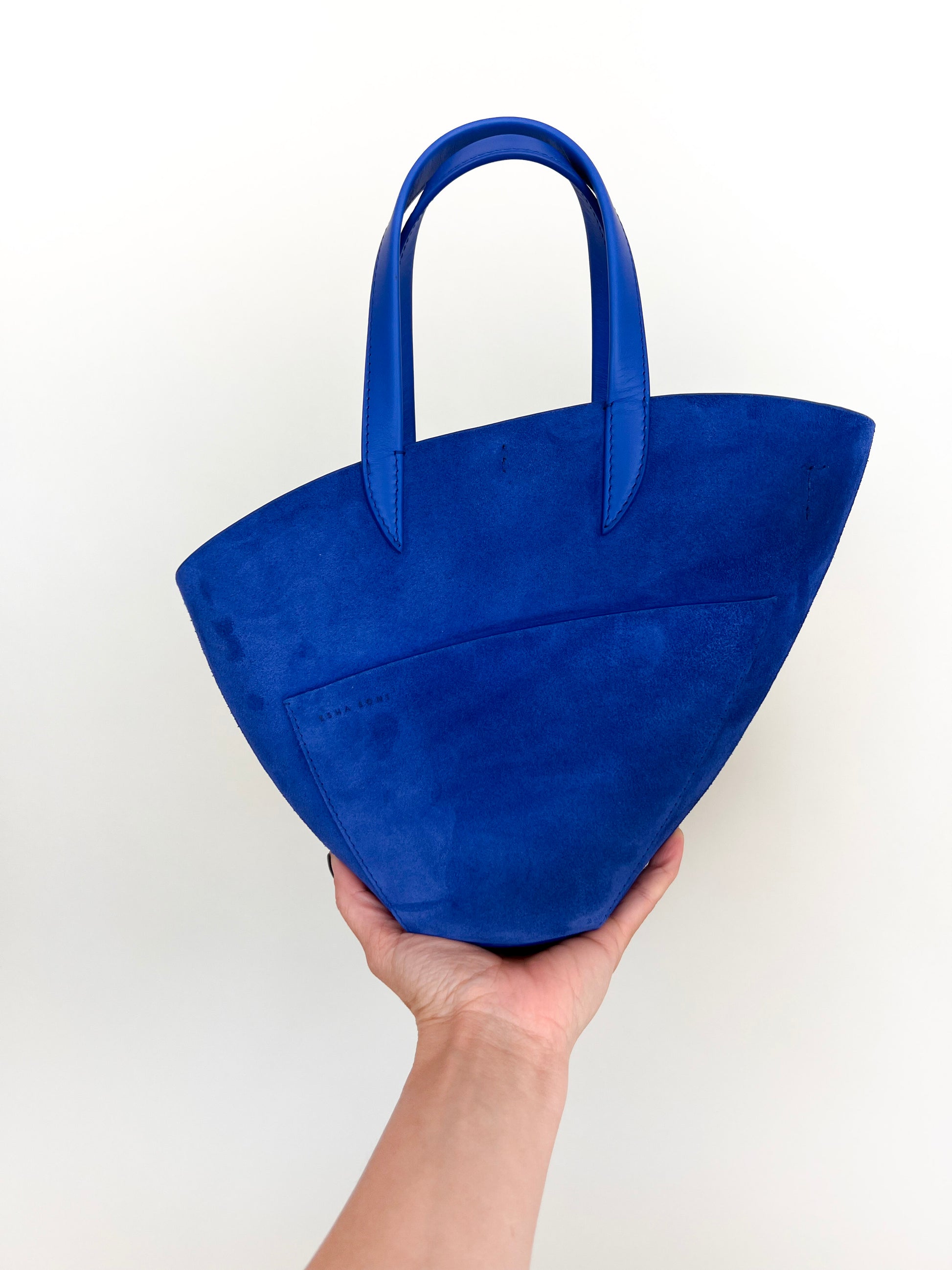 Moulded on a wooden form this style embodies the sculptural language that is pivotal to Collection 101. Fully bonded to fine Italian suede, this mini tote can be worn as a top handle or over the shoulder with the detachable crossbody strap. The Asymmetric curve of the top edge lends this simple yet beautiful tote a poetic feel.