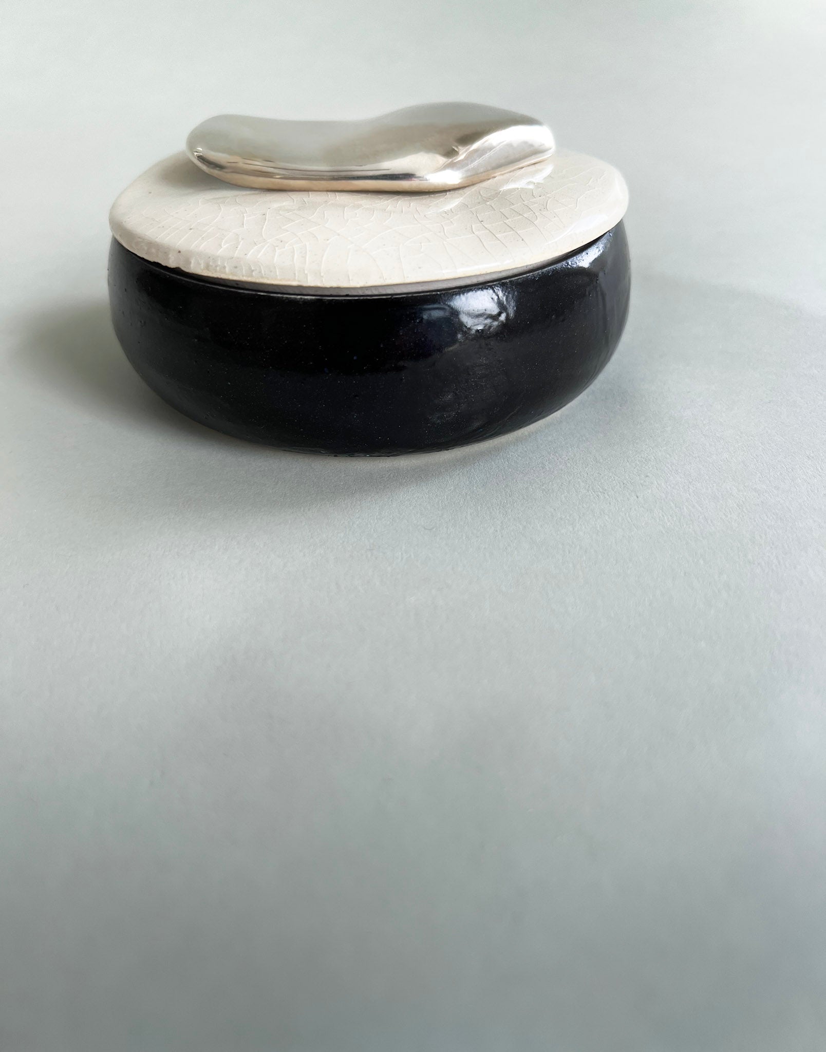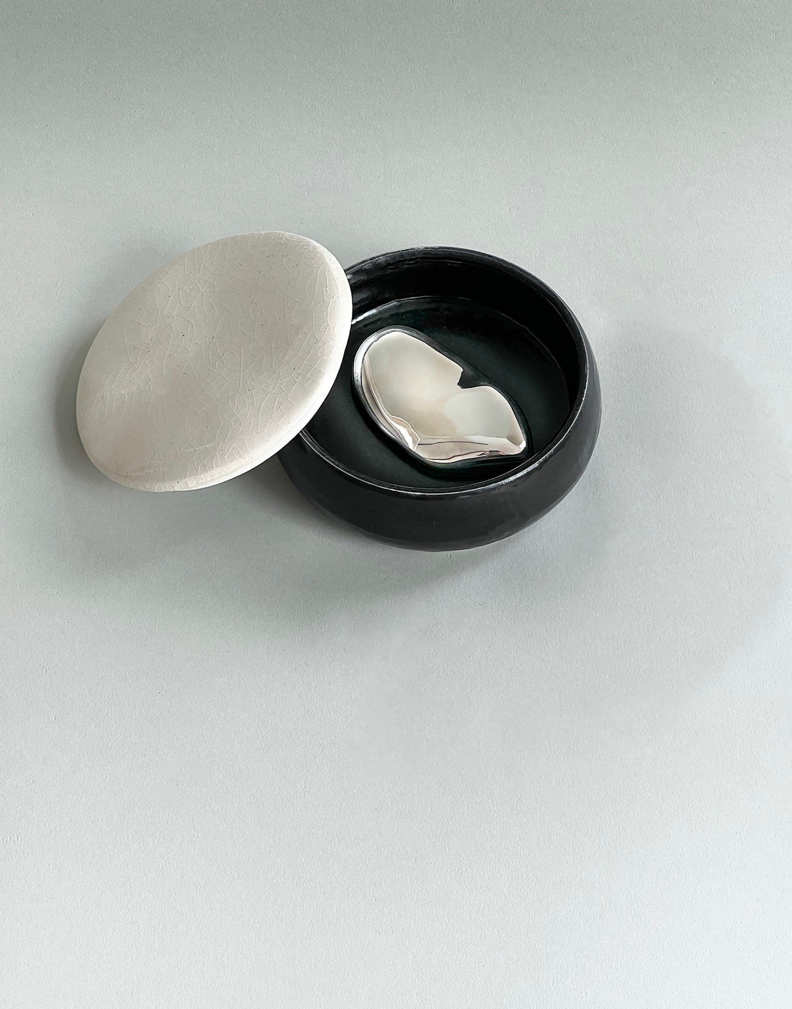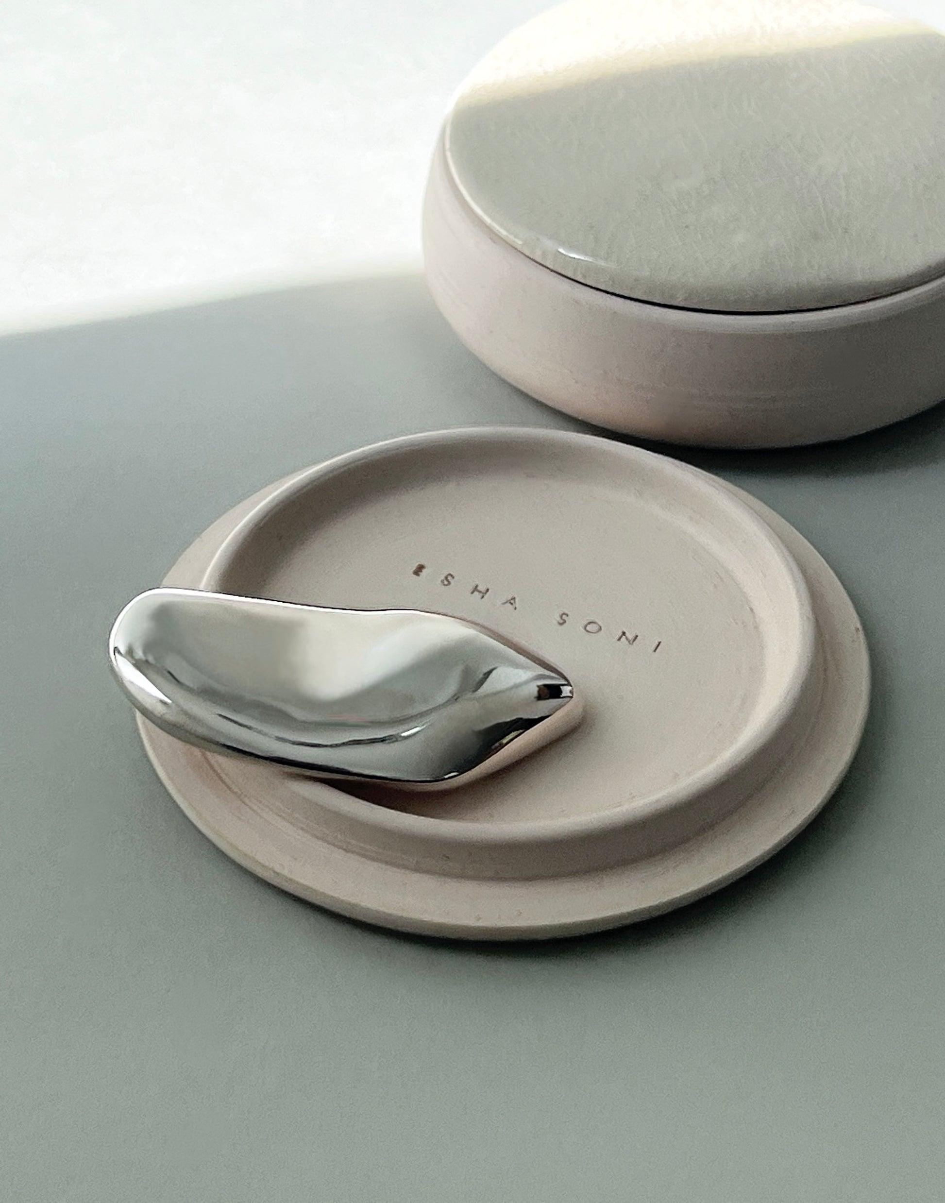 Our signature piece, as seen on the ORB bag in the form of a brooch. Sculpted by hand, then cast into a mould, this piece reflects the organic, biomorphic elements that inspired Collection 101.