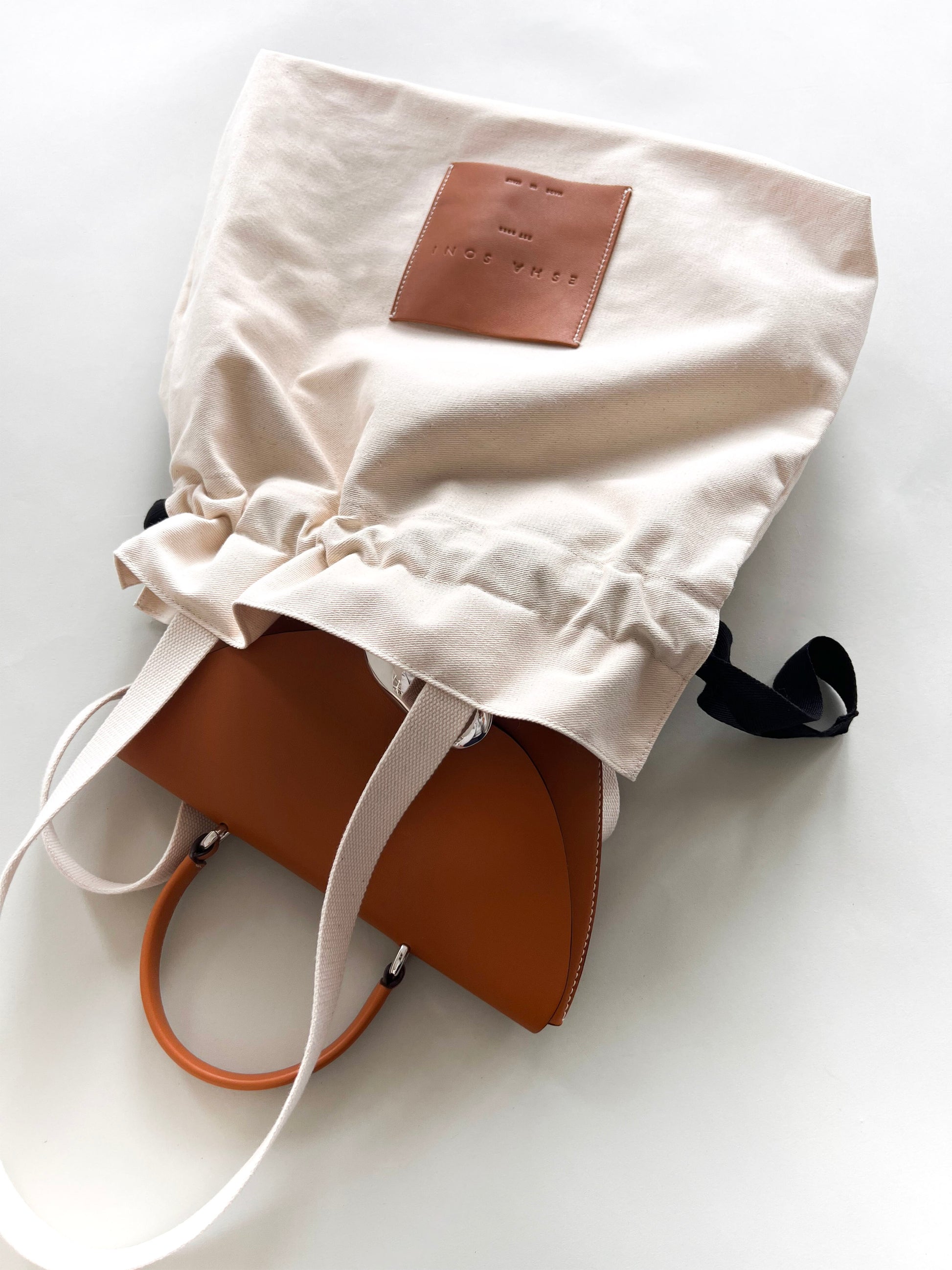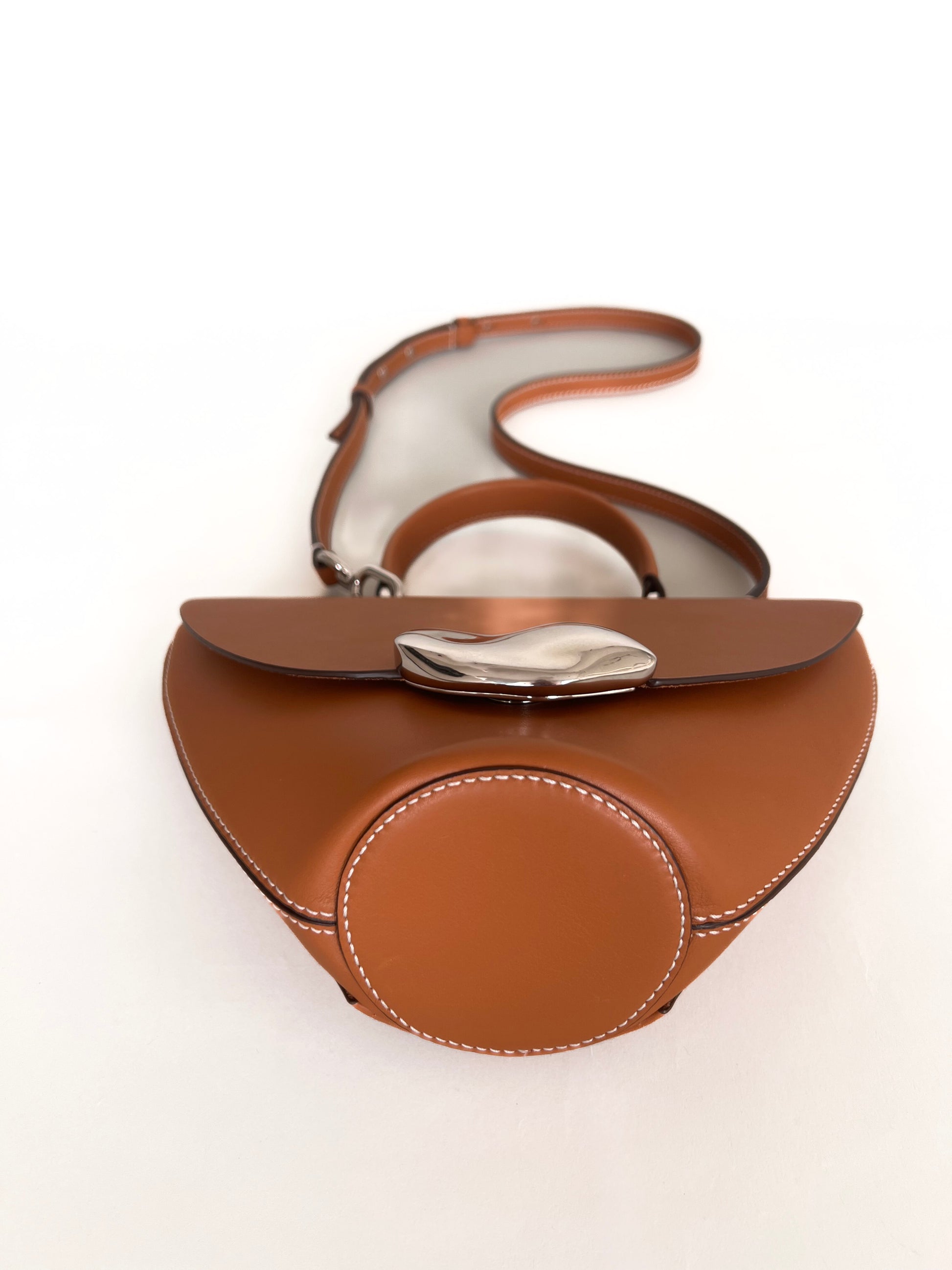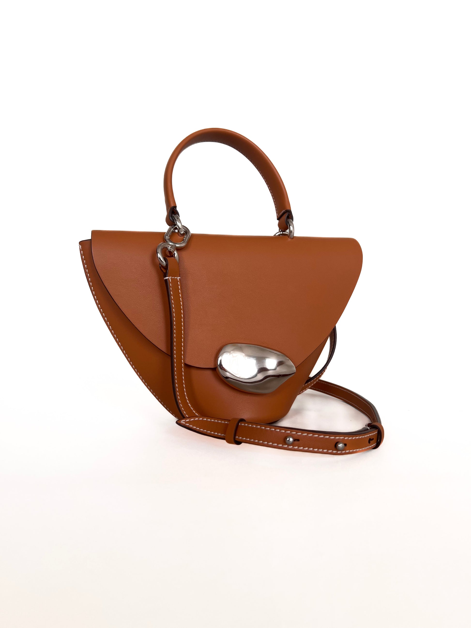 The Orb is a petit handbag featuring a circular base,curved body and rounded top flap. The elegant silhouette connects to a brass top handle and can also be worn effortlessly as a crossbody.The Orb is adorned with a sculptural,hand-carved brass object that functions as a closure. This Saddle version has contrast ecru top stitching to accentuate the curves.