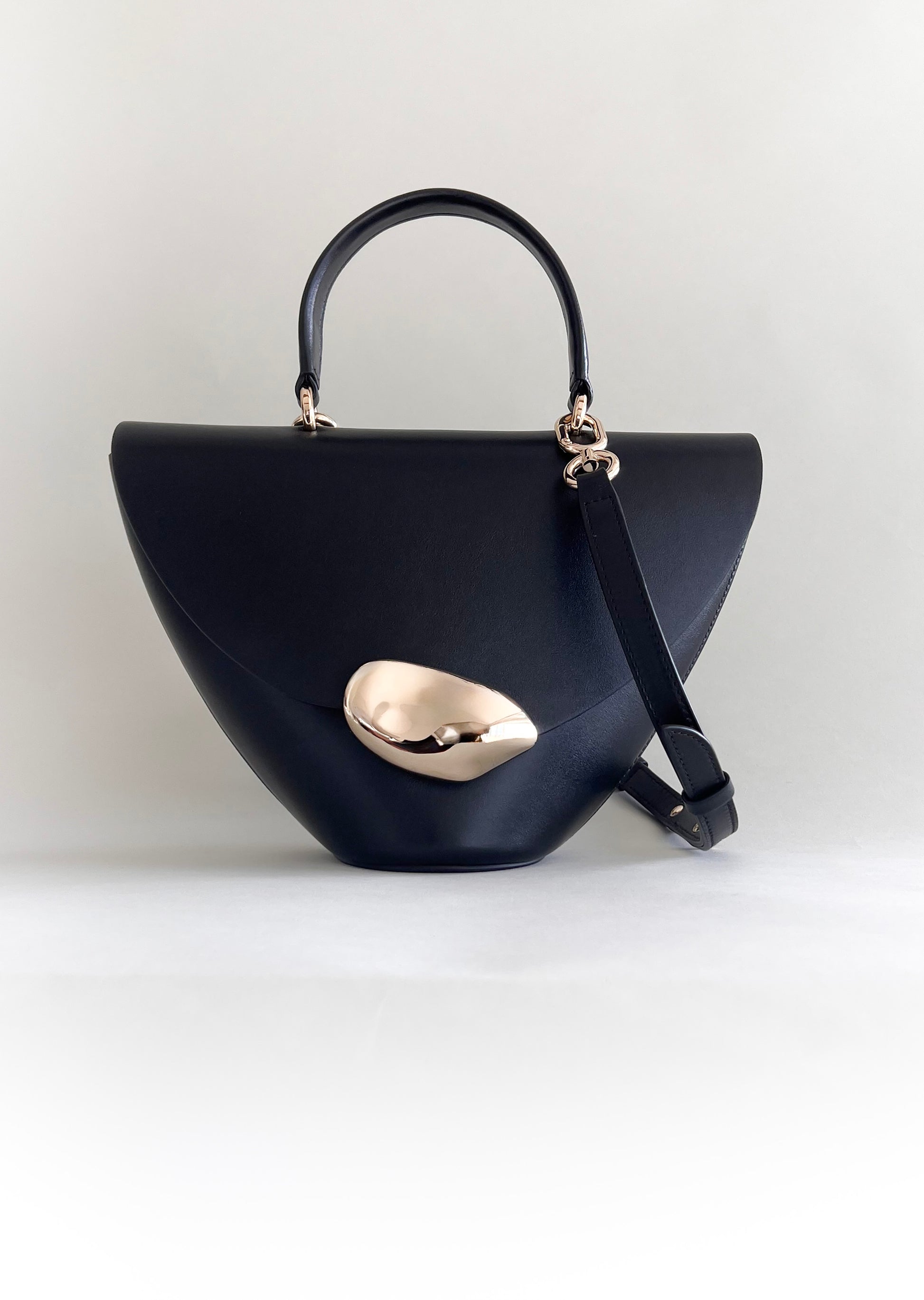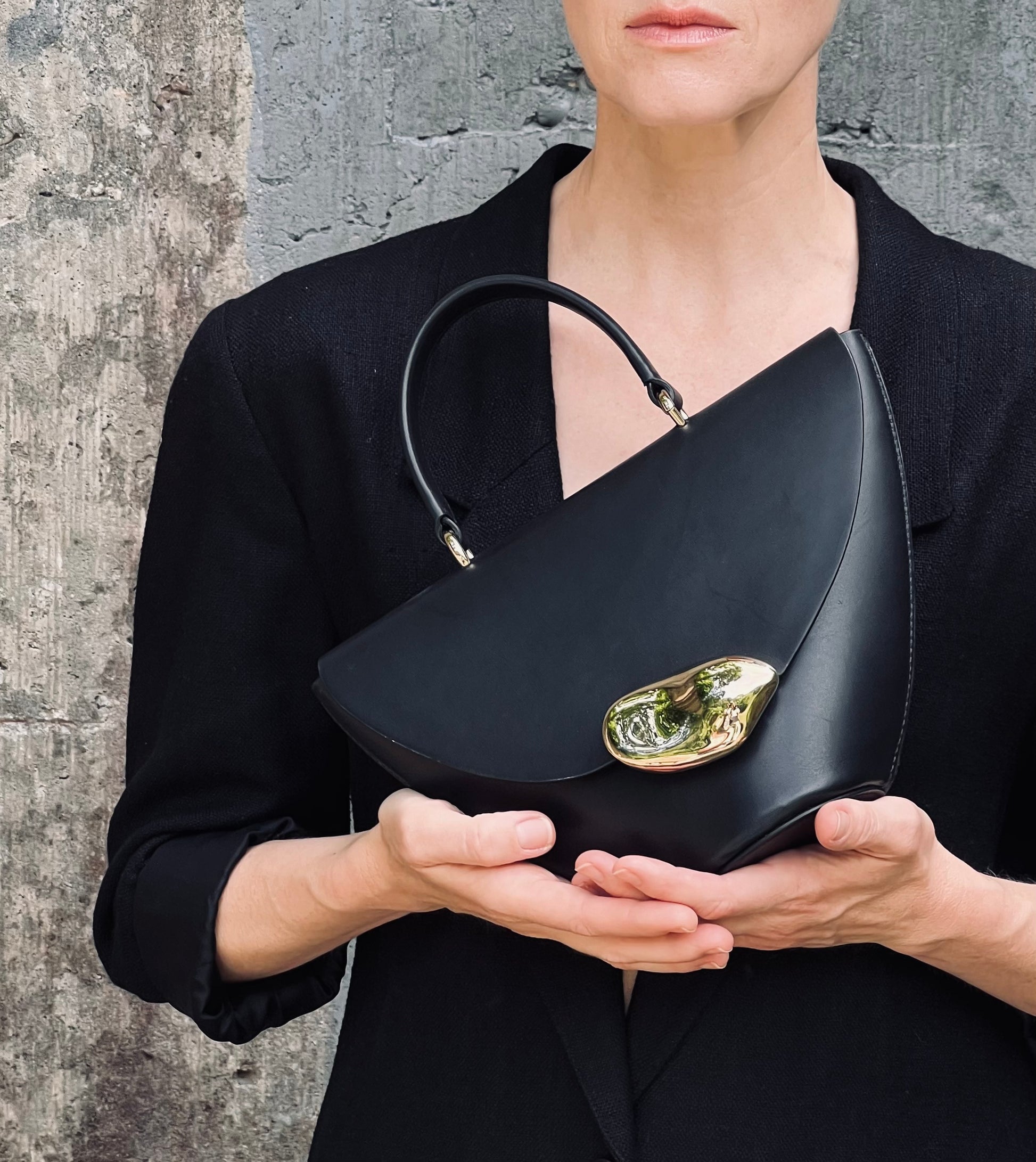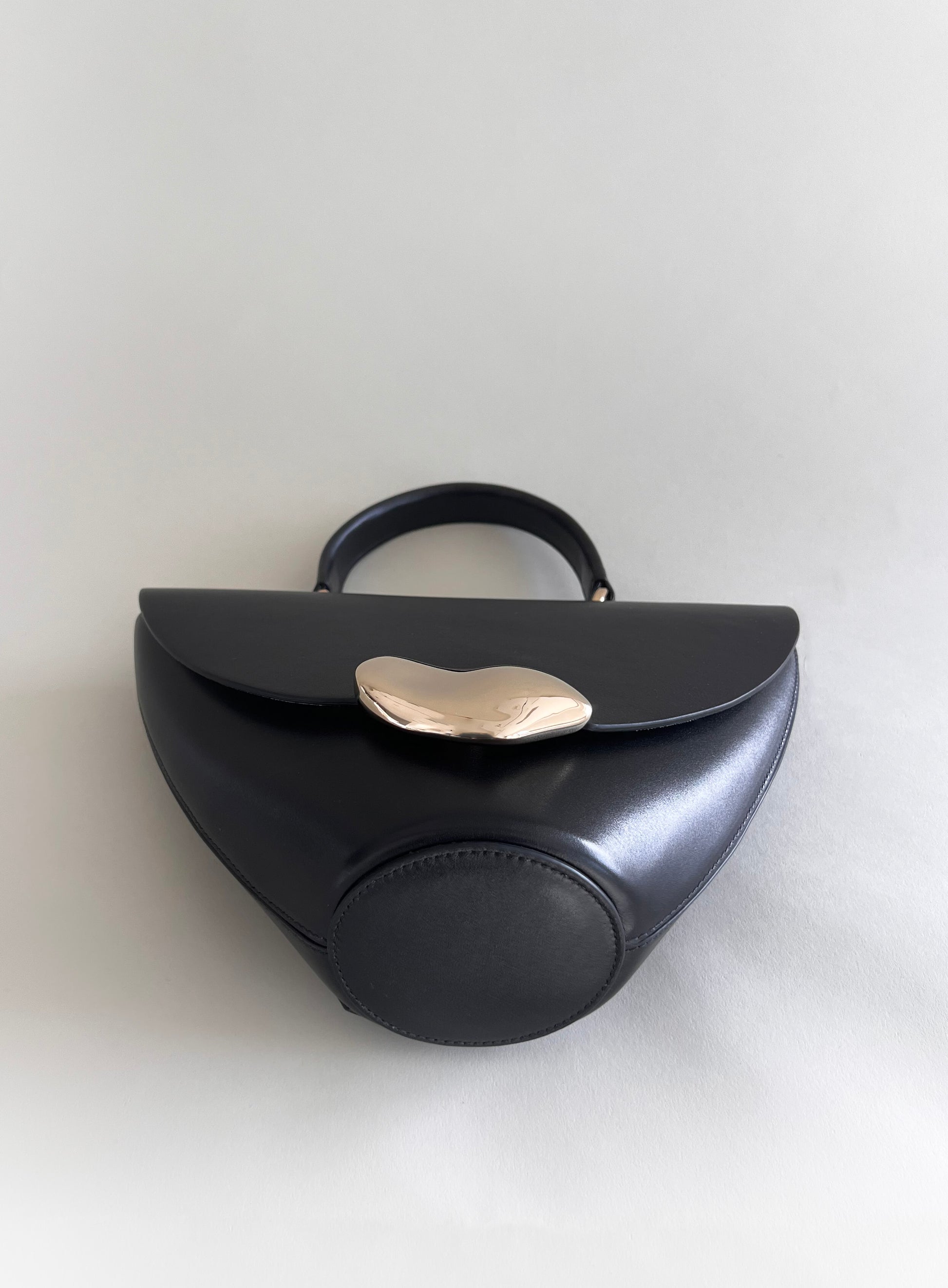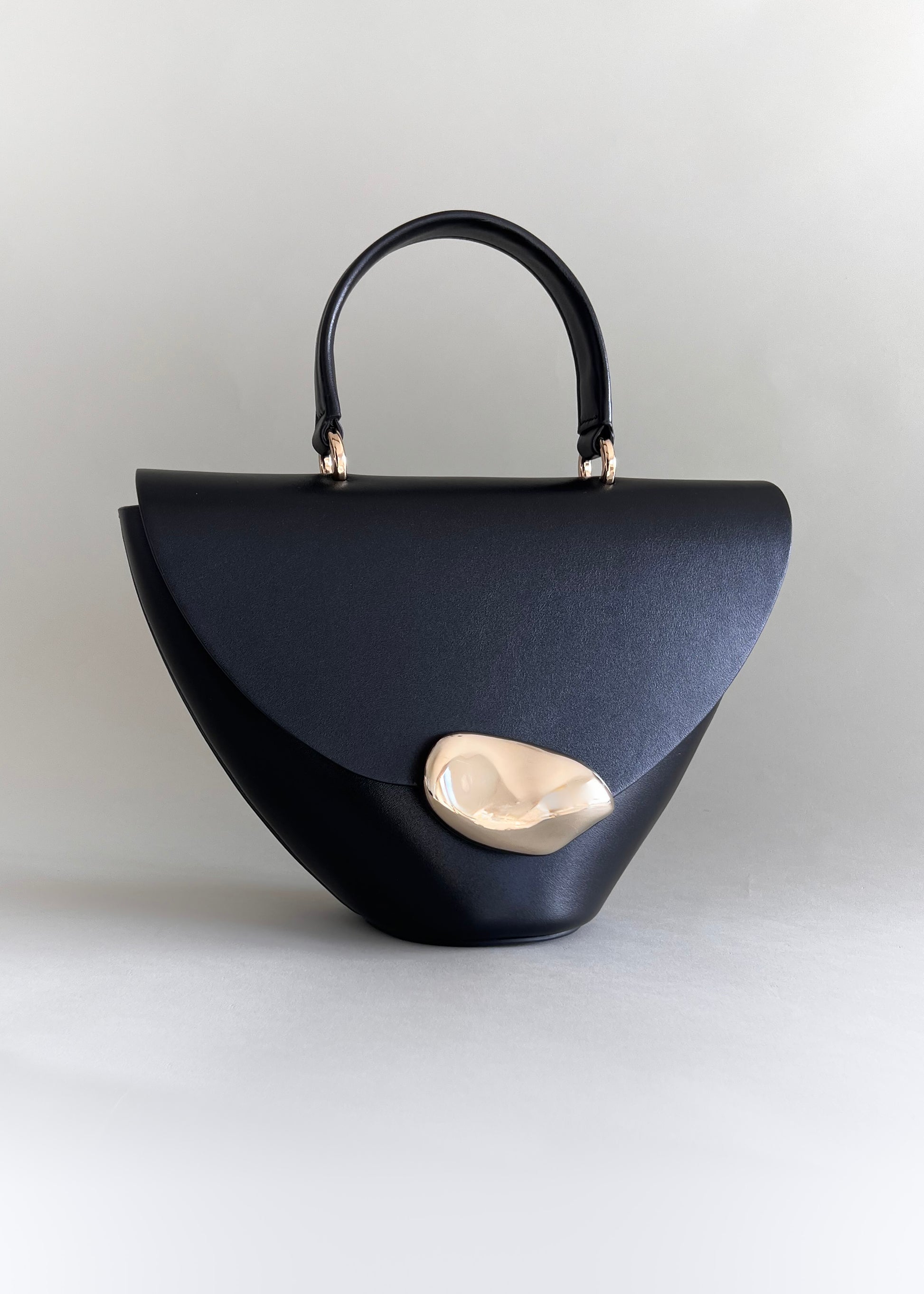The Orb is a petit handbag featuring a circular base,curved body and rounded top flap. The elegant silhouette connects to a brass top handle and can also be worn effortlessly as a crossbody.The Orb is adorned with a sculptural,hand-carved brass object that functions as a closure.
