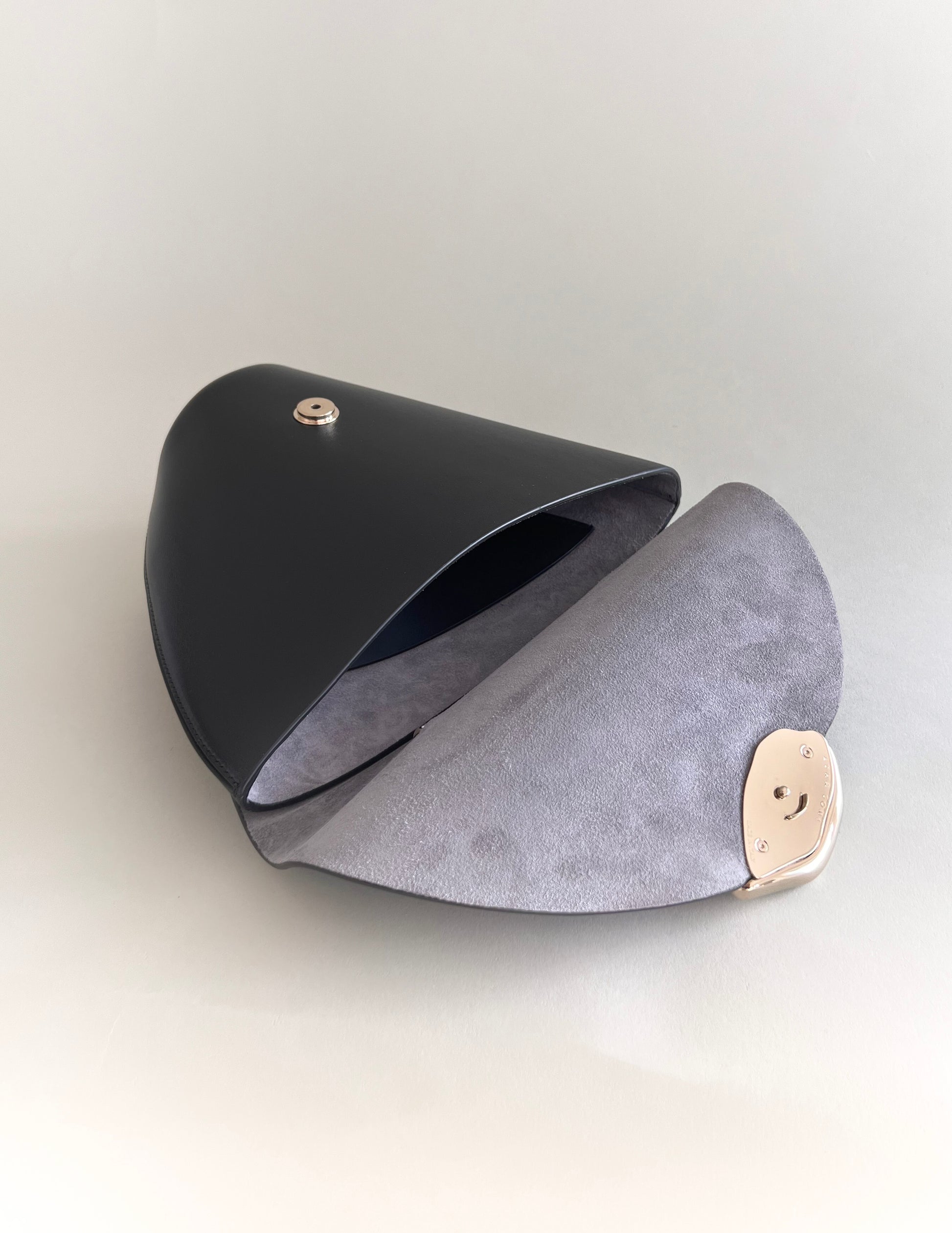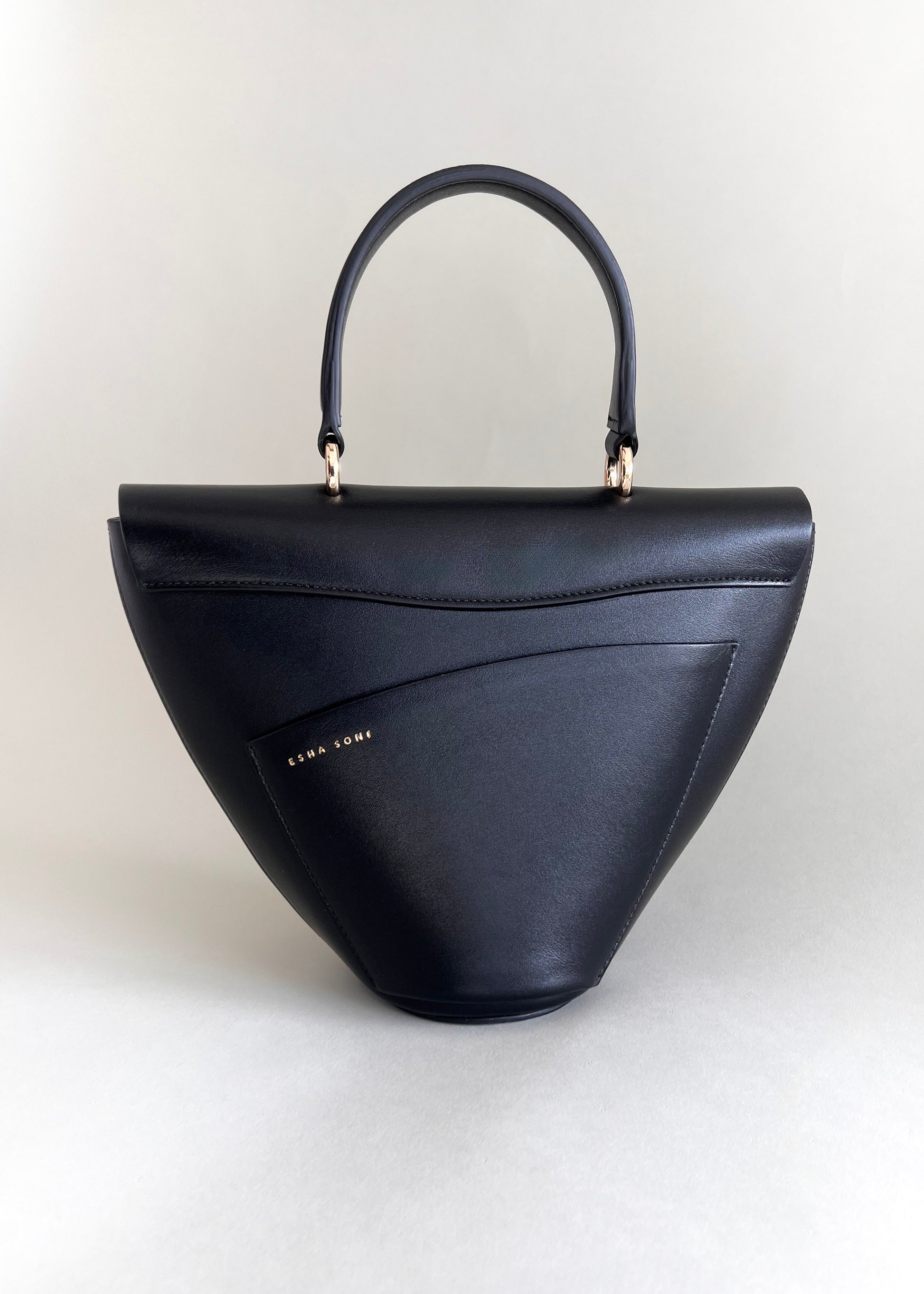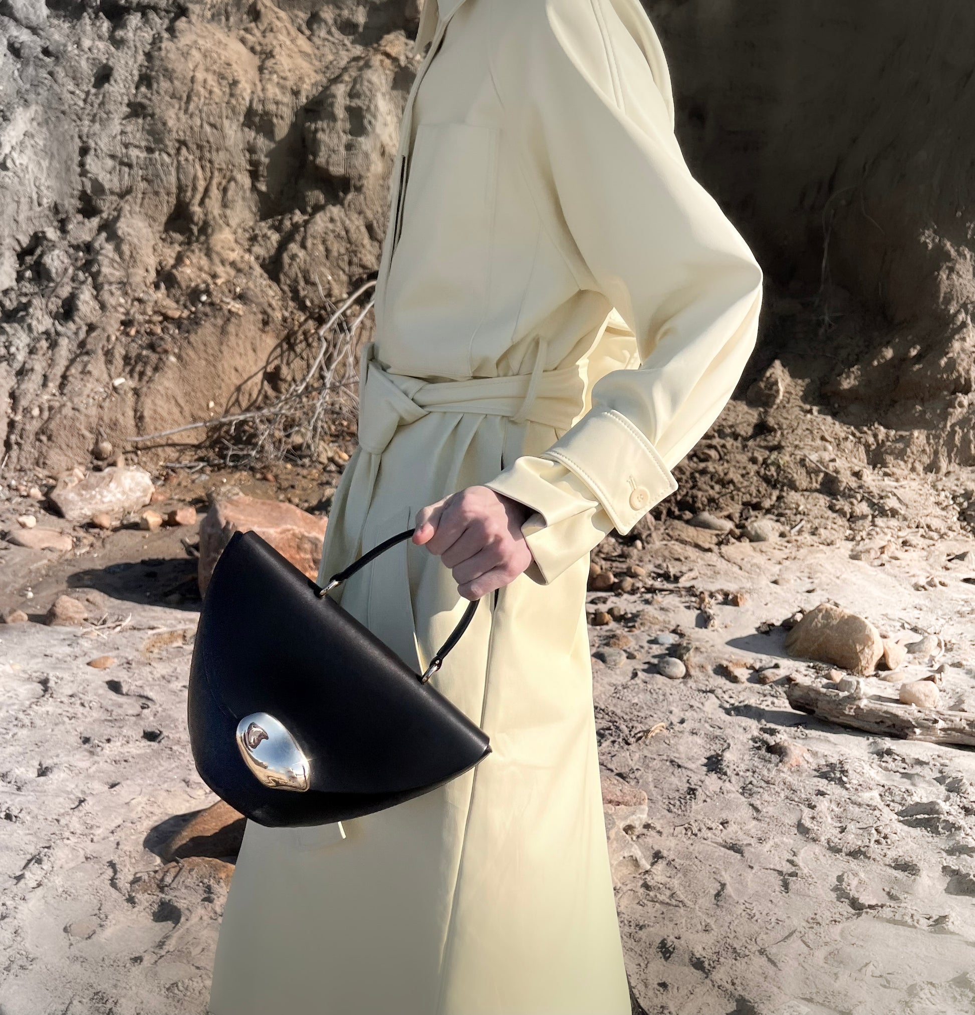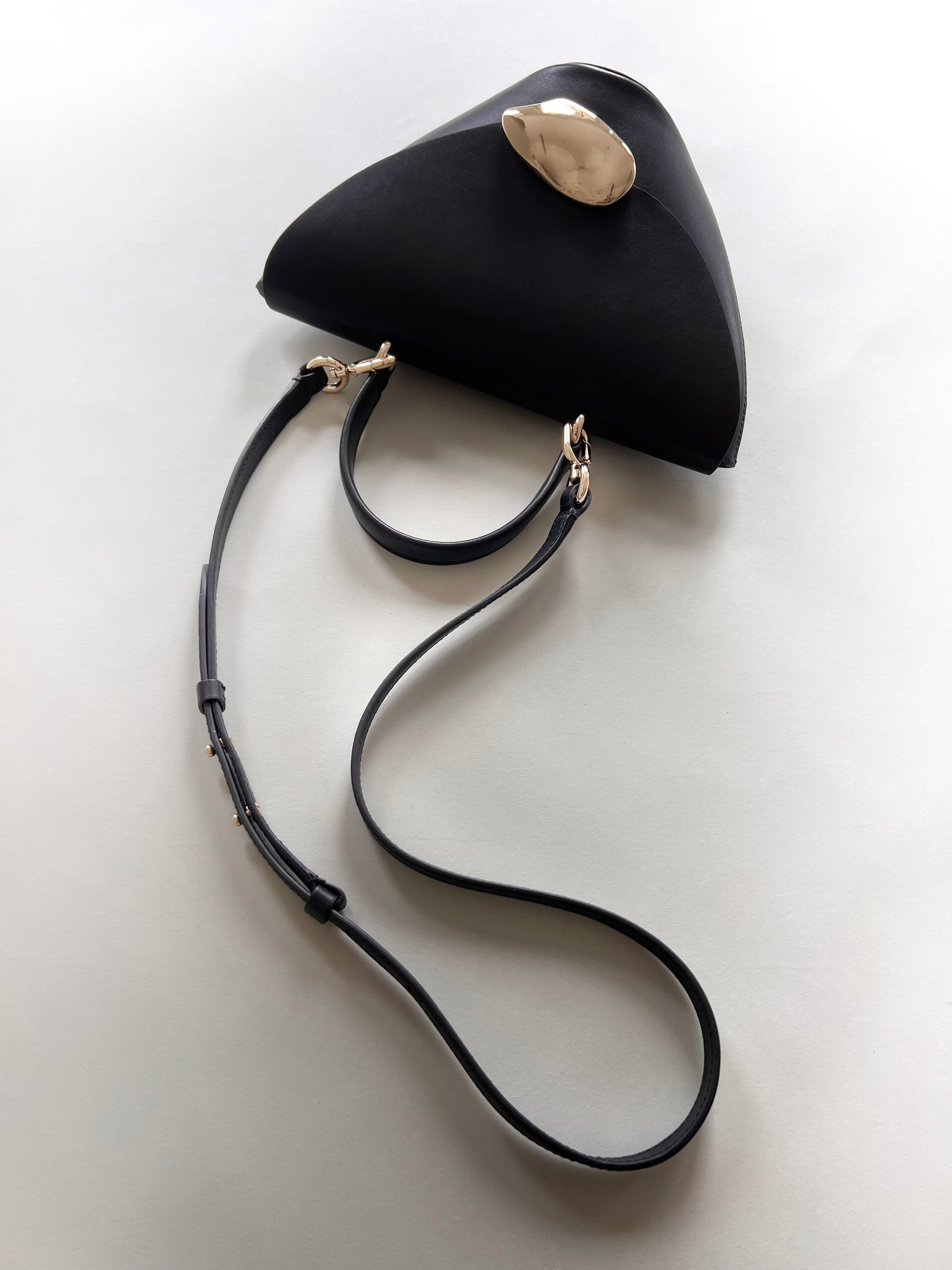The Orb is a petit handbag featuring a circular base,curved body and rounded top flap. The elegant silhouette connects to a brass top handle and can also be worn effortlessly as a crossbody.The Orb is adorned with a sculptural,hand-carved brass object that functions as a closure.