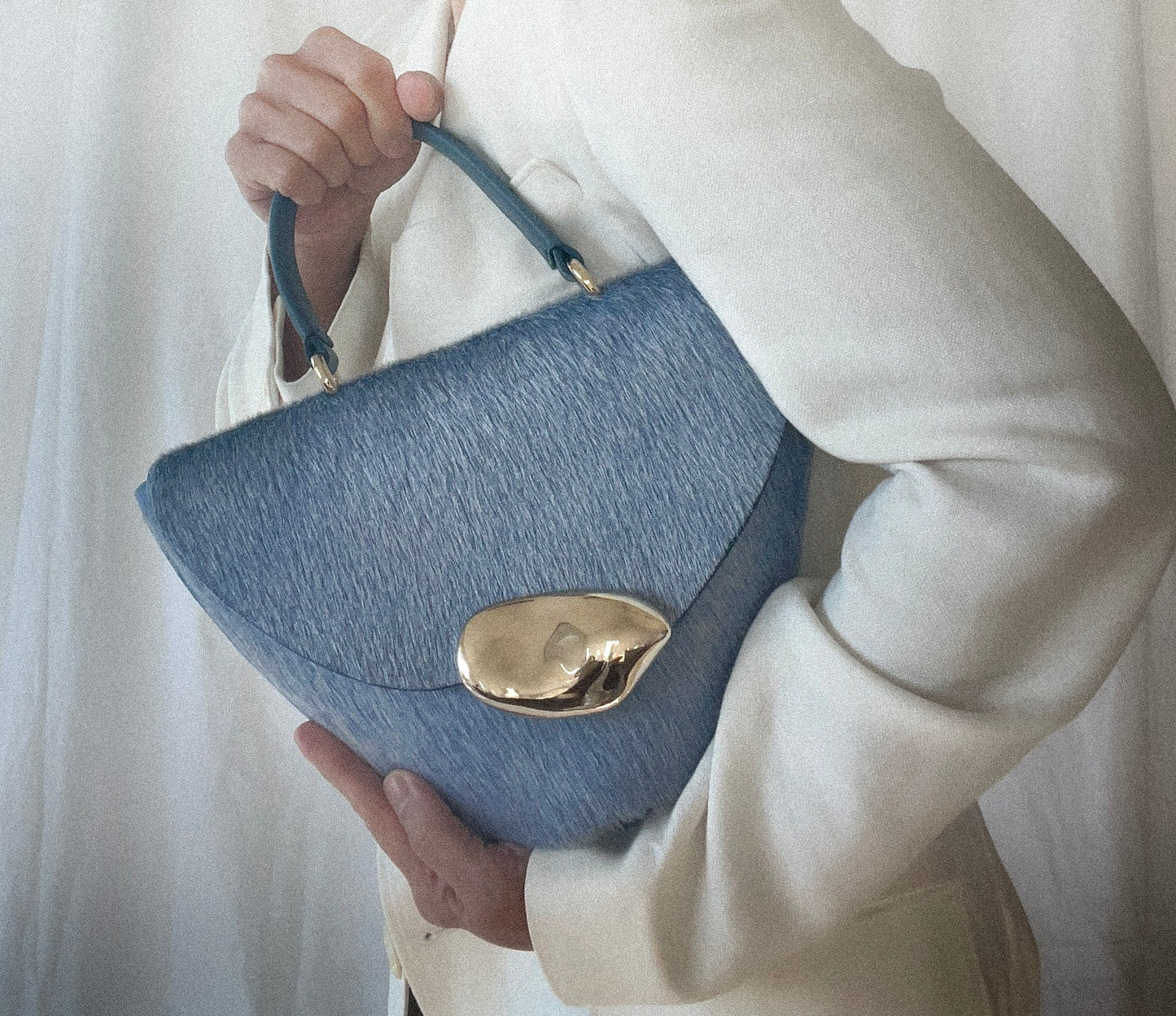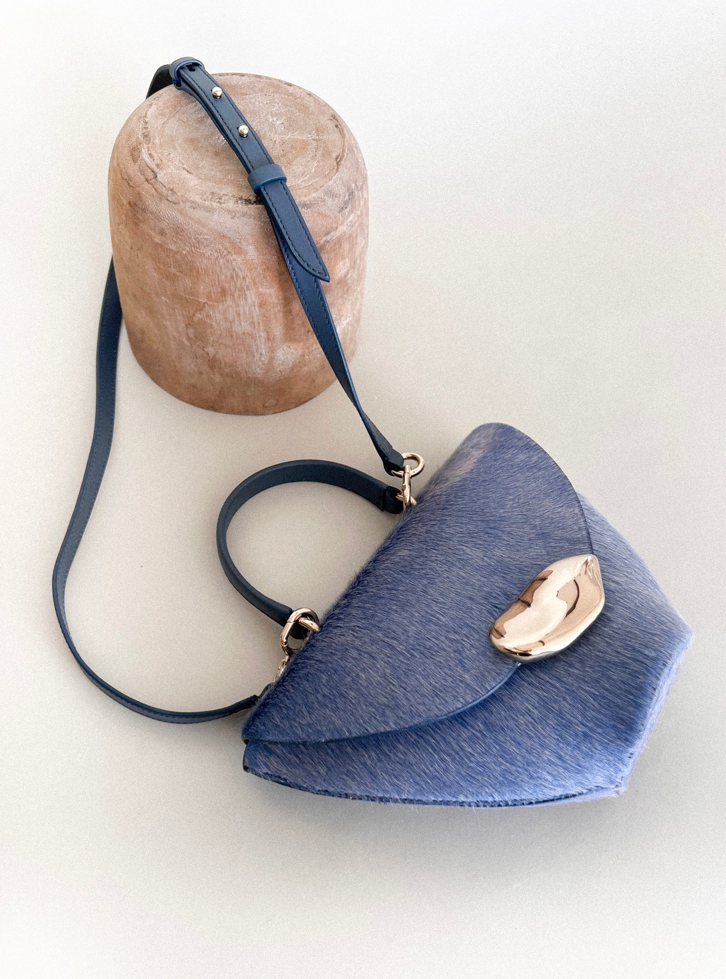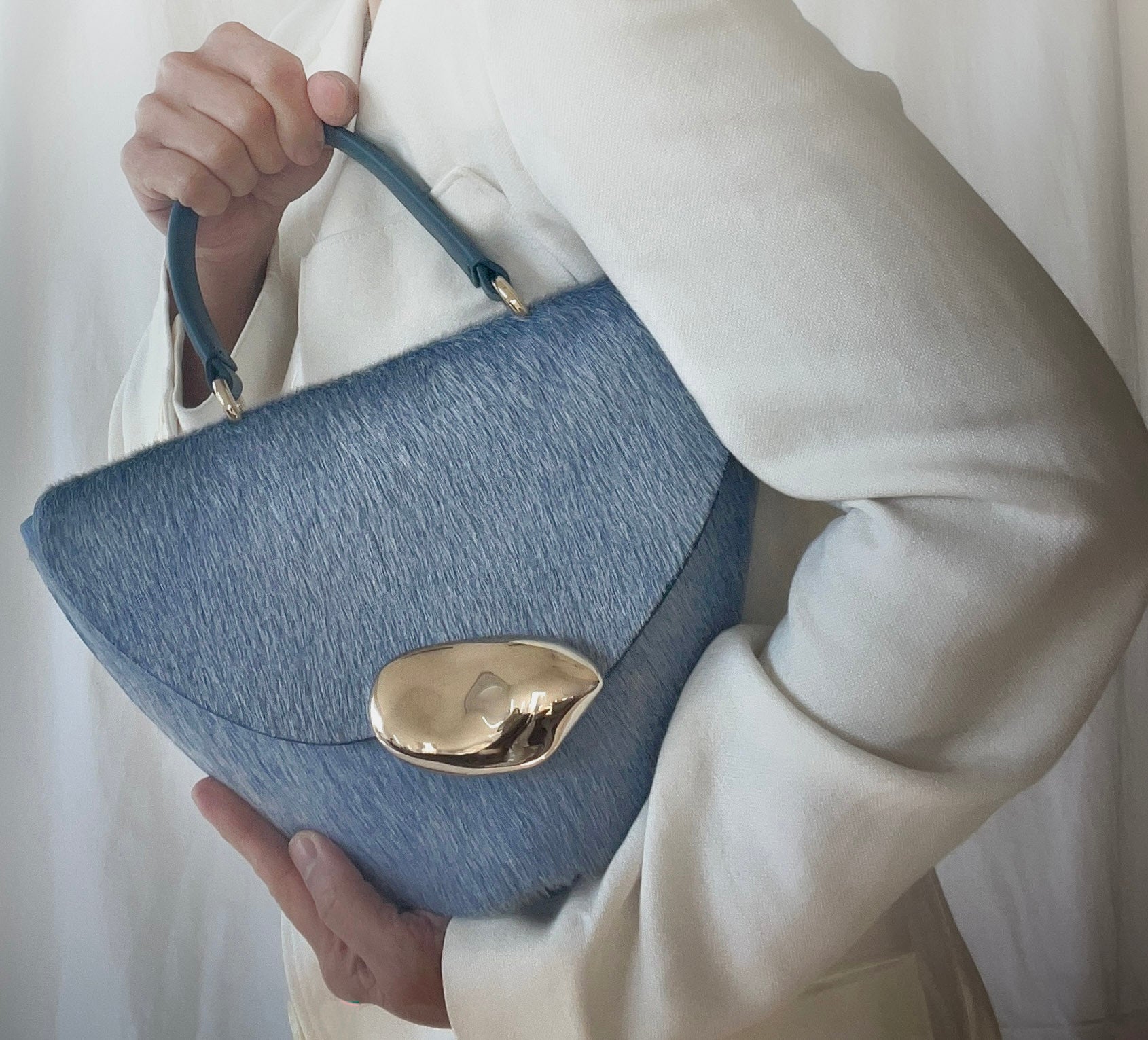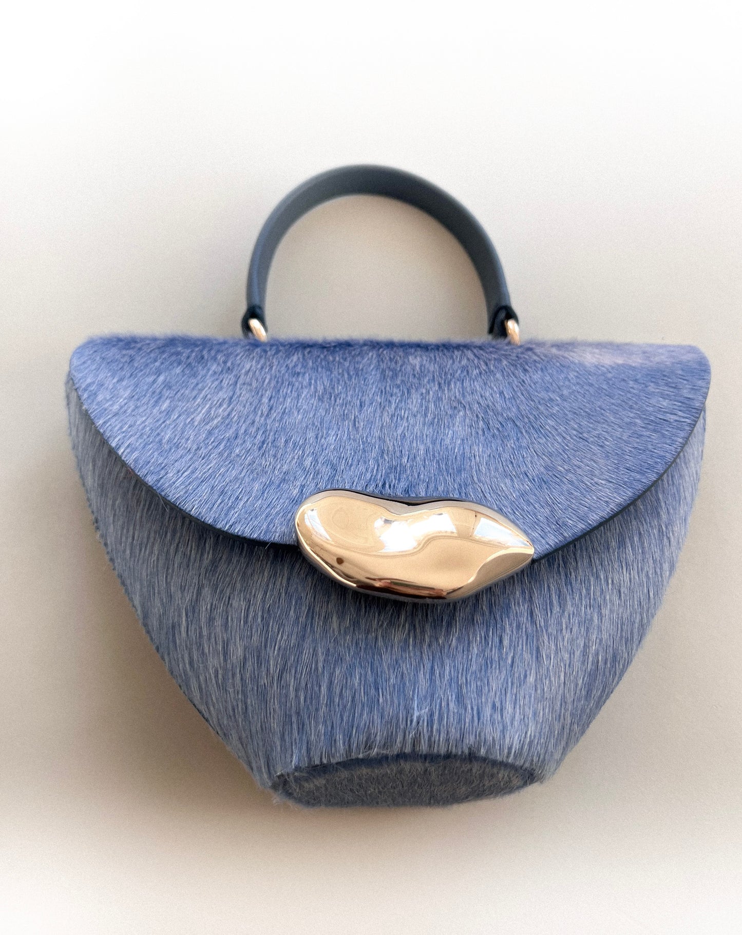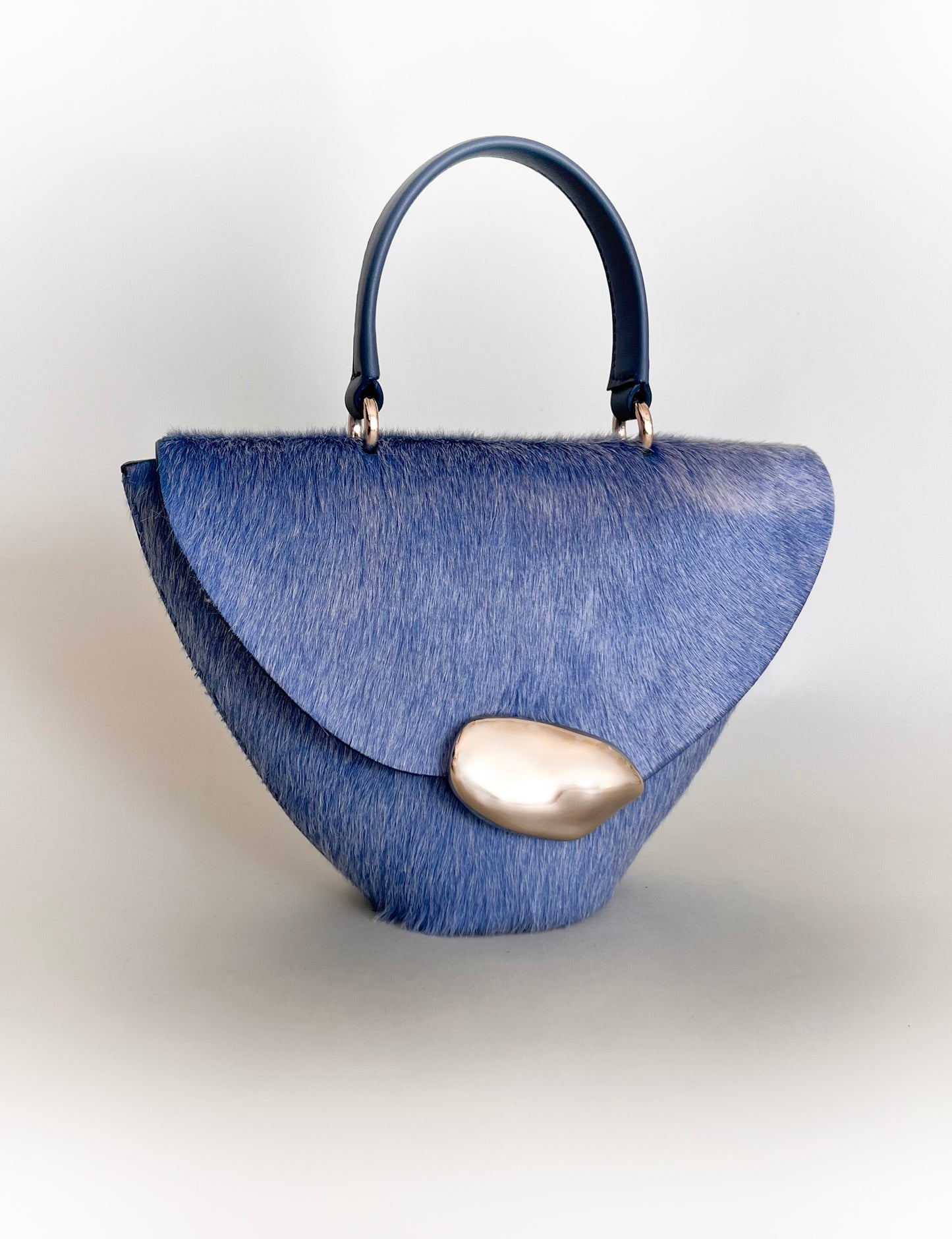 The Orb is a petit handbag featuring a circular base,curved body and rounded top flap. The elegant silhouette connects to a brass top handle and can also be worn effortlessly as a crossbody.The Orb is adorned with a sculptural,hand-carved brass object that functions as a closure.