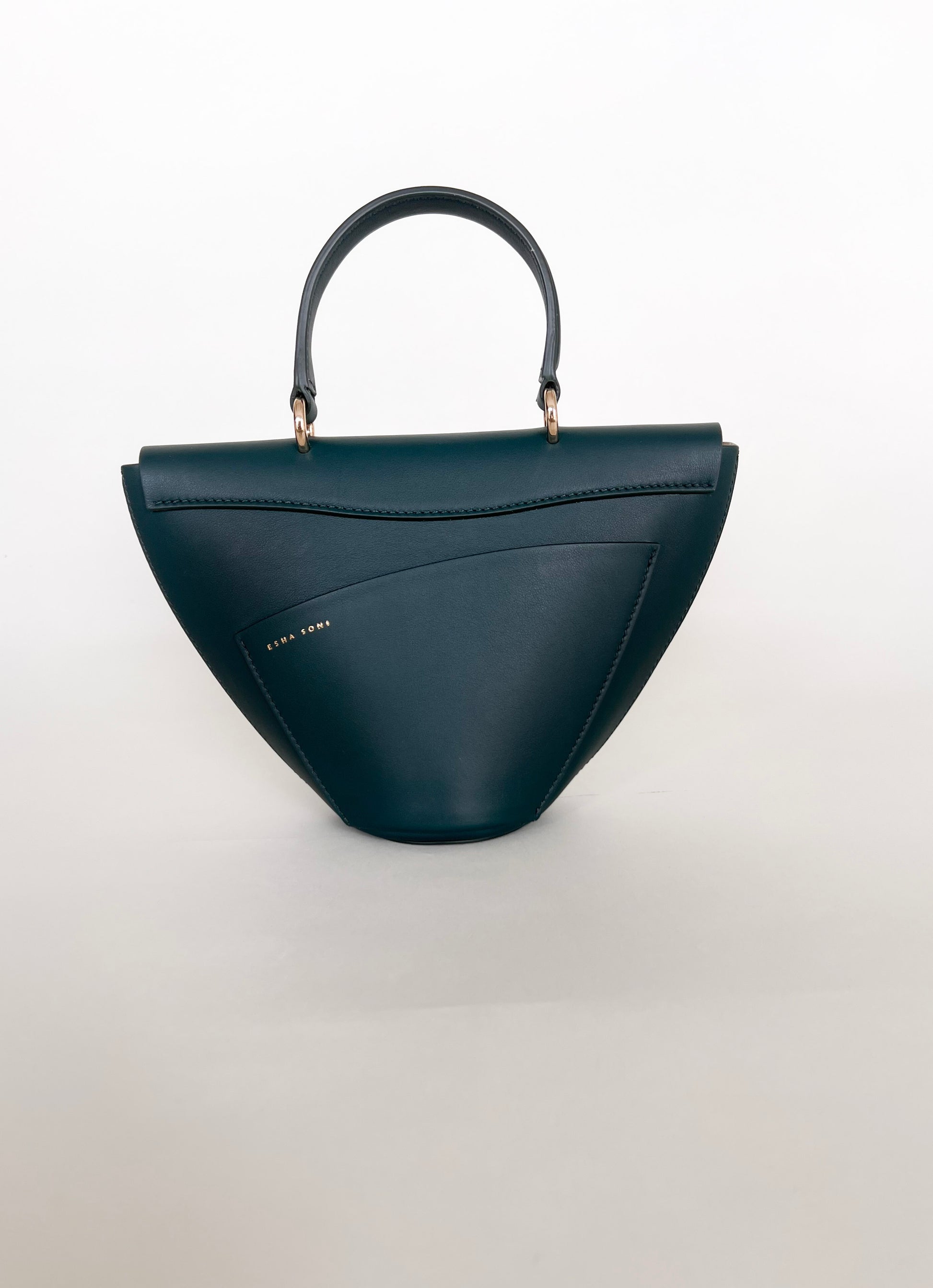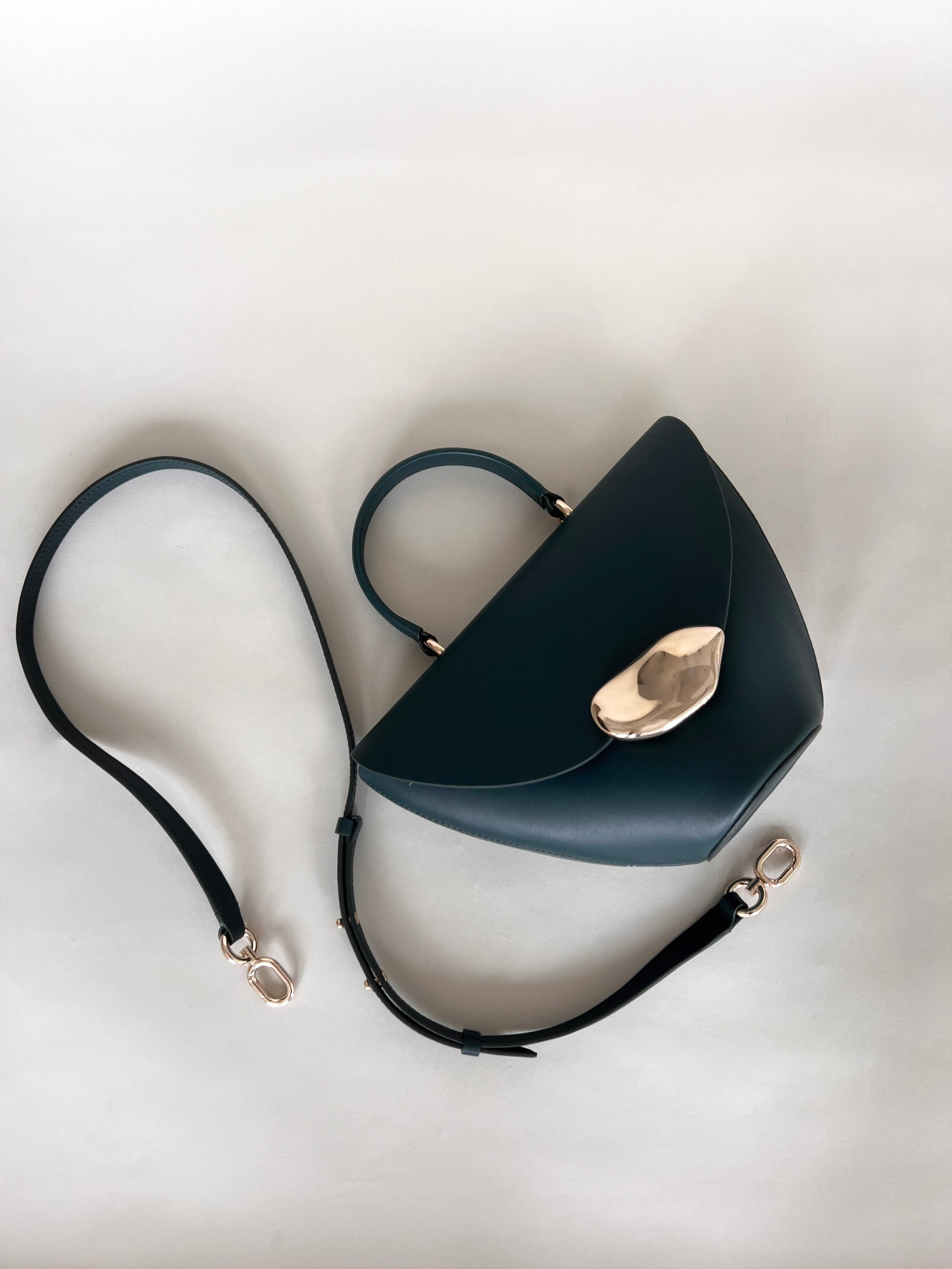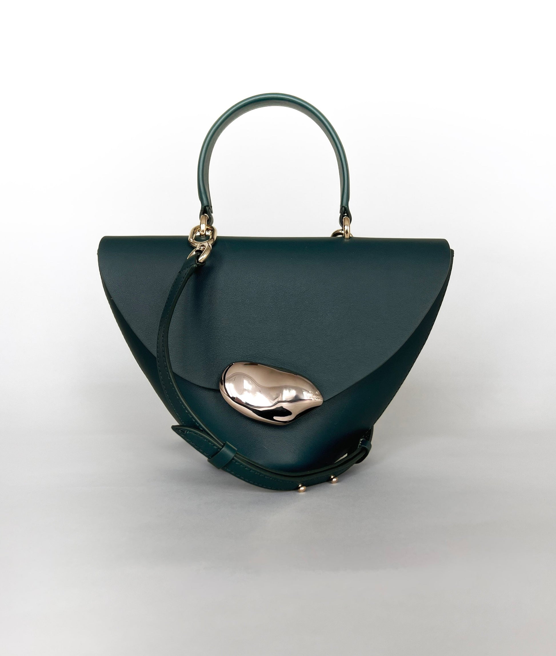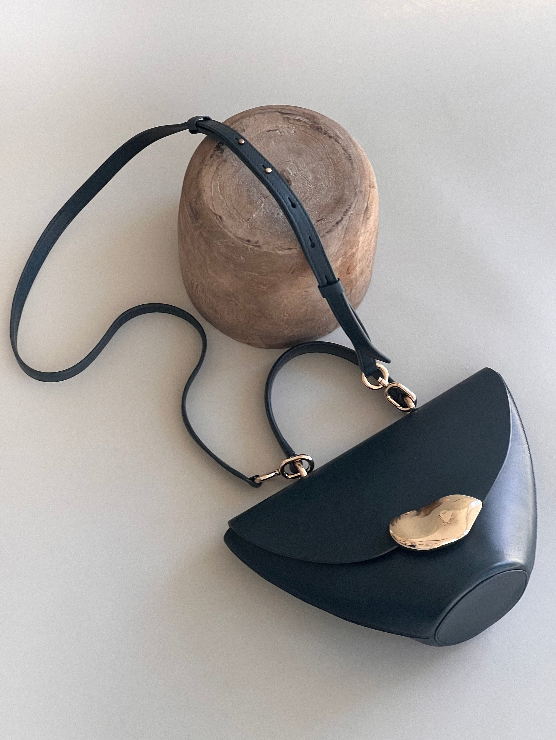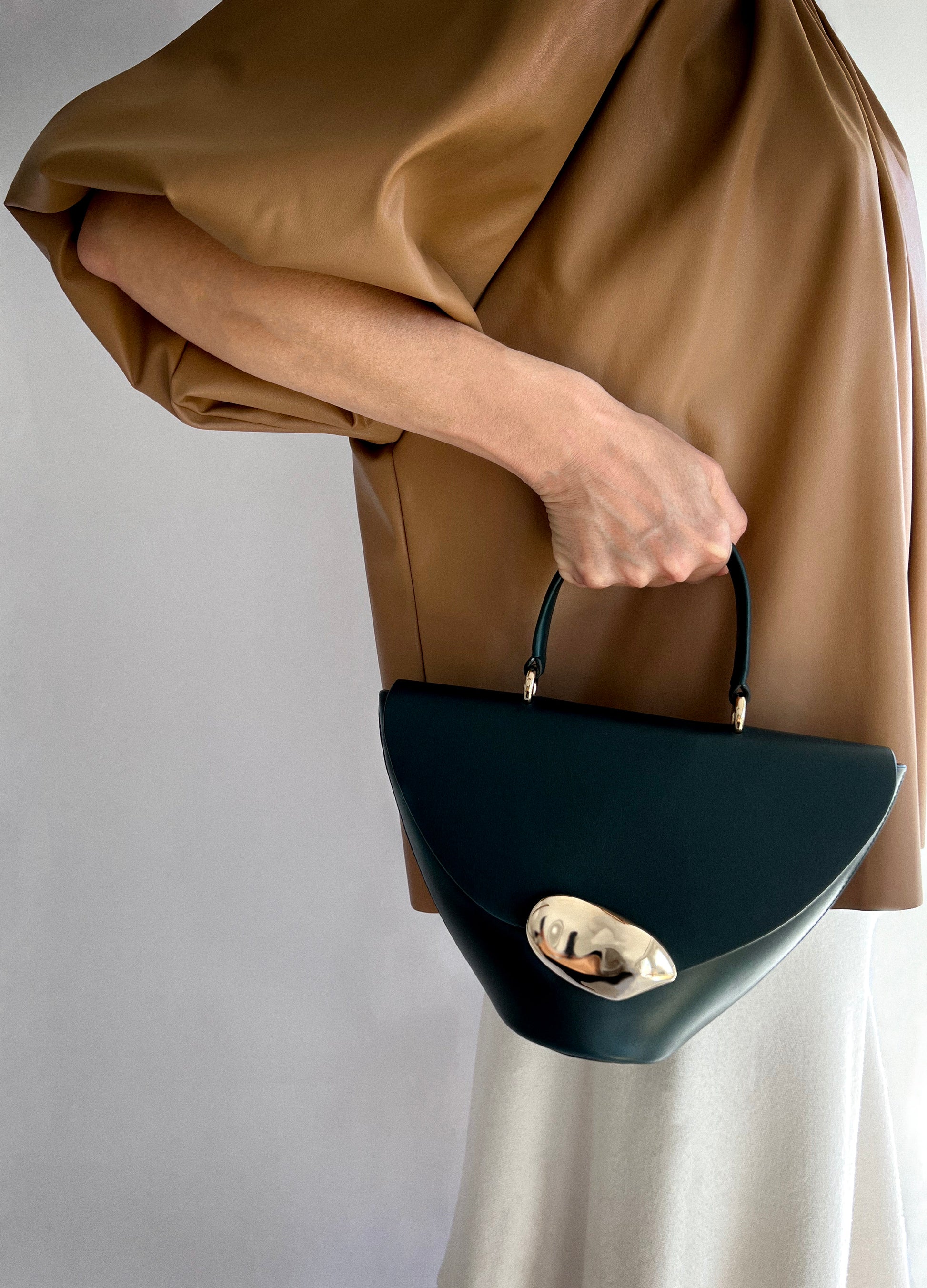 The Orb is a petit handbag featuring a circular base,curved body and rounded top flap. The elegant silhouette connects to a brass top handle and can also be worn effortlessly as a crossbody.The Orb is adorned with a sculptural,hand-carved brass object that functions as a closure.