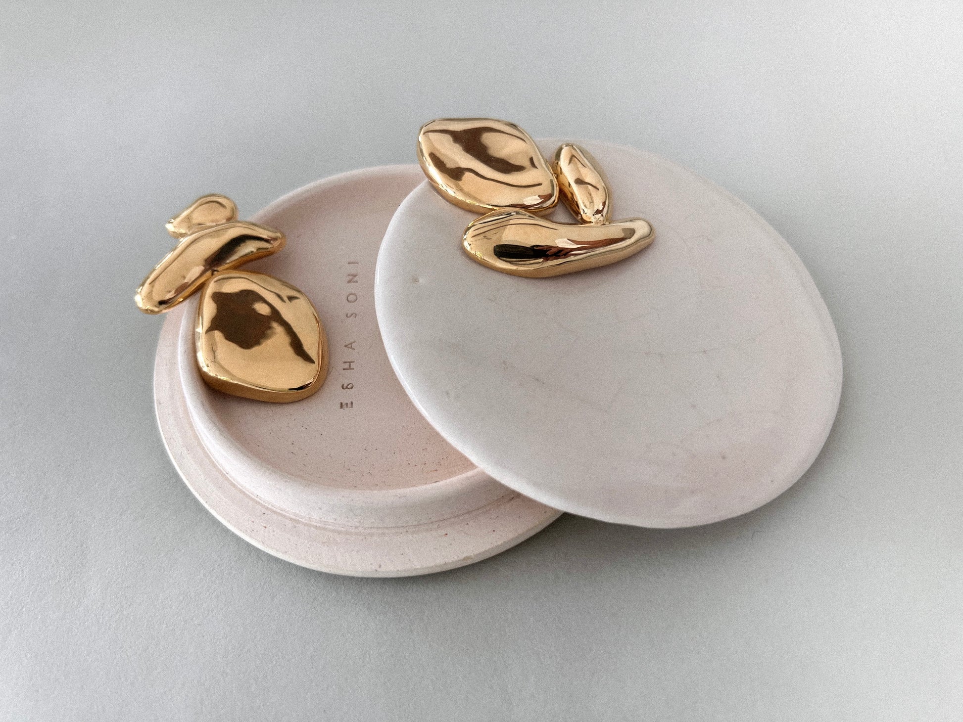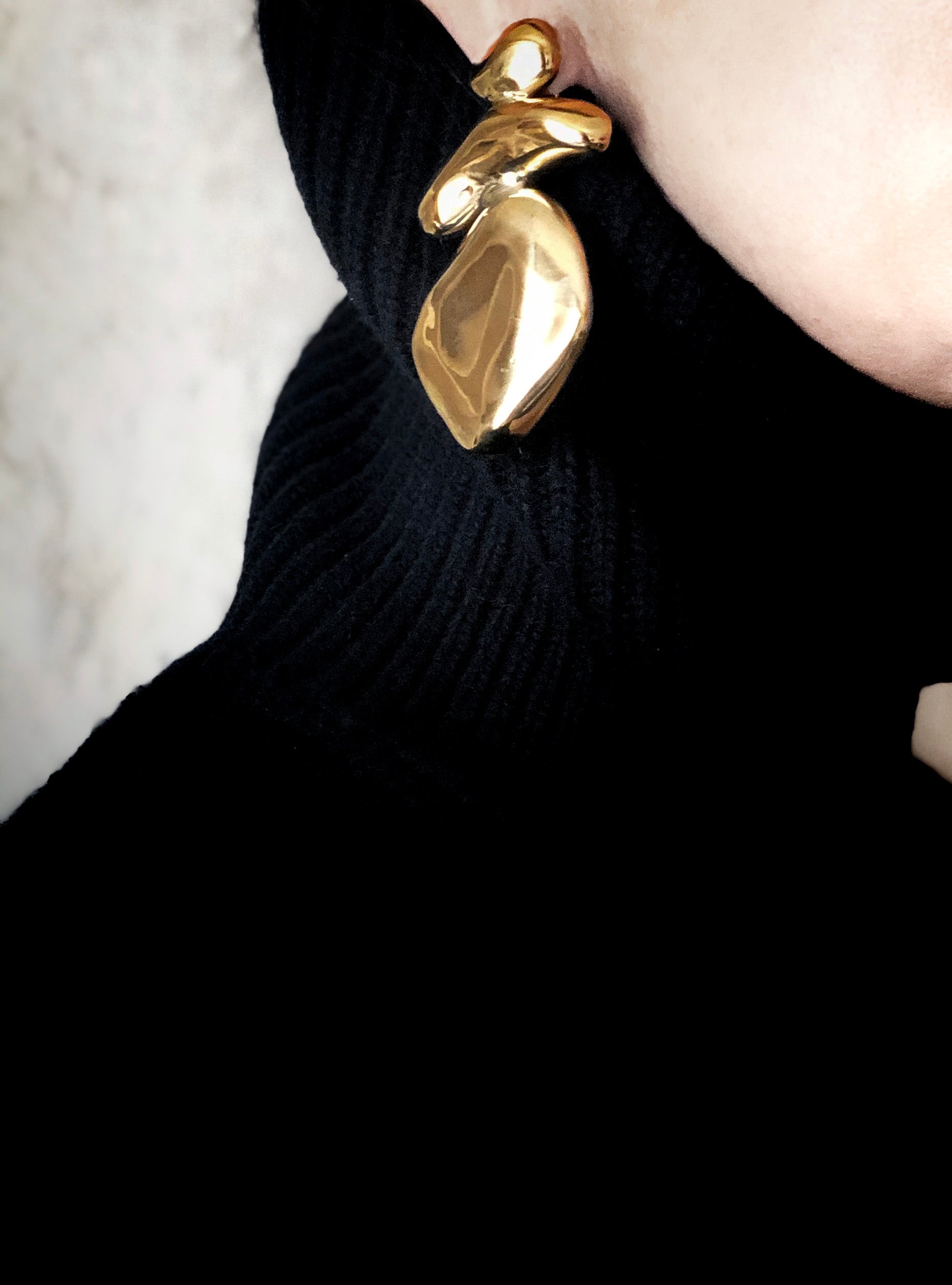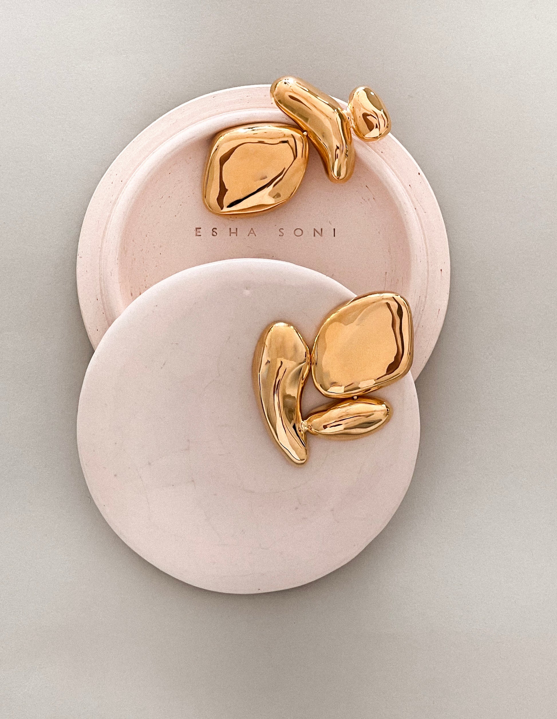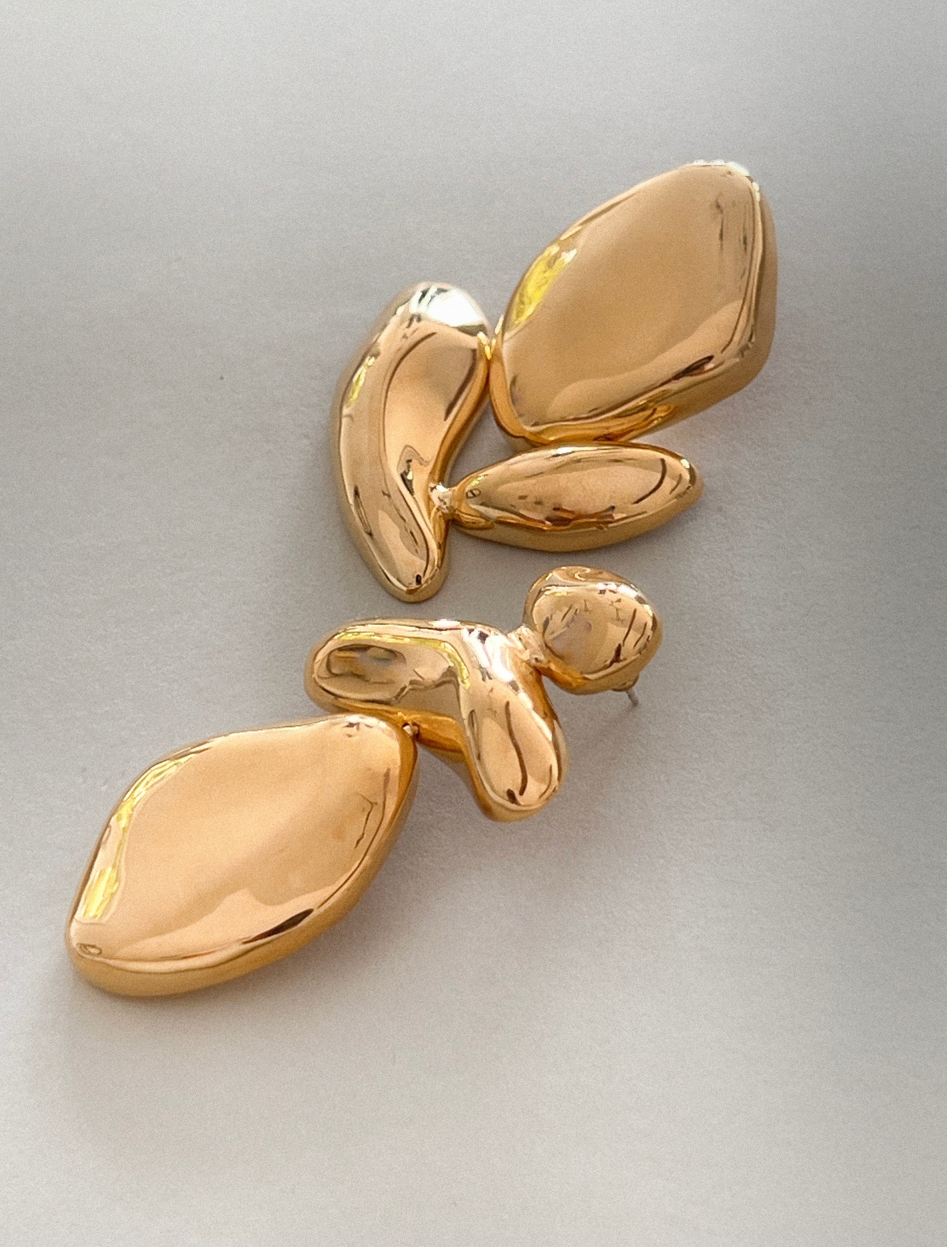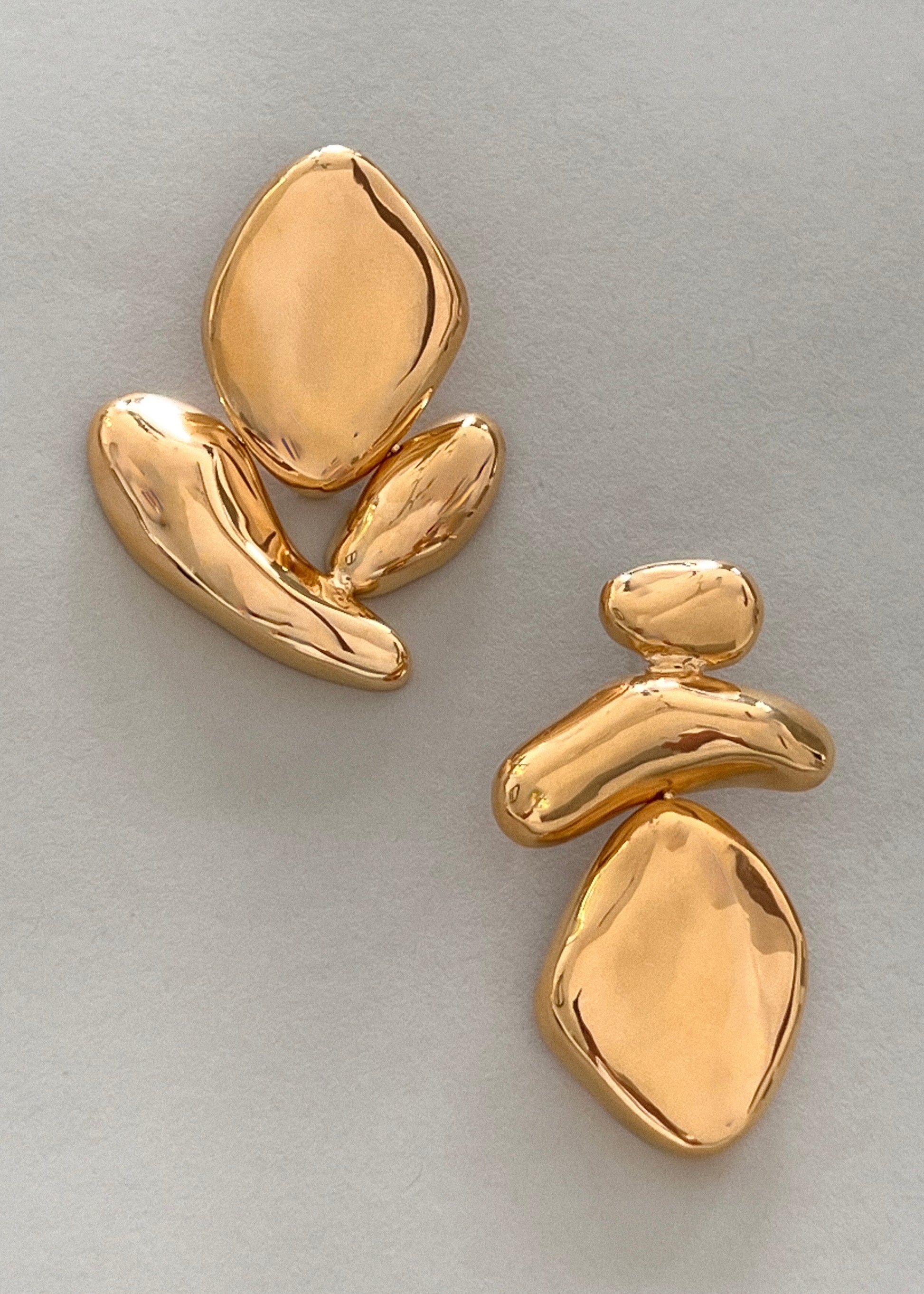 A cluster of organic shapes inspired by river rocks form an asymmetric pair of earrings that create a bold and stunning statement.