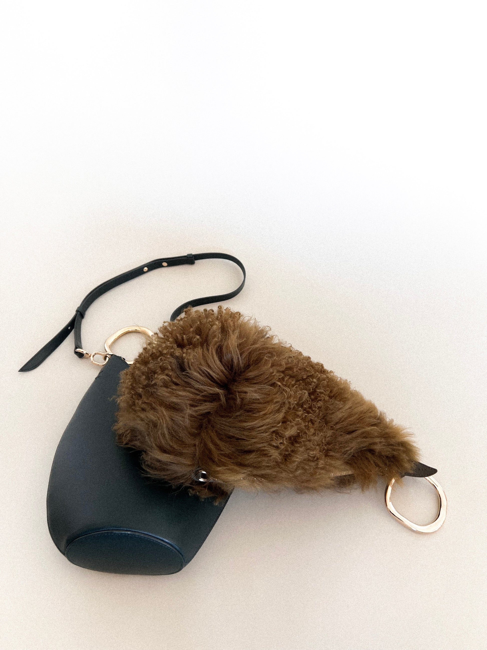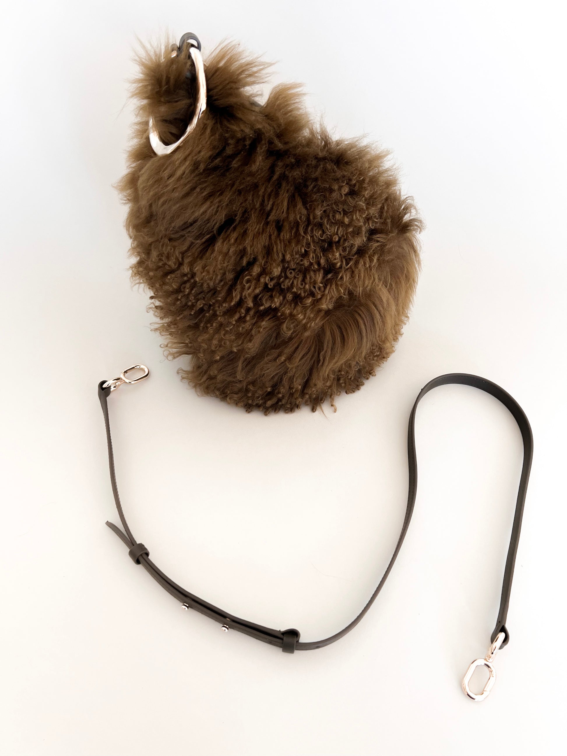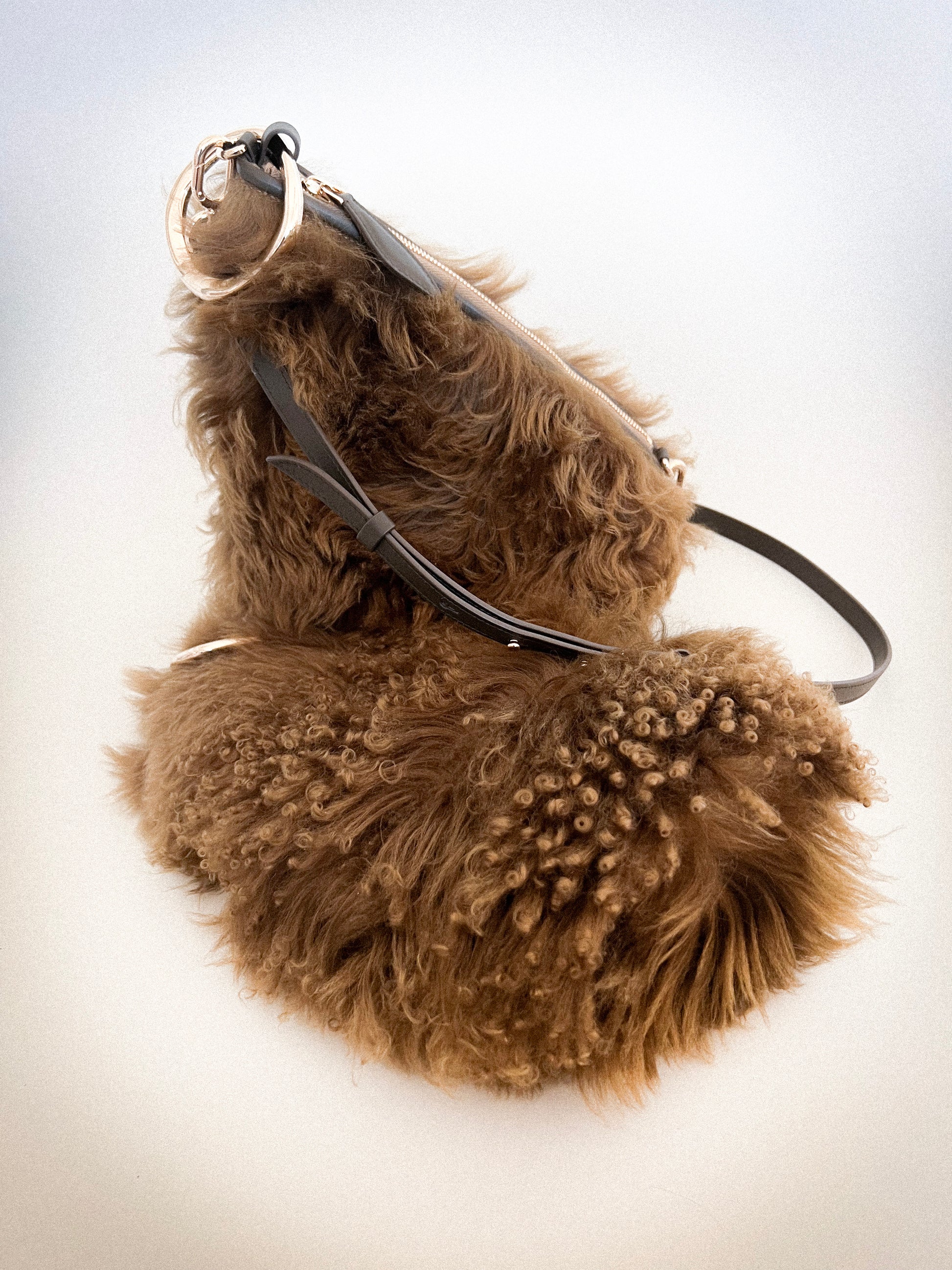 Make a statement with this cozy and luxurious shearling bag that can we worn on the wrist with the bangle or as a crossbody.